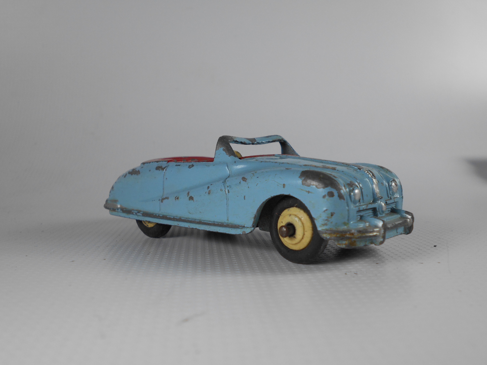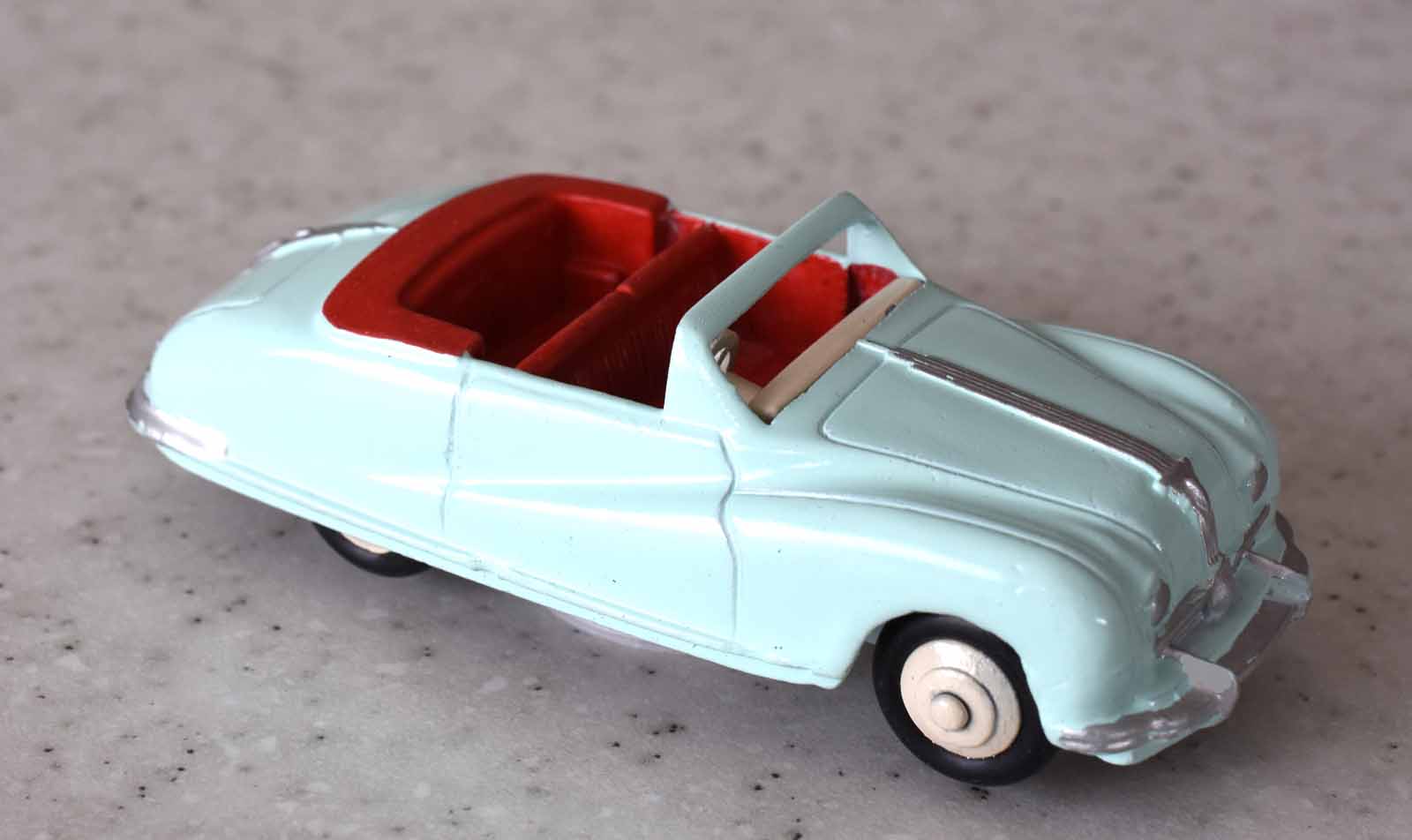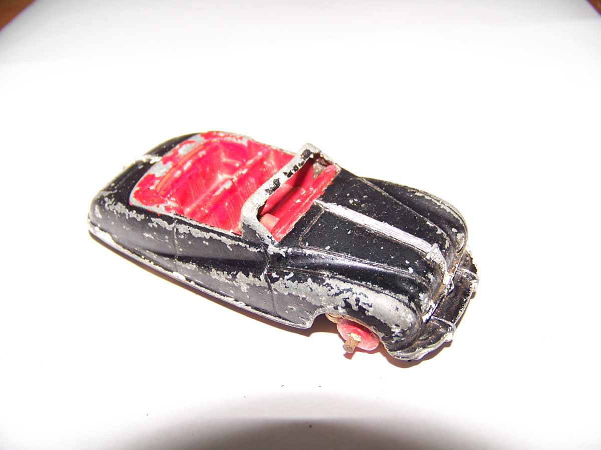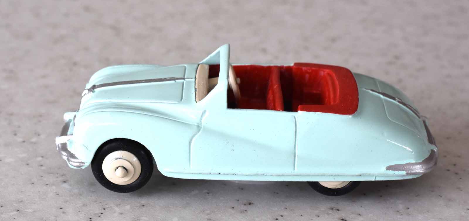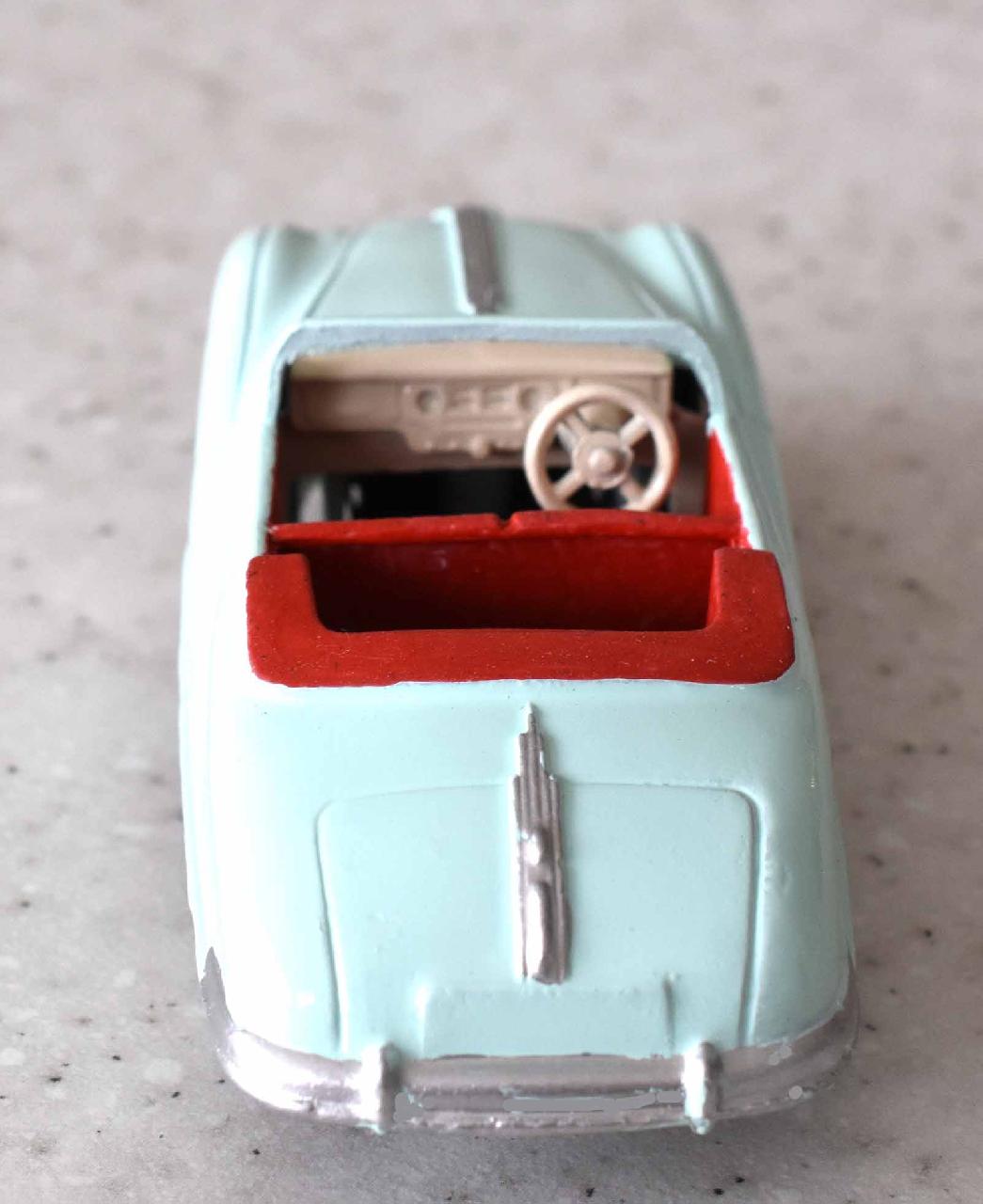 This model was badly over painted and windscreen frame bent. Once the paint had been stripped there was some chipping to the bodywork and casting marks. However the rest was quite sound and worthy of a restoration. The original colors were light blue, red trim and cream hubs. The one thing that I found interesting was the dashboard that was quite detailed and resembled the original model very well. My shaky hands show quite well on the detail work but a satisfactory result. PS Base plate to be finished with clear coat