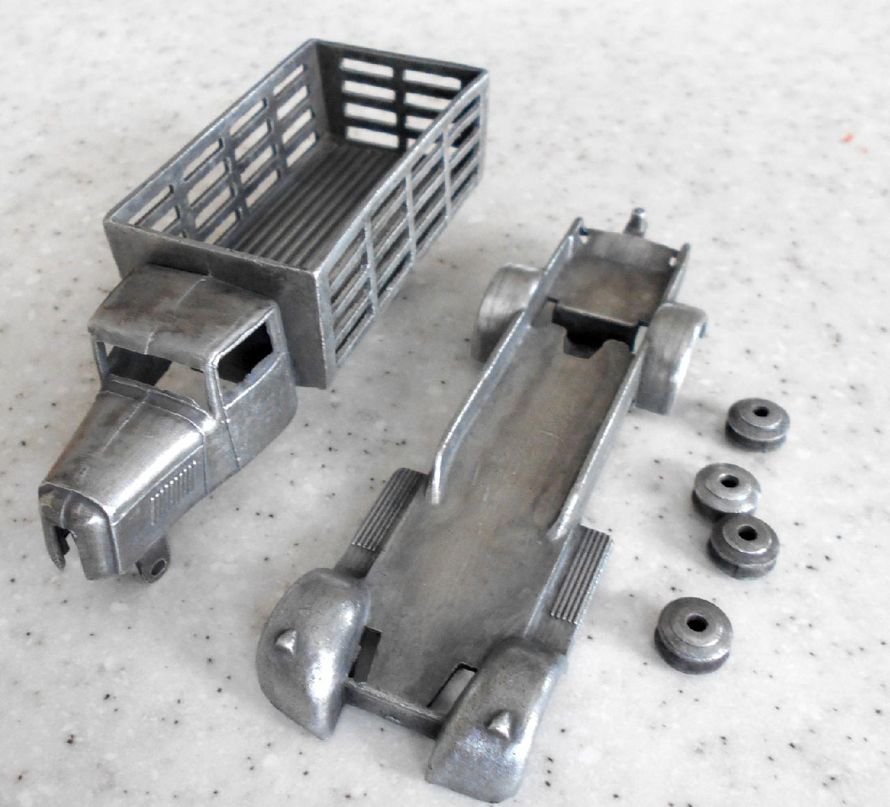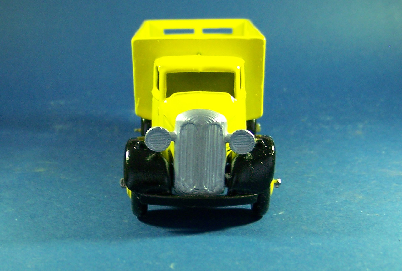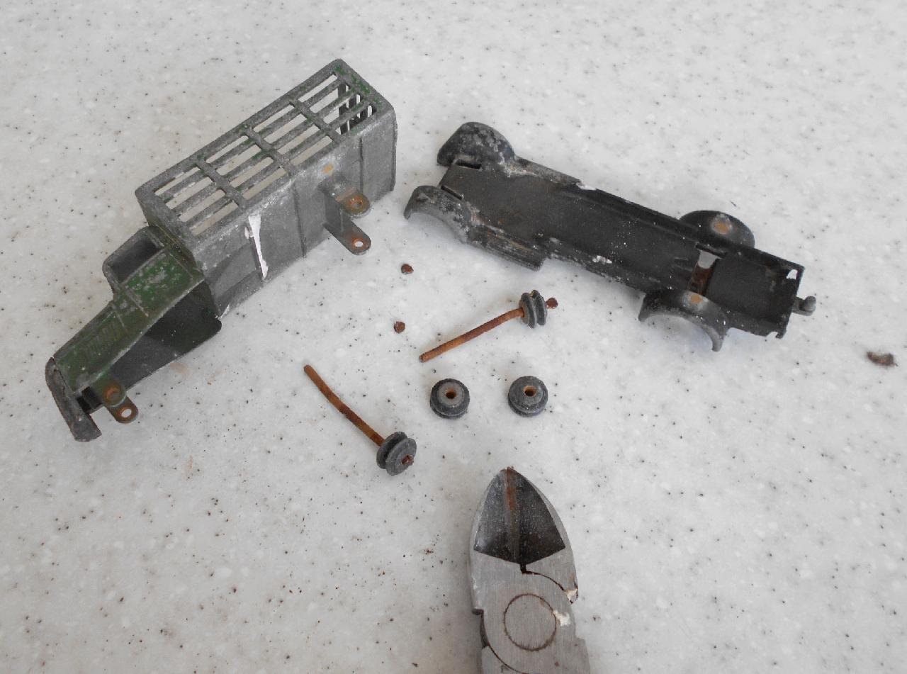 Badly corroded sides, broken grille. I am including the repair to the corrosion that was done using JB Weld KwickWeld, a steel reinforced epoxy. Great stuff for such repairs. Repainted, 3D printed grille, and new axles.