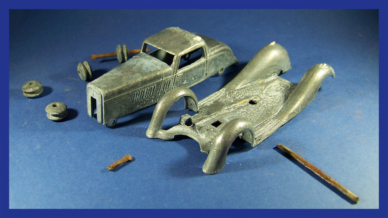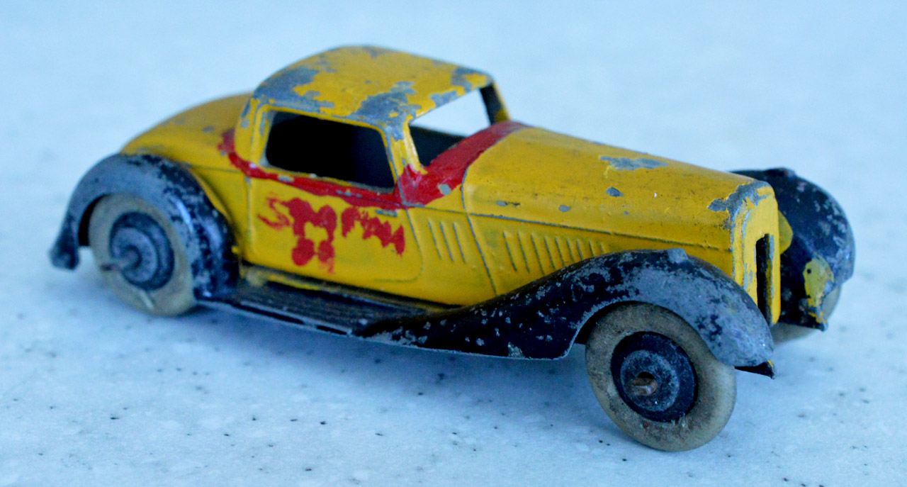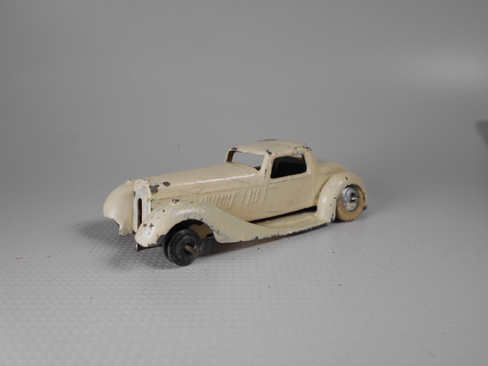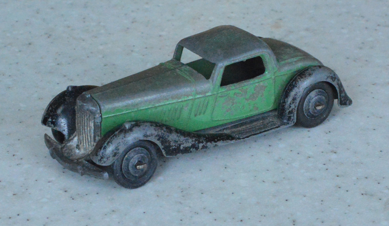 Overpainted missing radiator and headlamps, bent front fender, otherwise sound.