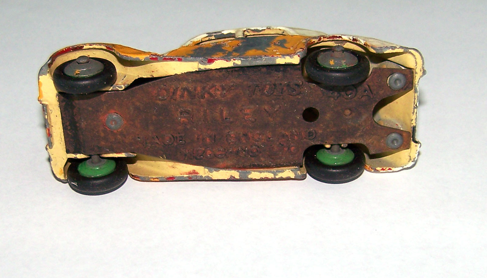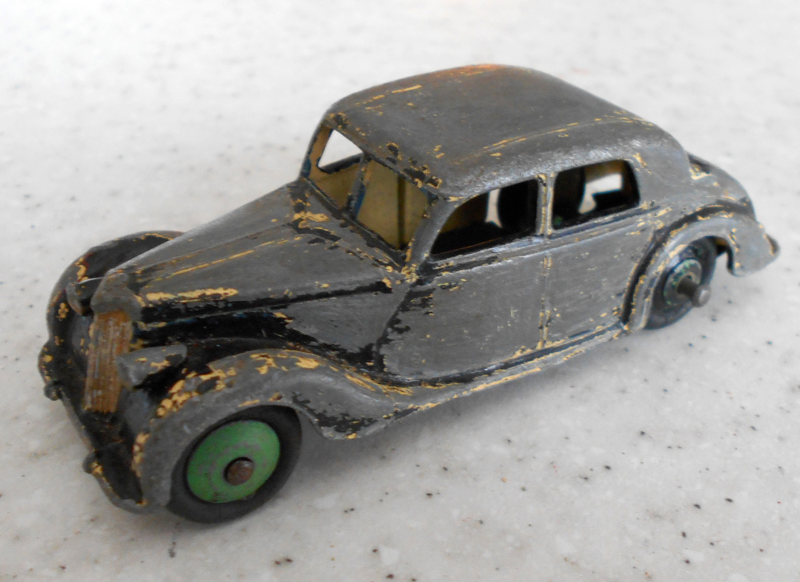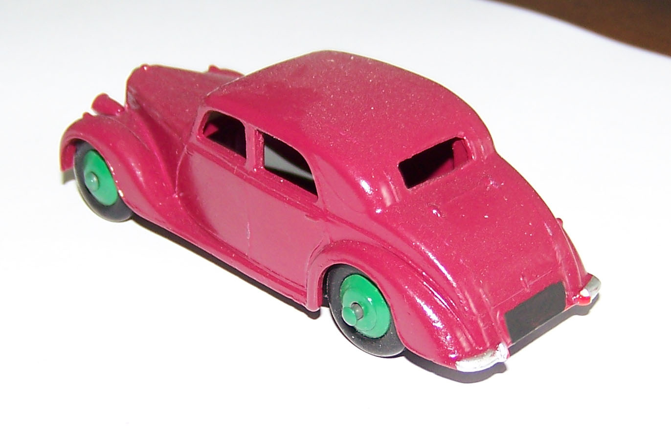 i guess this one was dipped in old paint, what a mess, but otherwise an intact model. Following the same routine of stripping repairing and re-spraying I decided to finish this in burgundy. I already have one in the standard cream finish and if it ever were necessary to revert back to the original color it would be easy to do so. I think the new color to be quite a good choice for this particular model. Made by Dinky 1947-1960 this one 1950-1952.