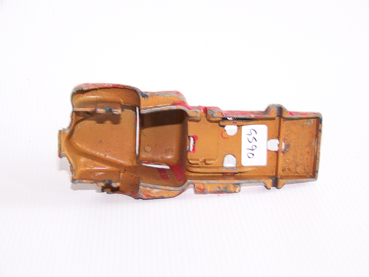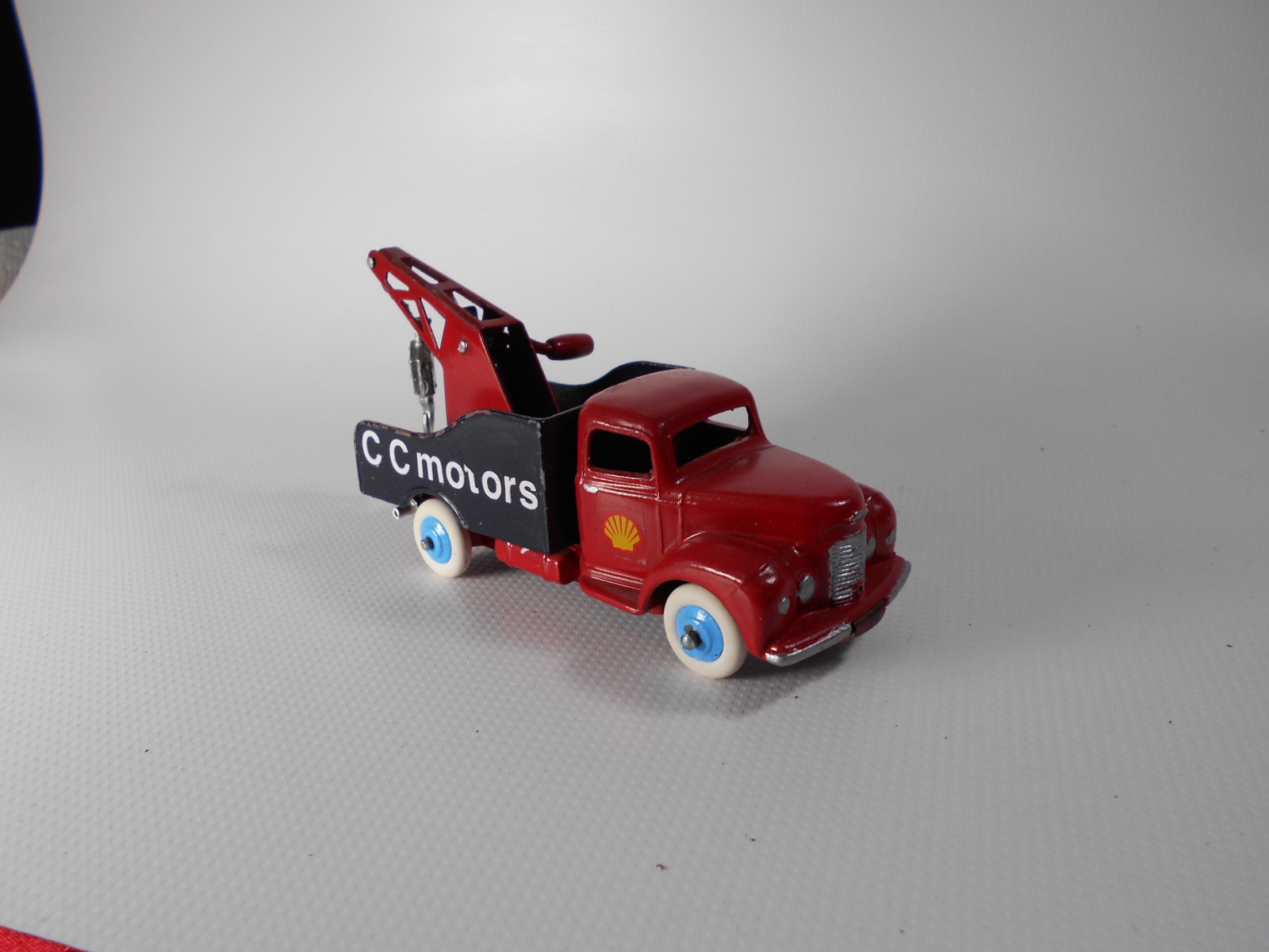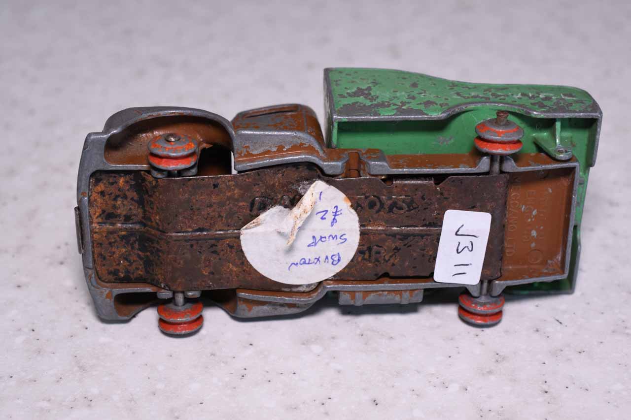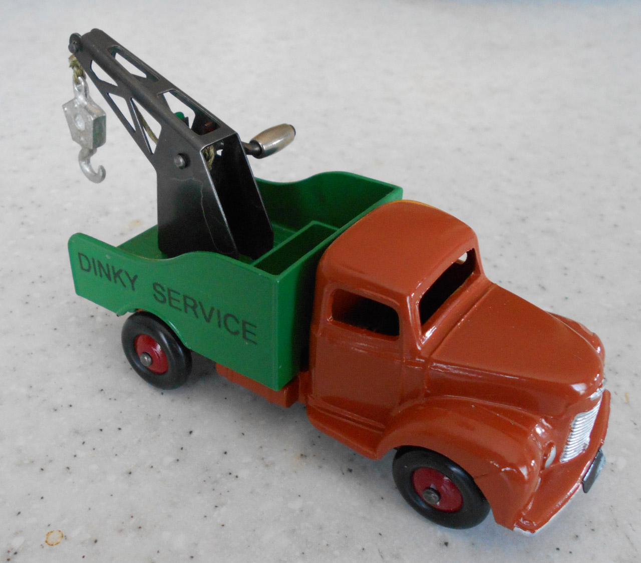 A lengthy overhaul of a badly overpainted commer breakdown lorry. The model was complete except for the hook and the string was rotted. Strip down was quite straightforward with just the deck hinge needing to be cut. Once the deck is off tabs need to be opened to release the chassis. All resprayed in need original colors and the winder retaining spring retensioned. A new decal was created and added either side. Also a box.