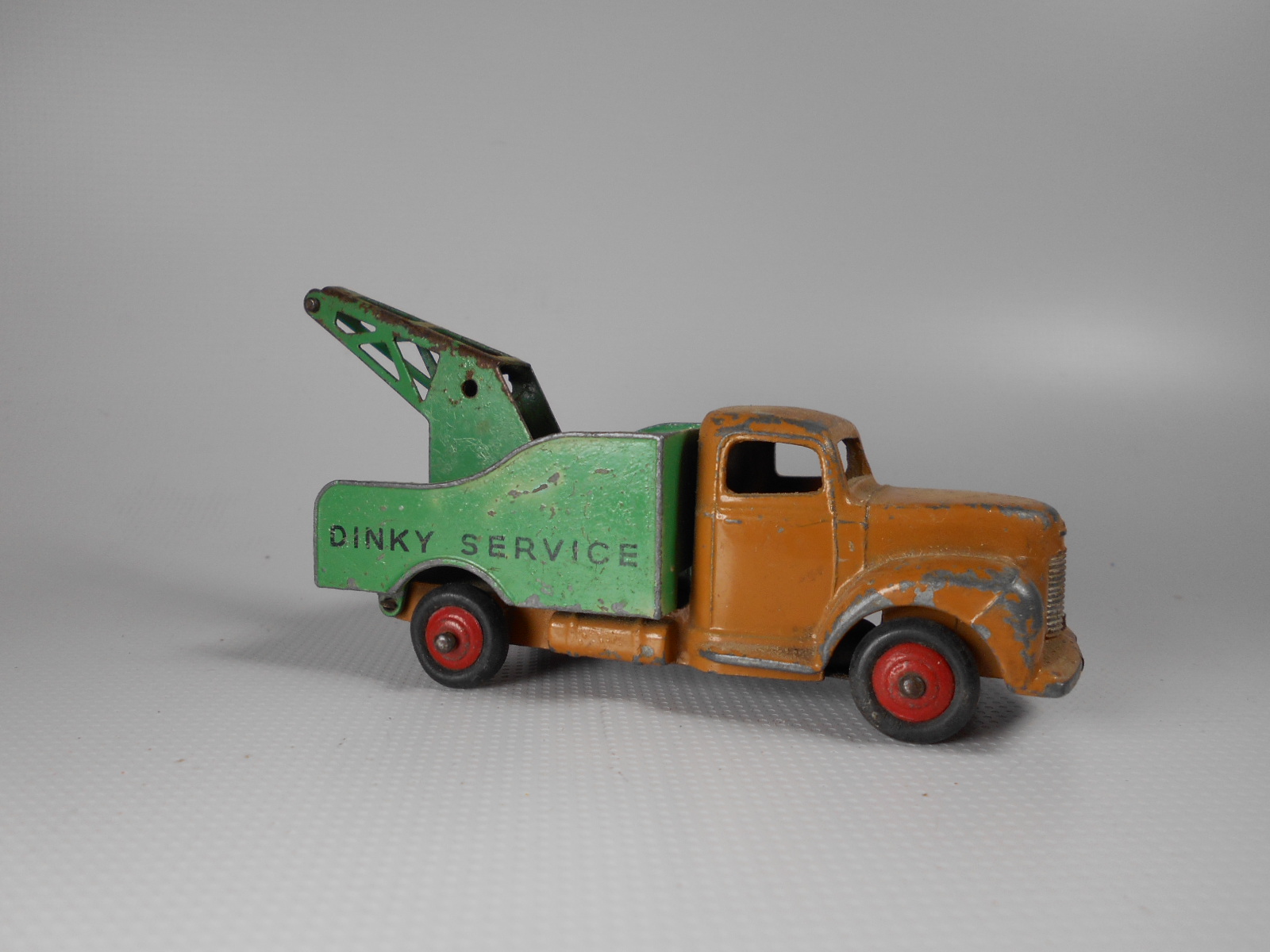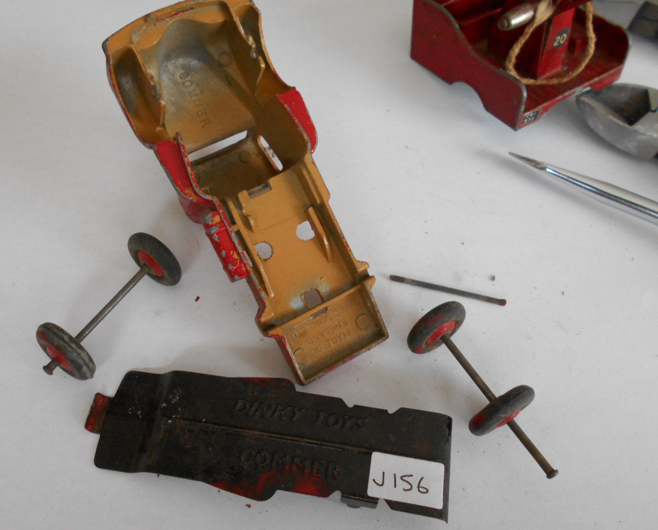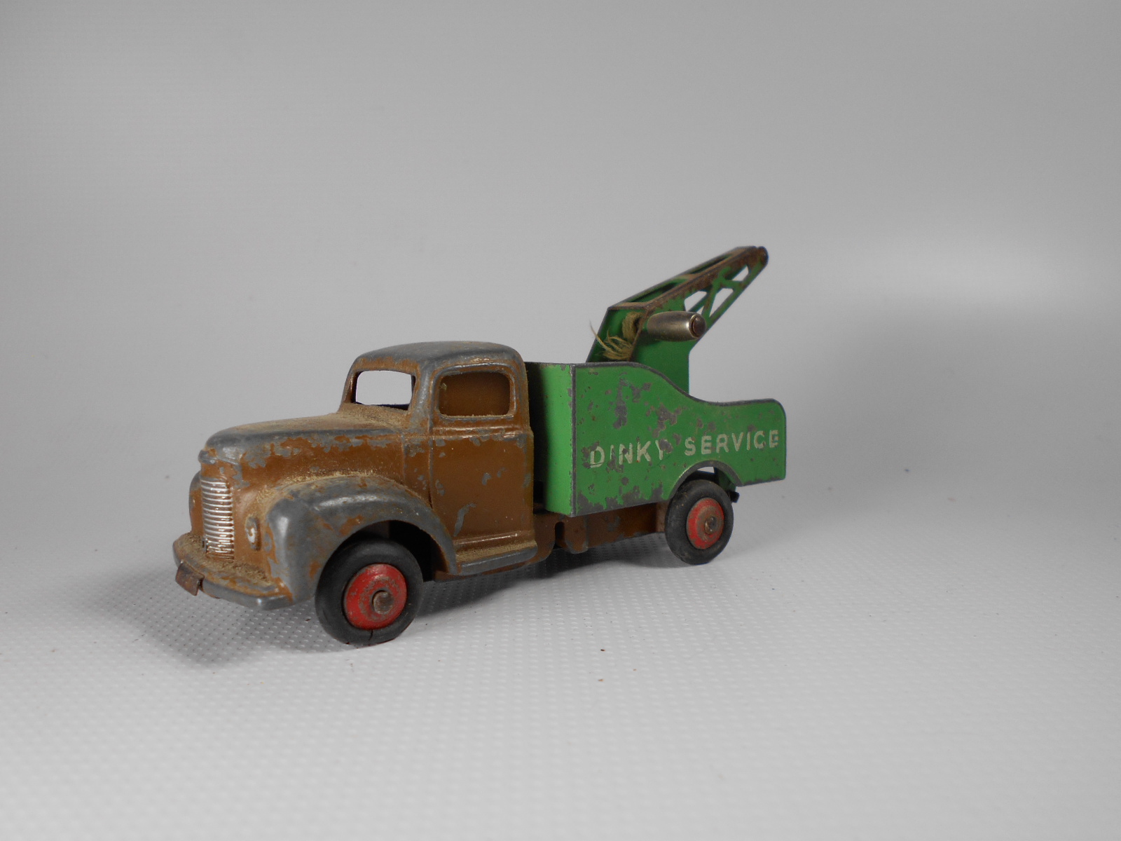A lengthy overhaul of a badly overpainted commer breakdown lorry. The model was complete except for the hook and the string was rotted. Strip down was quite straightforward with just the deck hinge needing to be cut. Once the deck is off tabs need to be opened to release the chassis. All resprayed in need original colors and the winder retaining spring retensioned. A new decal was created and added either side. Also a box.
