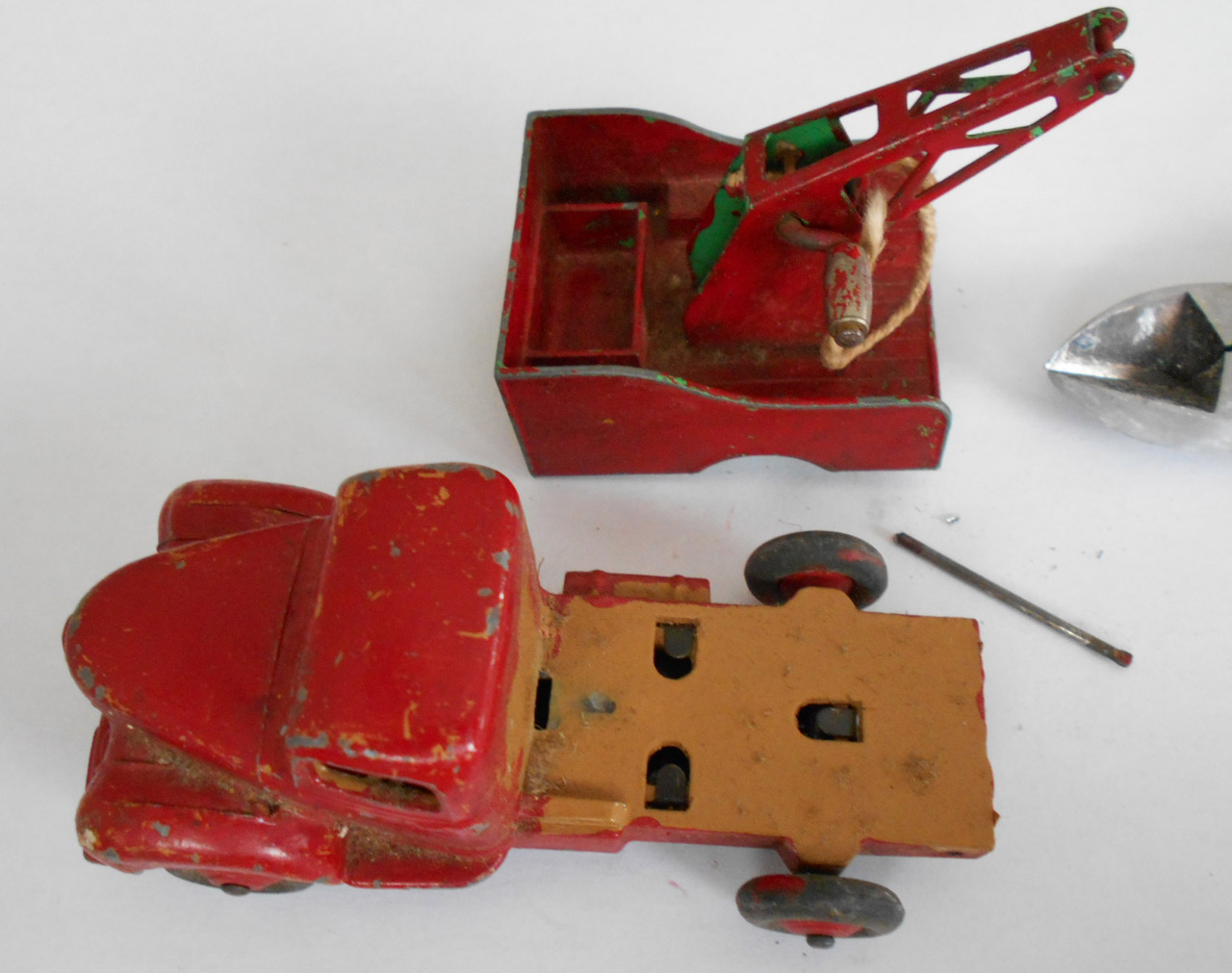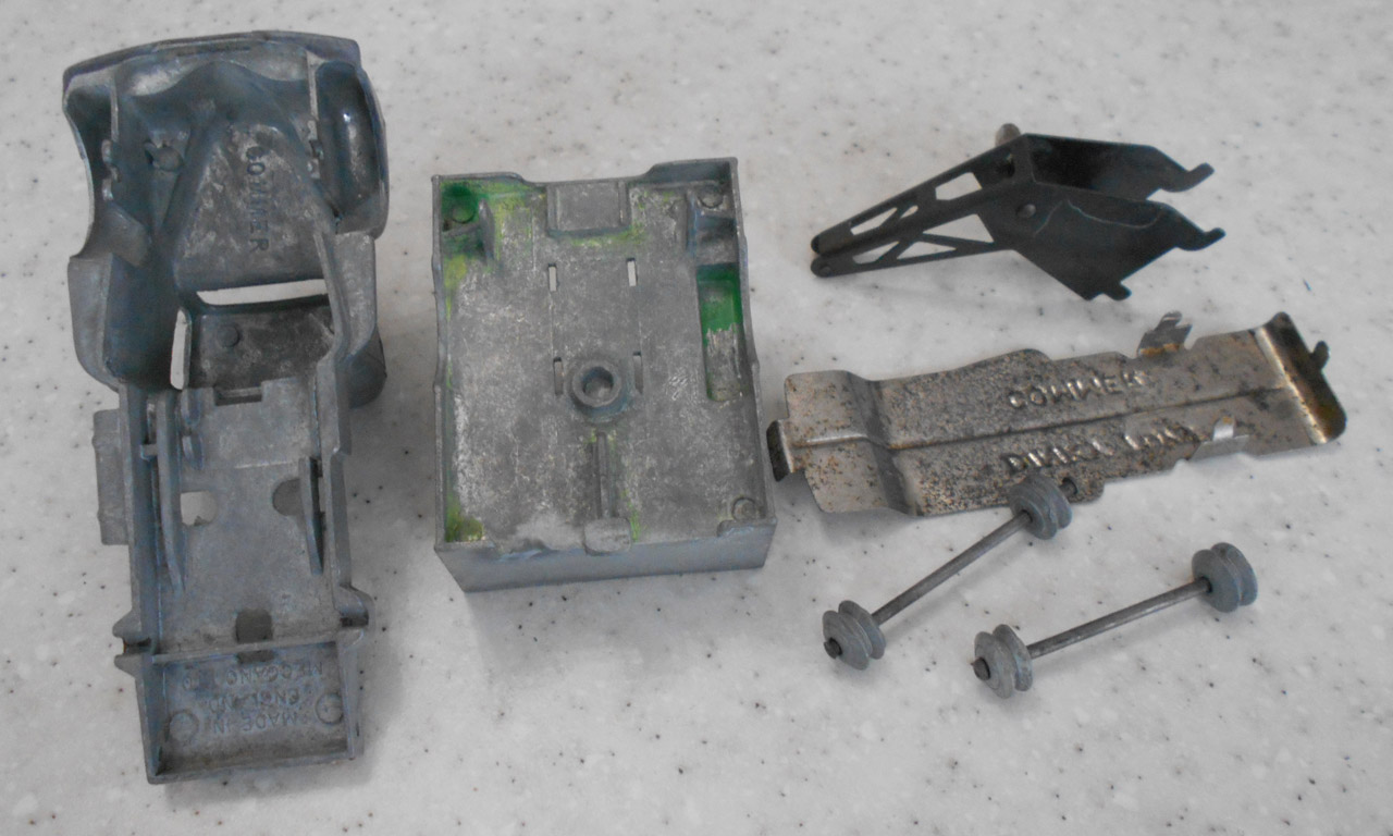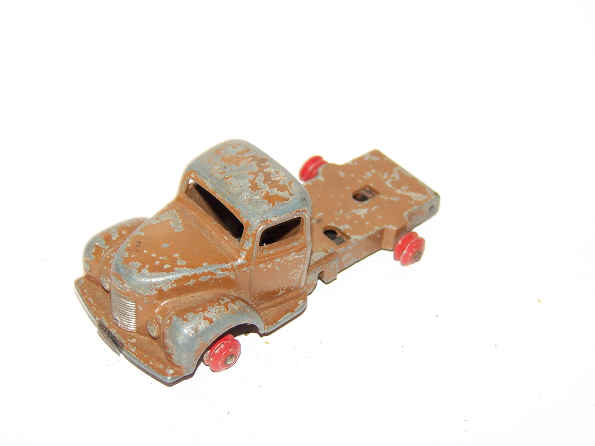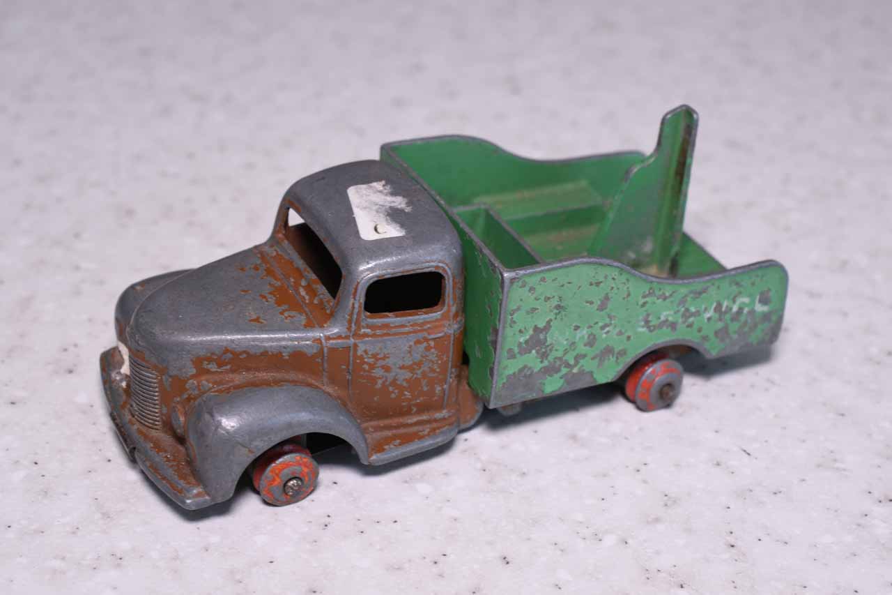 A lengthy overhaul of a badly overpainted commer breakdown lorry. The model was complete except for the hook and the string was rotted. Strip down was quite straightforward with just the deck hinge needing to be cut. Once the deck is off tabs need to be opened to release the chassis. All resprayed in need original colors and the winder retaining spring retensioned. A new decal was created and added either side. Also a box.