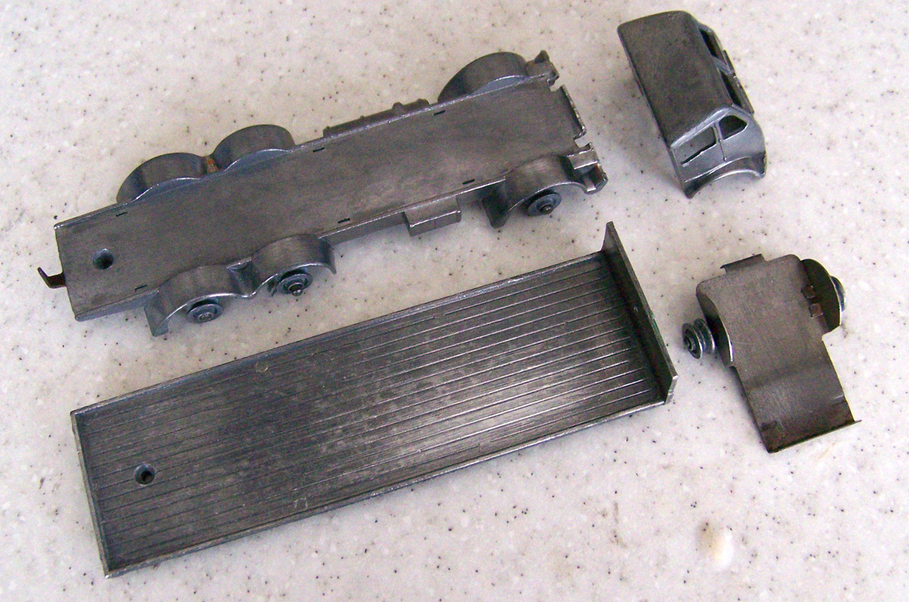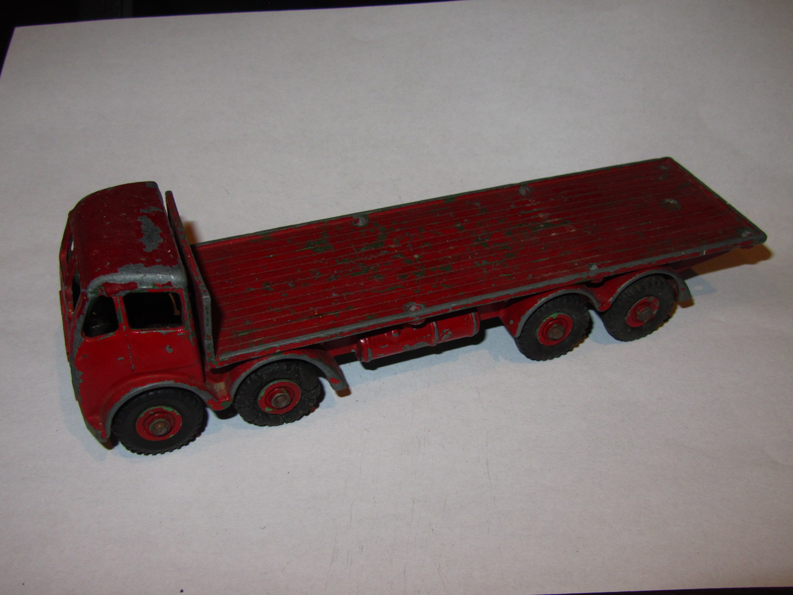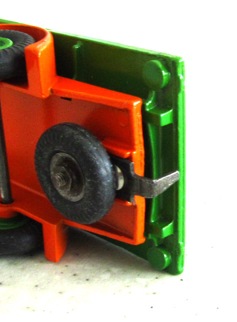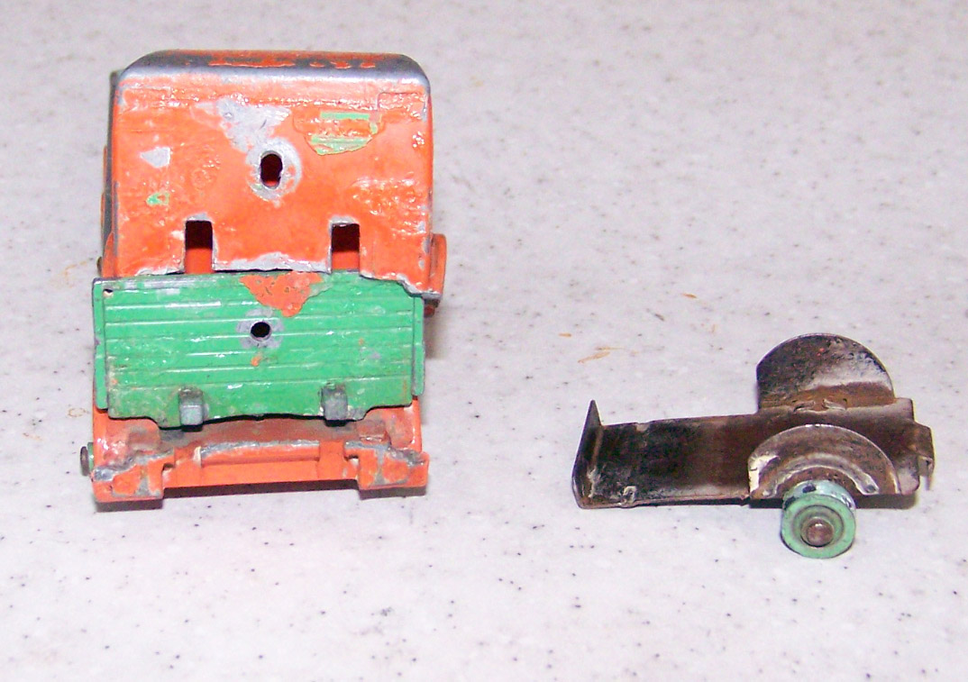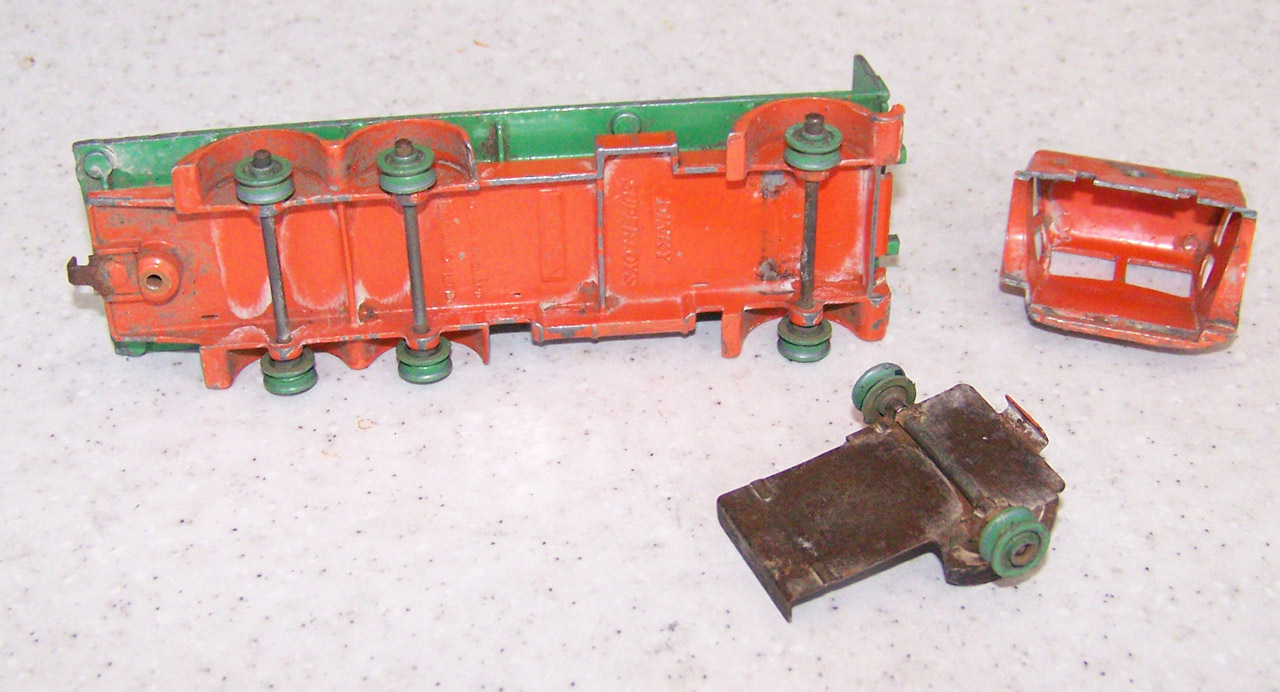 Broken Cab and poor repair, the cab was one time screwed and glued to the tailboard. Fender left side broken. A slight bend to one window pillar and tailboard header bent back, probably when the model was broken and cab separated from the chassis.