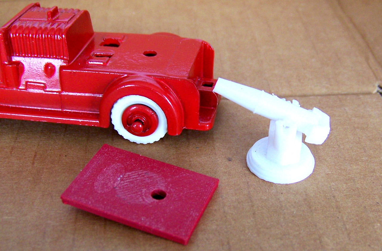One wonders if restoration is worth it. It is only a Tootsietoy. Well I will have a go and made it worthwhile. Strip and respray without a problem. I created a 3D pump on a swivel, not an exact match but look good. The original did not cover the ladder holes so I created a base to cover them.