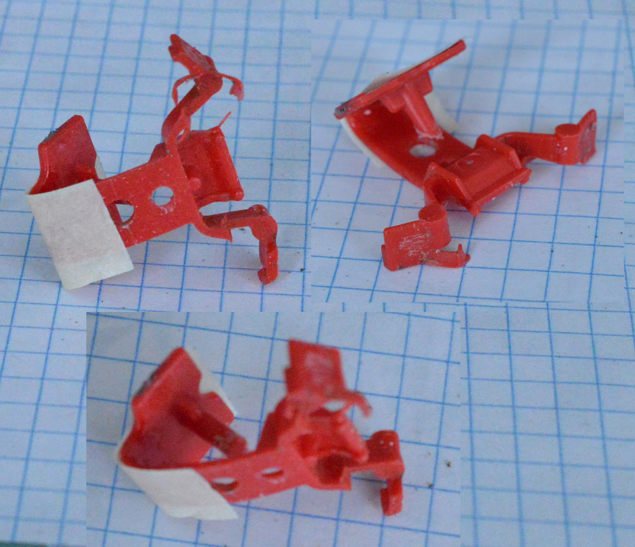 The strip-down revealed some damage to the plastic suspension units. They need to be removed by carefully drilling away the lugs. They was repaired by reinforcing with tape while adding a little super glue and allowing it to cure overnight. The tape was removed afterwards. Refitting them does not seem to require anything more than placing them back in position as they seem to be held by the other components.