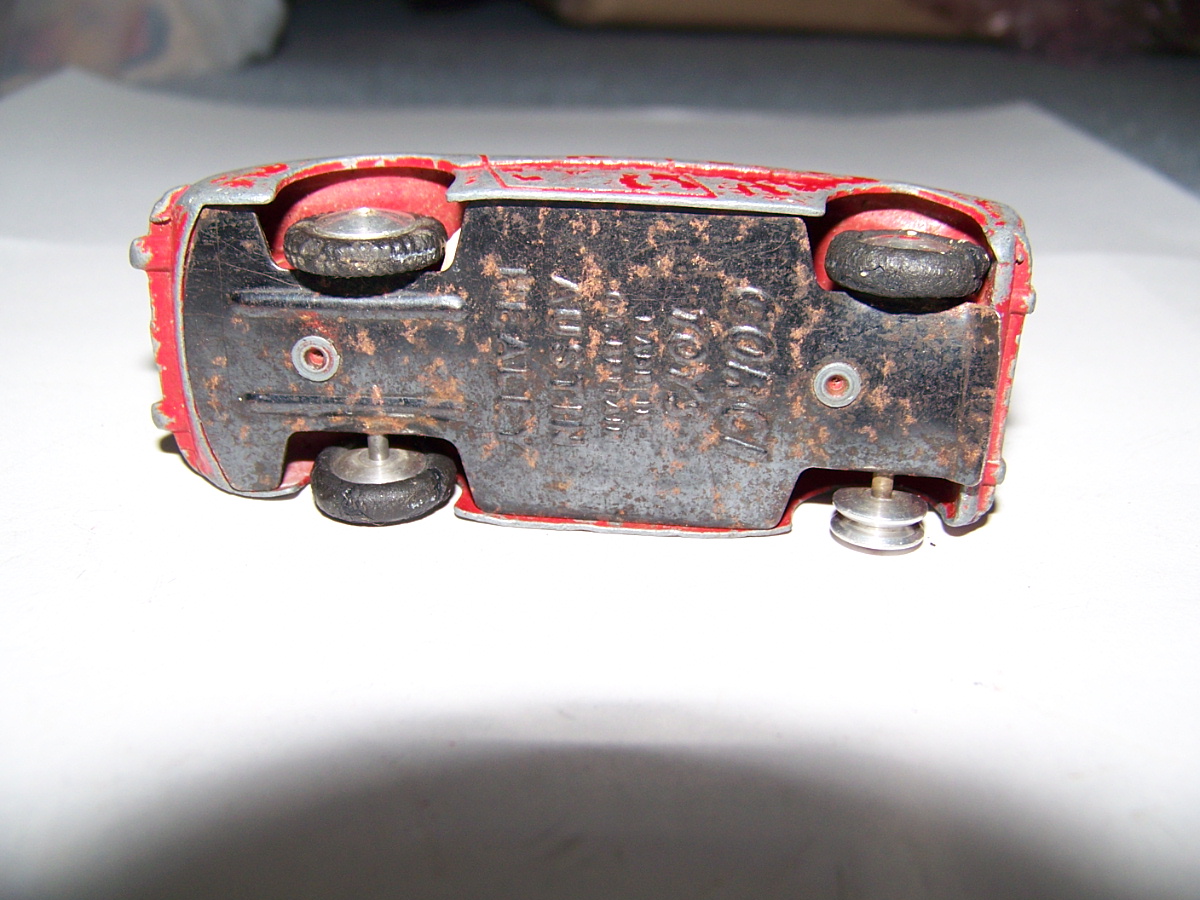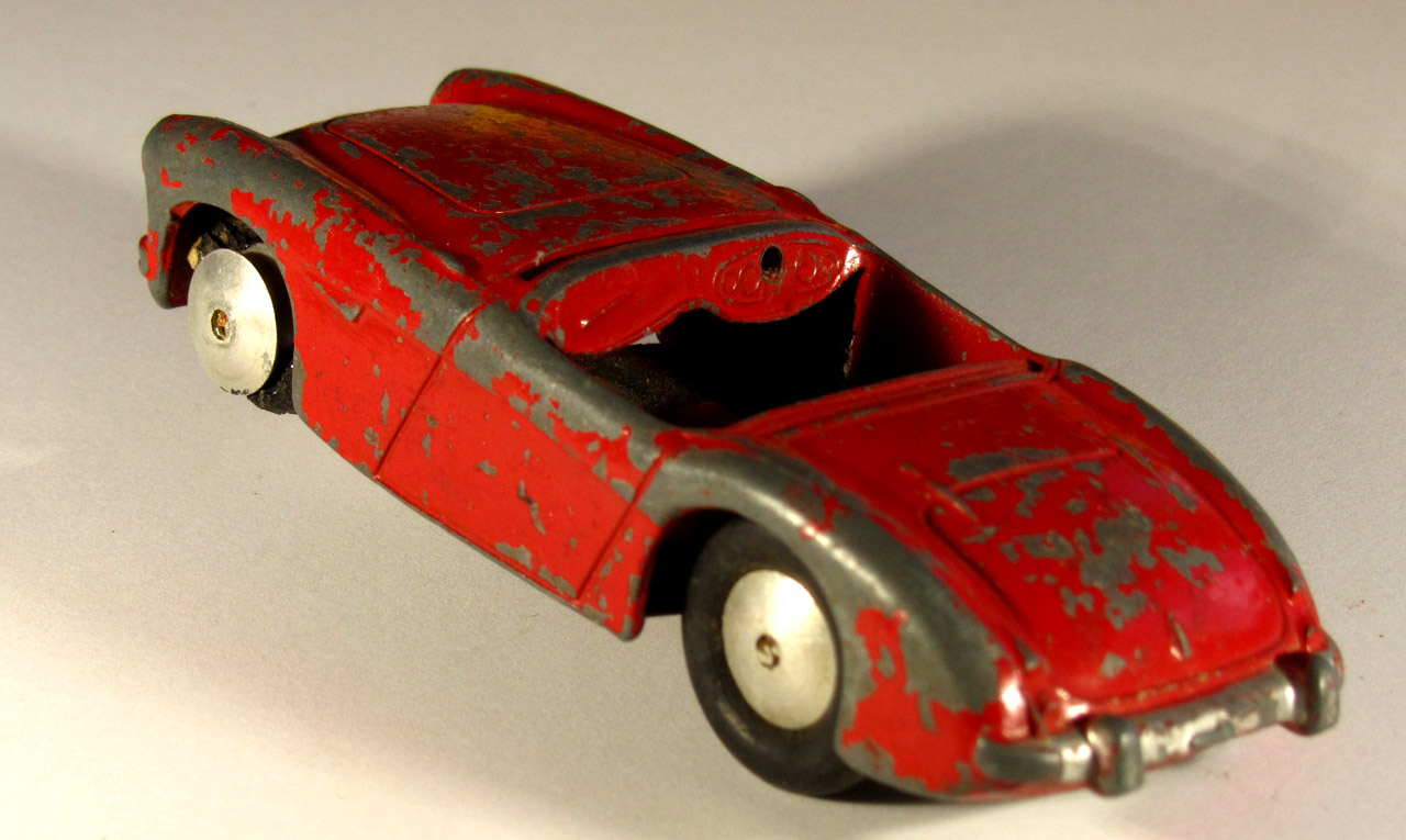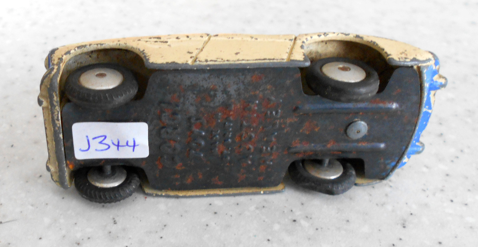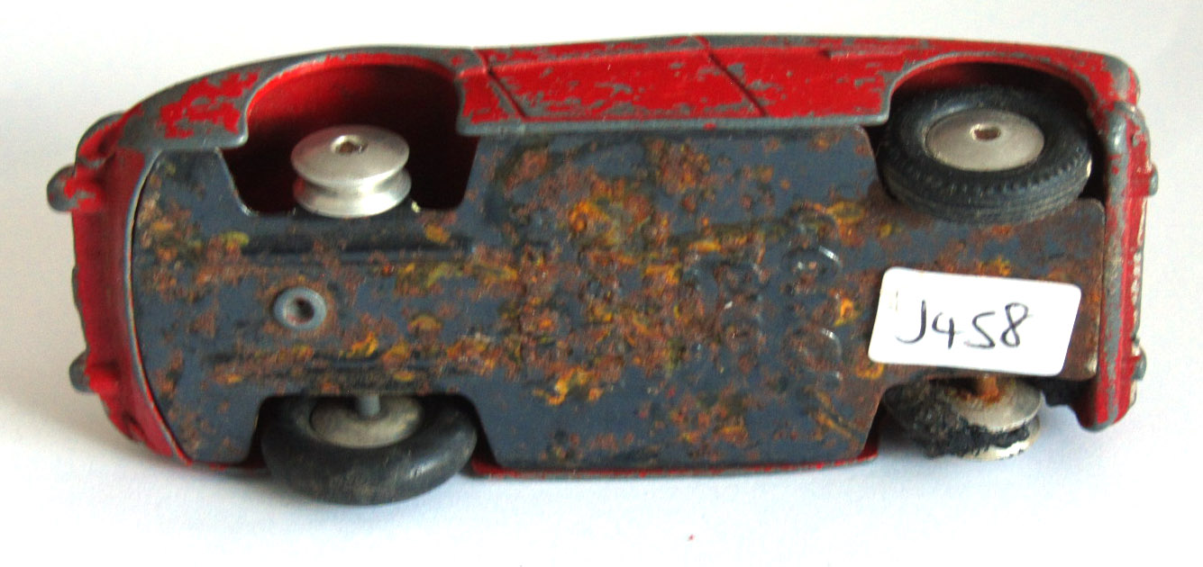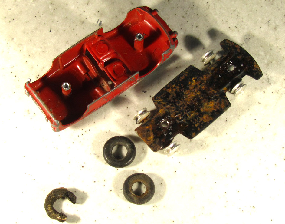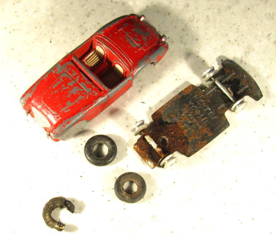 A little worse for wear. Badly chipped paint, rusty chassis and axles, missing tires, no steering wheel or windscreen.