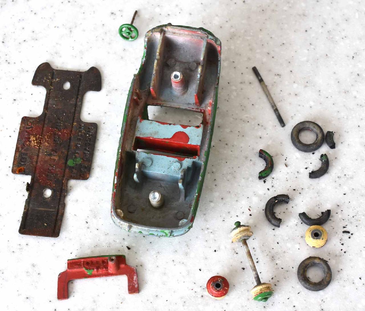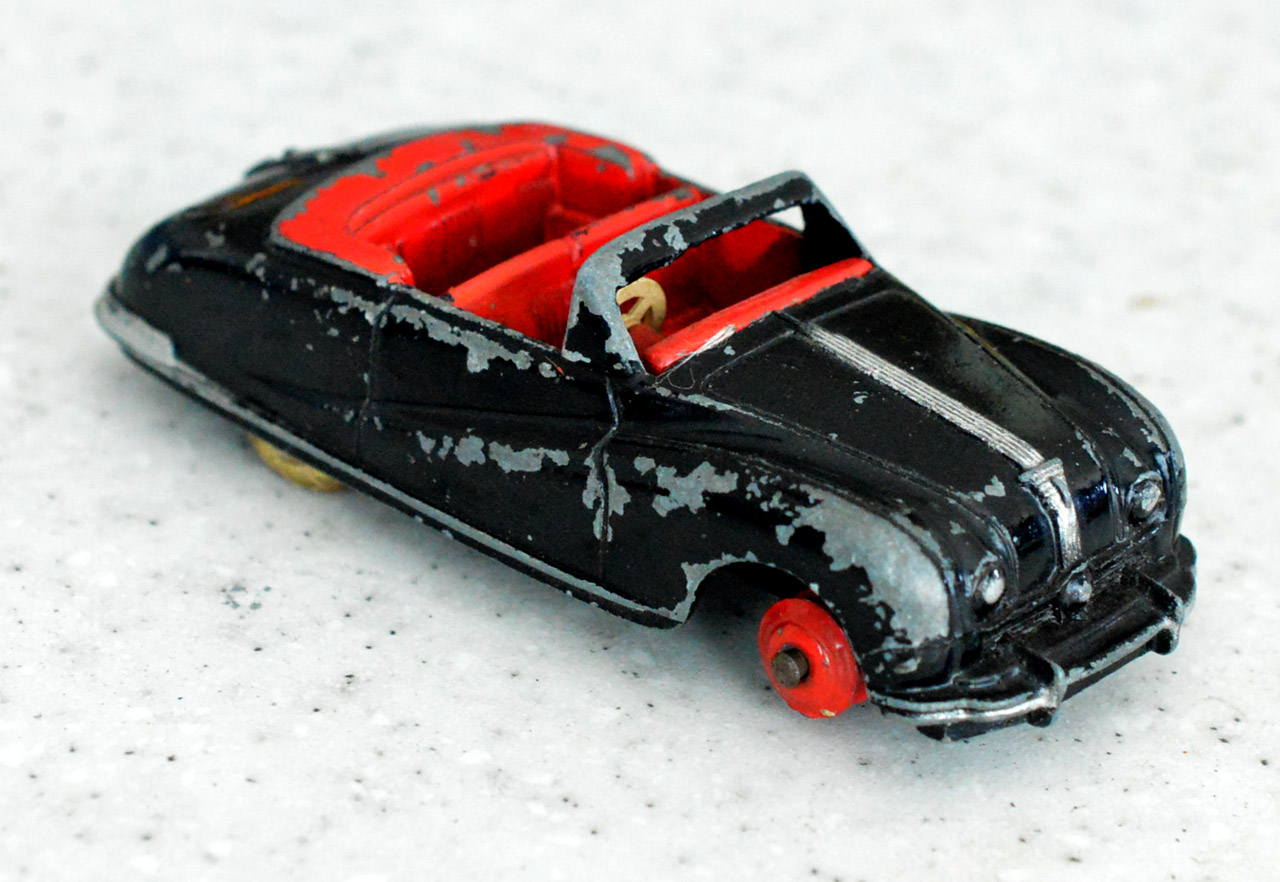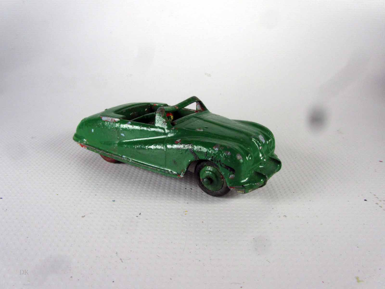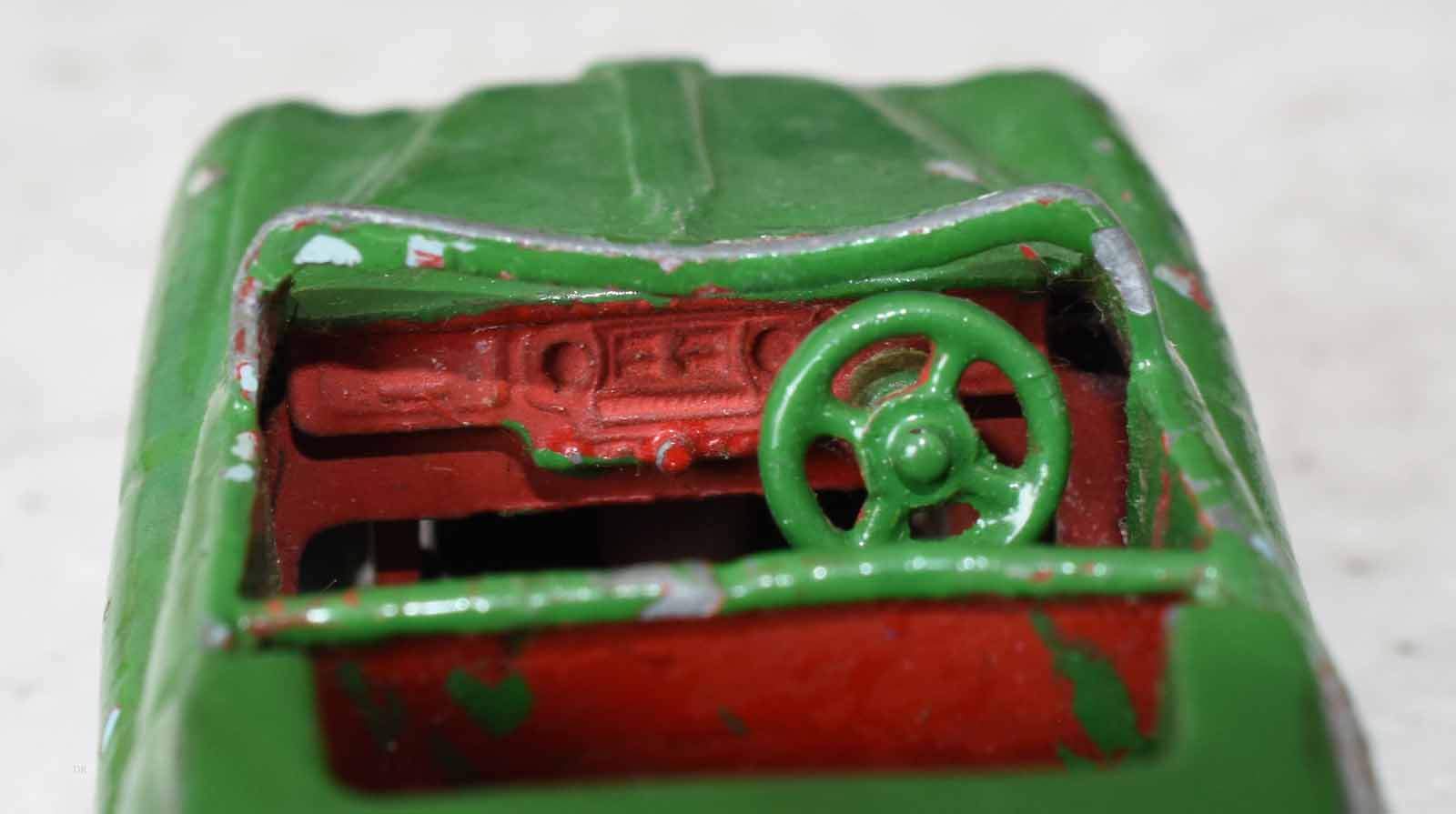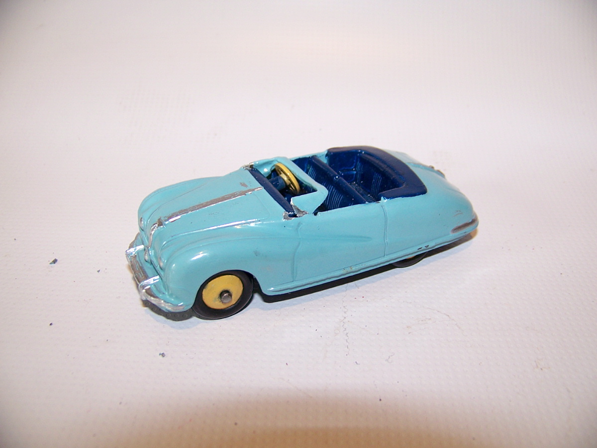 This model was badly over painted and windscreen frame bent. Once the paint had been stripped there was some chipping to the bodywork and casting marks. However the rest was quite sound and worthy of a restoration. The original colors were light blue, red trim and cream hubs. The one thing that I found interesting was the dashboard that was quite detailed and resembled the original model very well. My shaky hands show quite well on the detail work but a satisfactory result. PS Base plate to be finished with clear coat