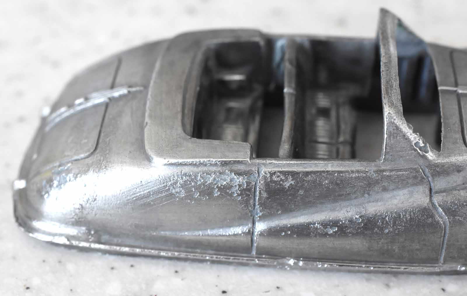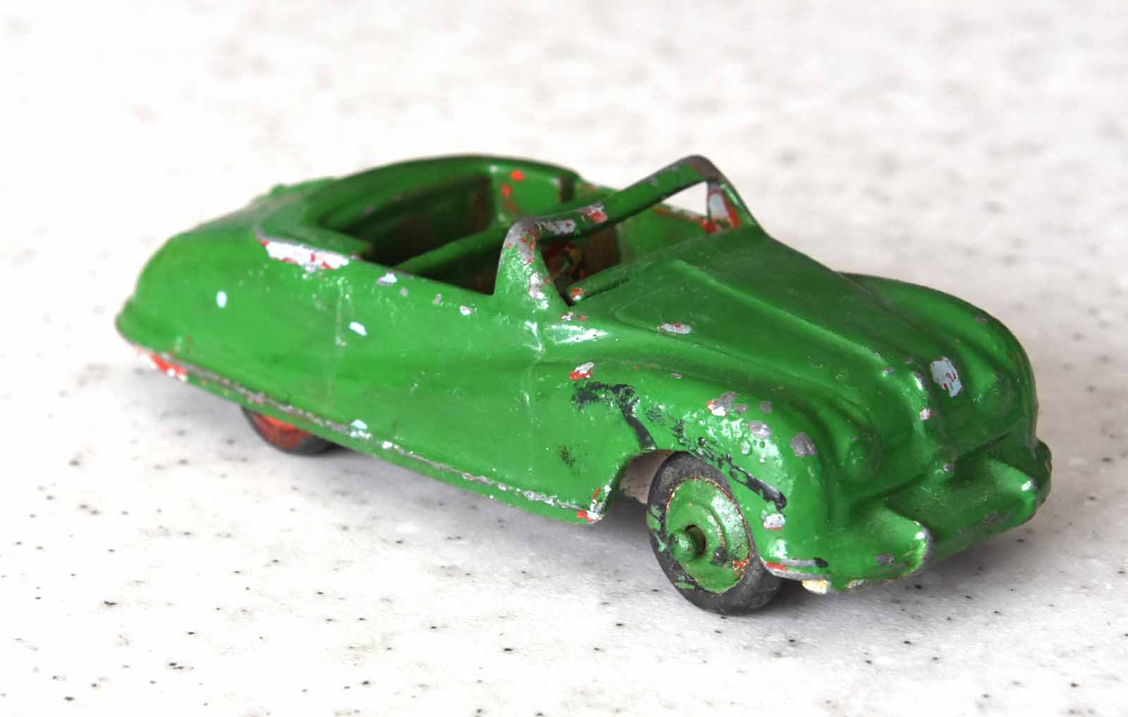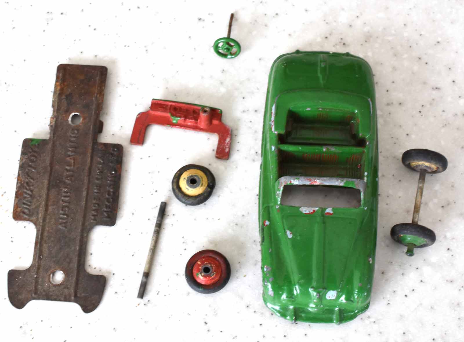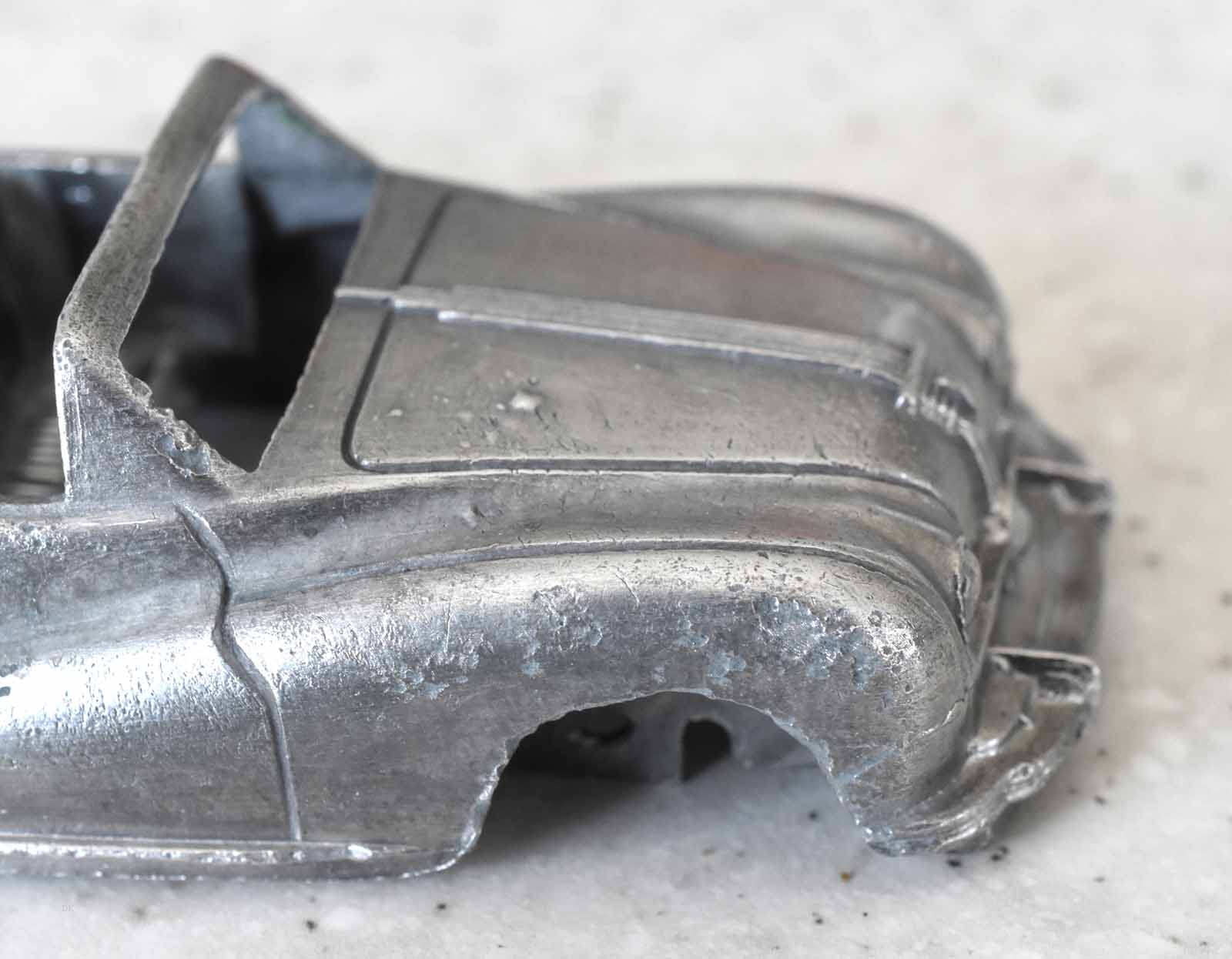 This model was badly over painted and windscreen frame bent. Once the paint had been stripped there was some chipping to the bodywork and casting marks. However the rest was quite sound and worthy of a restoration. The original colors were light blue, red trim and cream hubs. The one thing that I found interesting was the dashboard that was quite detailed and resembled the original model very well. My shaky hands show quite well on the detail work but a satisfactory result. PS Base plate to be finished with clear coat