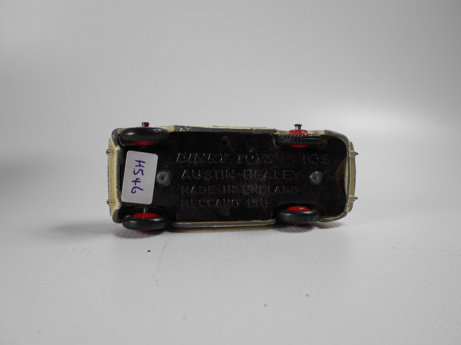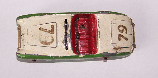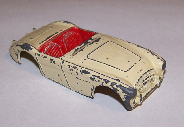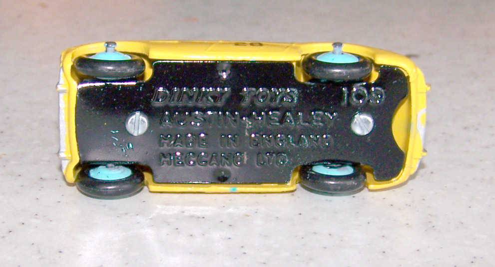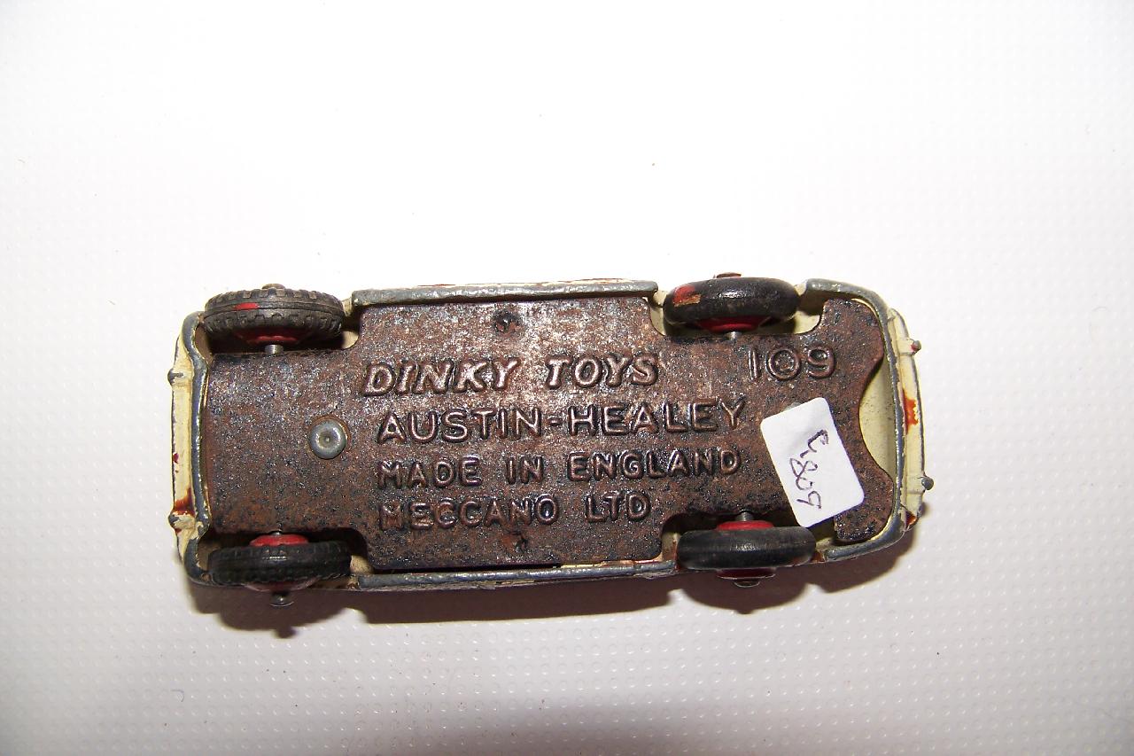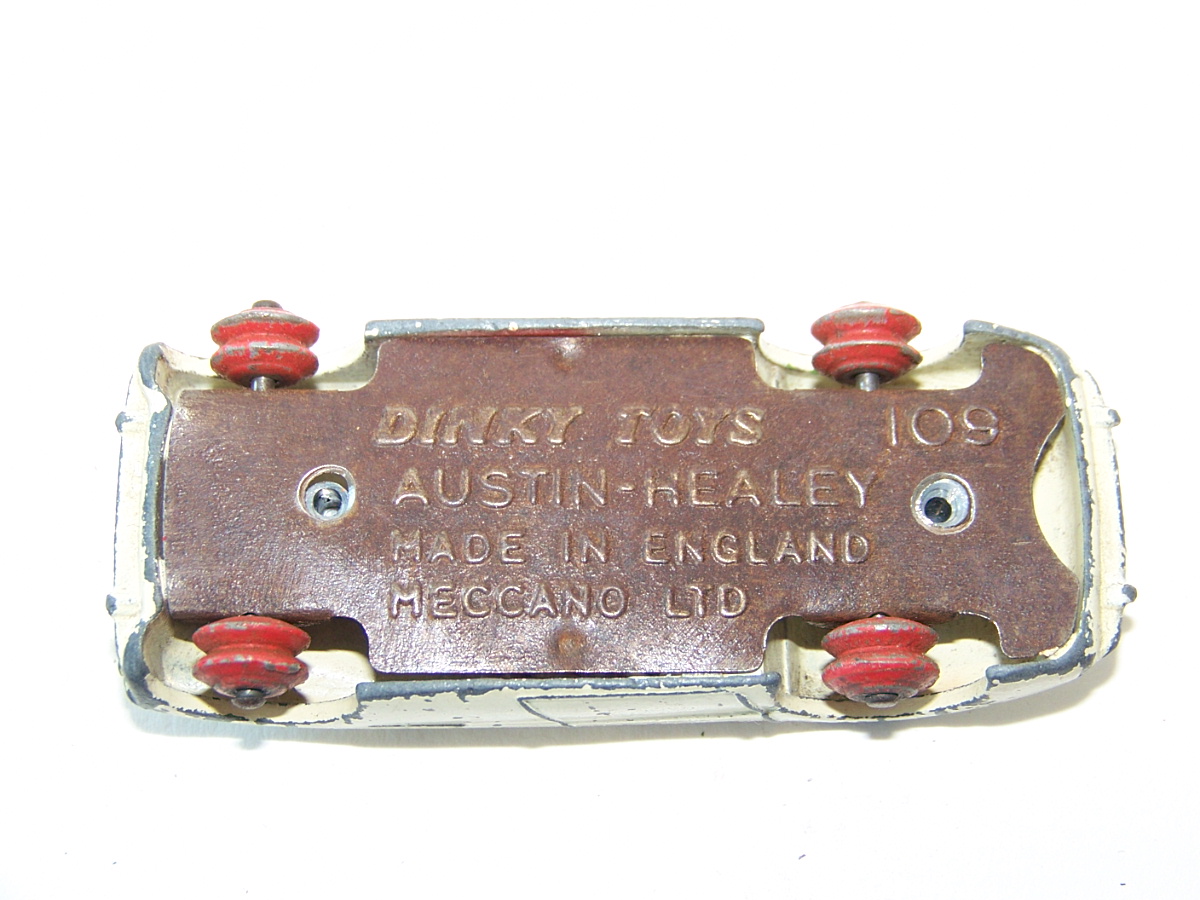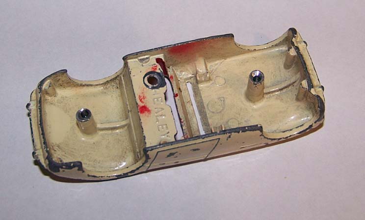 The Austin Healey was made in a touring finish and numbered 103 and a competition finish 109. This is a 109, confirmed on the base plate, and will be restored with the correct number. However this is a cream color and may not have had a number. A little more research is needed. It was immersed in a gentle paint stripper which only removed the new paint and left a shiny, although badly chipped, original paint.