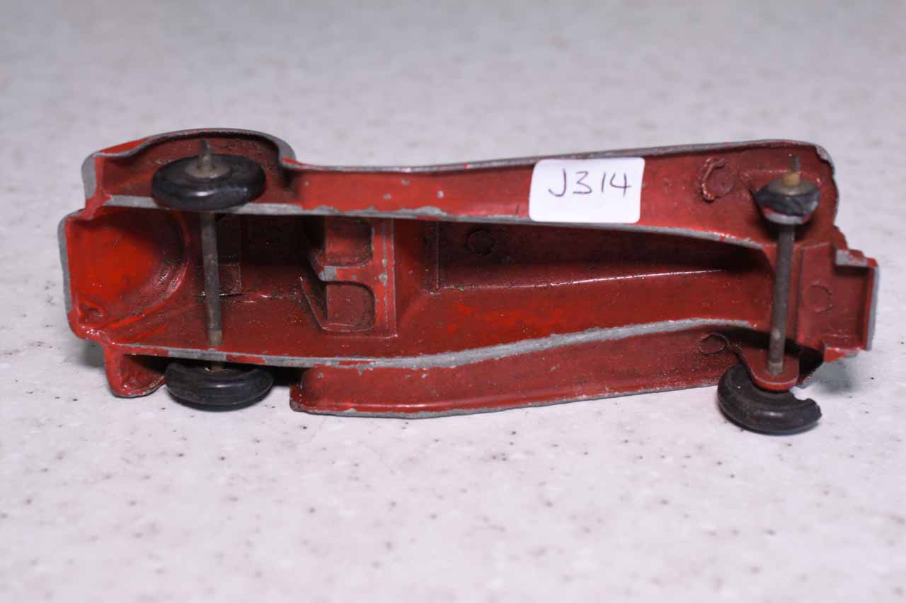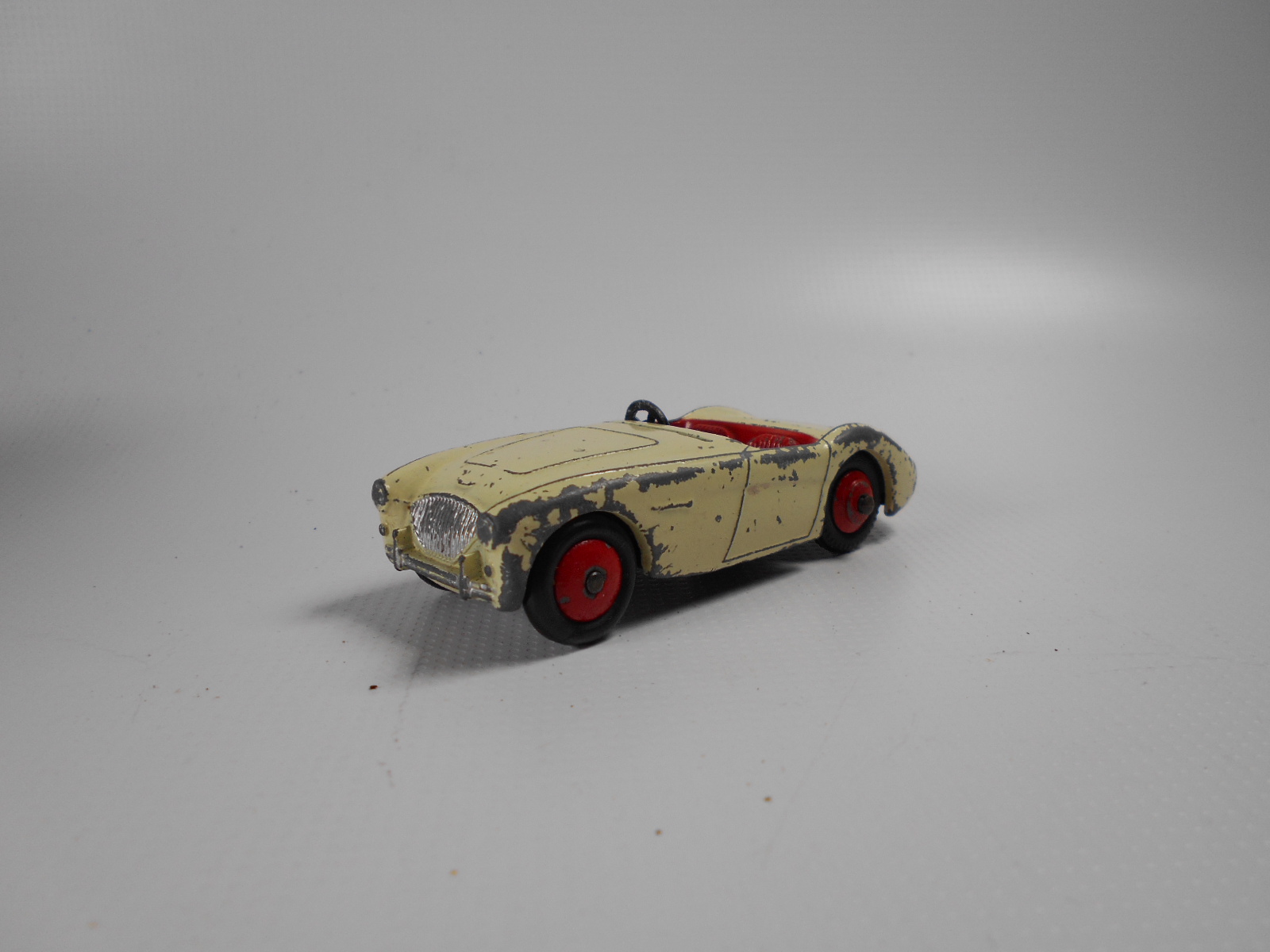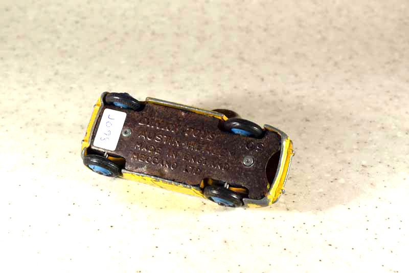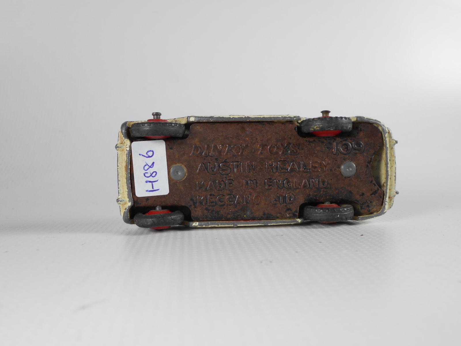 The Austin Healey was made in a touring finish and numbered 103 and a competition finish 109. This is a 109, confirmed on the base plate, and will be restored with the correct number. However this is a cream color and may not have had a number. A little more research is needed. It was immersed in a gentle paint stripper which only removed the new paint and left a shiny, although badly chipped, original paint.
