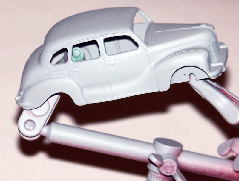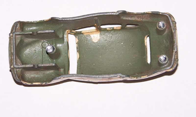 A very poor repaint, and the original color was olive green, as shown on the inside shot. There was also some damage to the roof, scratches and dings, these were rubbed with wire wool and primer added. This was sufficient to hide the blemishes. This car had little damage so a paint strip, primer and a few top coats of green. Silver paint applied to the radiator grille, lights, door handles etc. finished the painting of the body. The base was painted black and was refitted to the body with 4-40 screws. A new box template was created.
