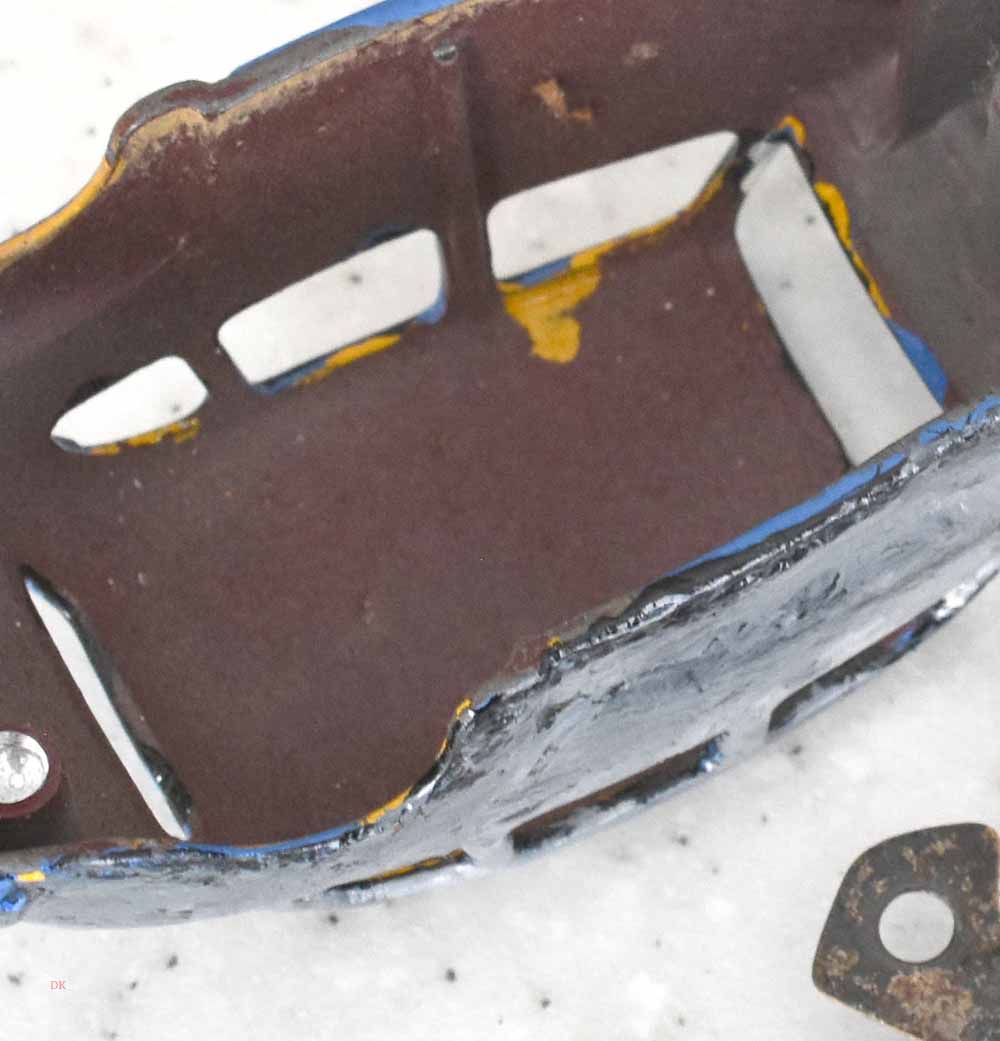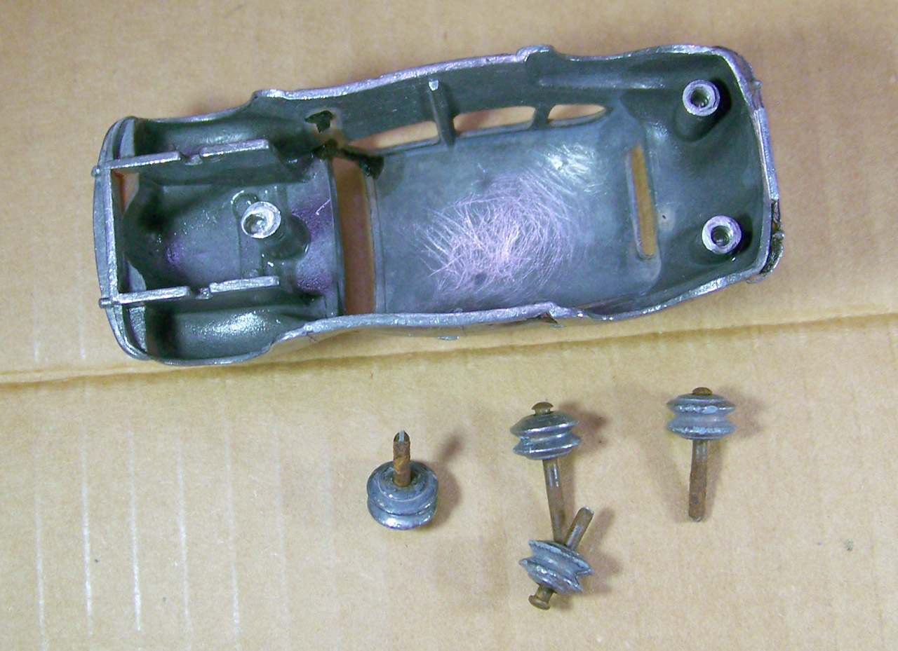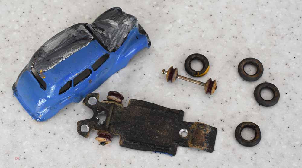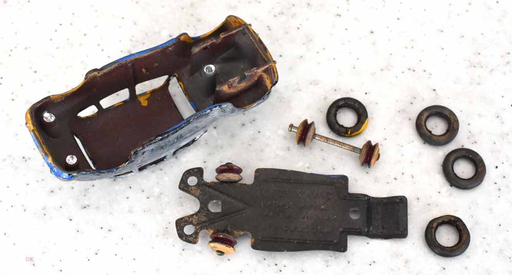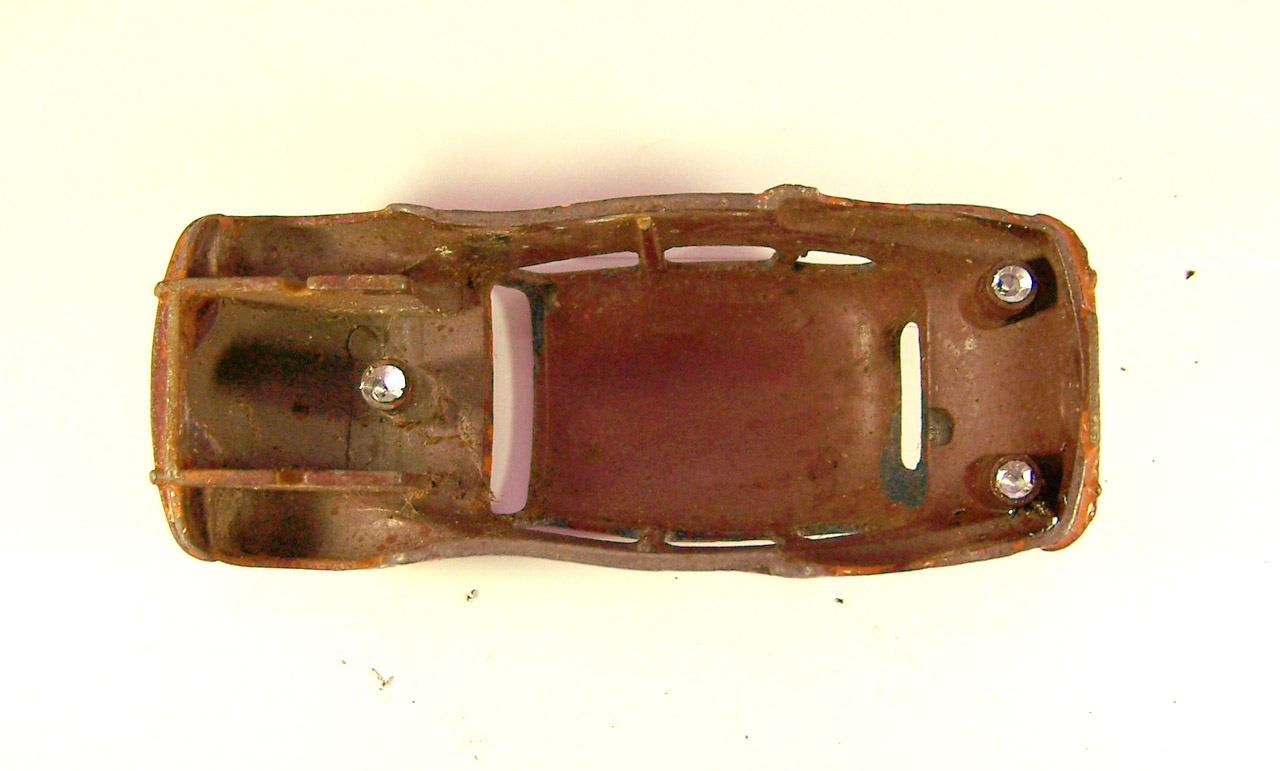 Rusty, overpainted more than once but solid model. The chassis was soaked in vinegar overnight and the result is surprisingly good with most lettering visible. Original colour maroon as seen on the inside. Corrosion to the bodywork mostly covered by two coats of primer, but still a few blemishes.