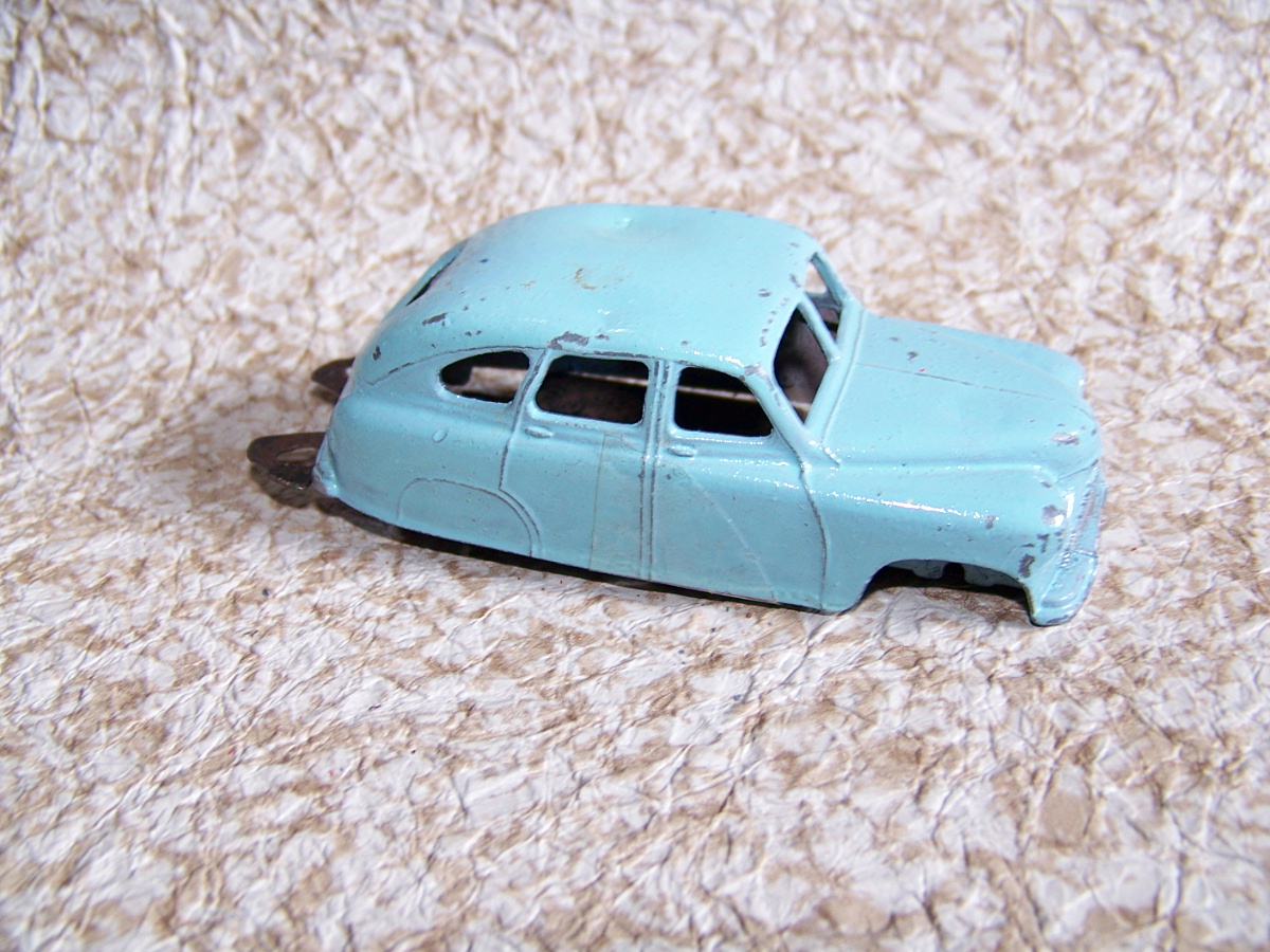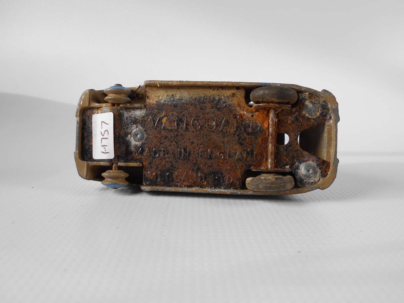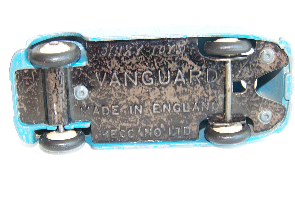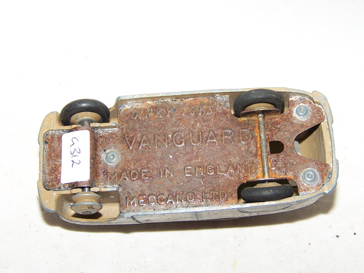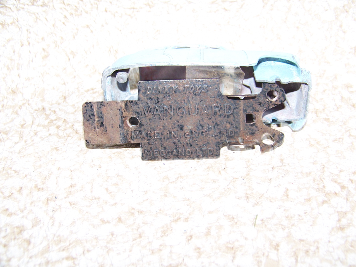 Ripe for restoration. Overpainted with blue over blue, just as you would have expected from this period but the Vanguard was never given such luxury. The original was beige but I decided to go for the light blue. Rusty chassis but otherwise the model did not require any repair. The earlier model had rear wheel arches as shown in the 1957 catalogue. The 1958 shows enclosed rear wheels.