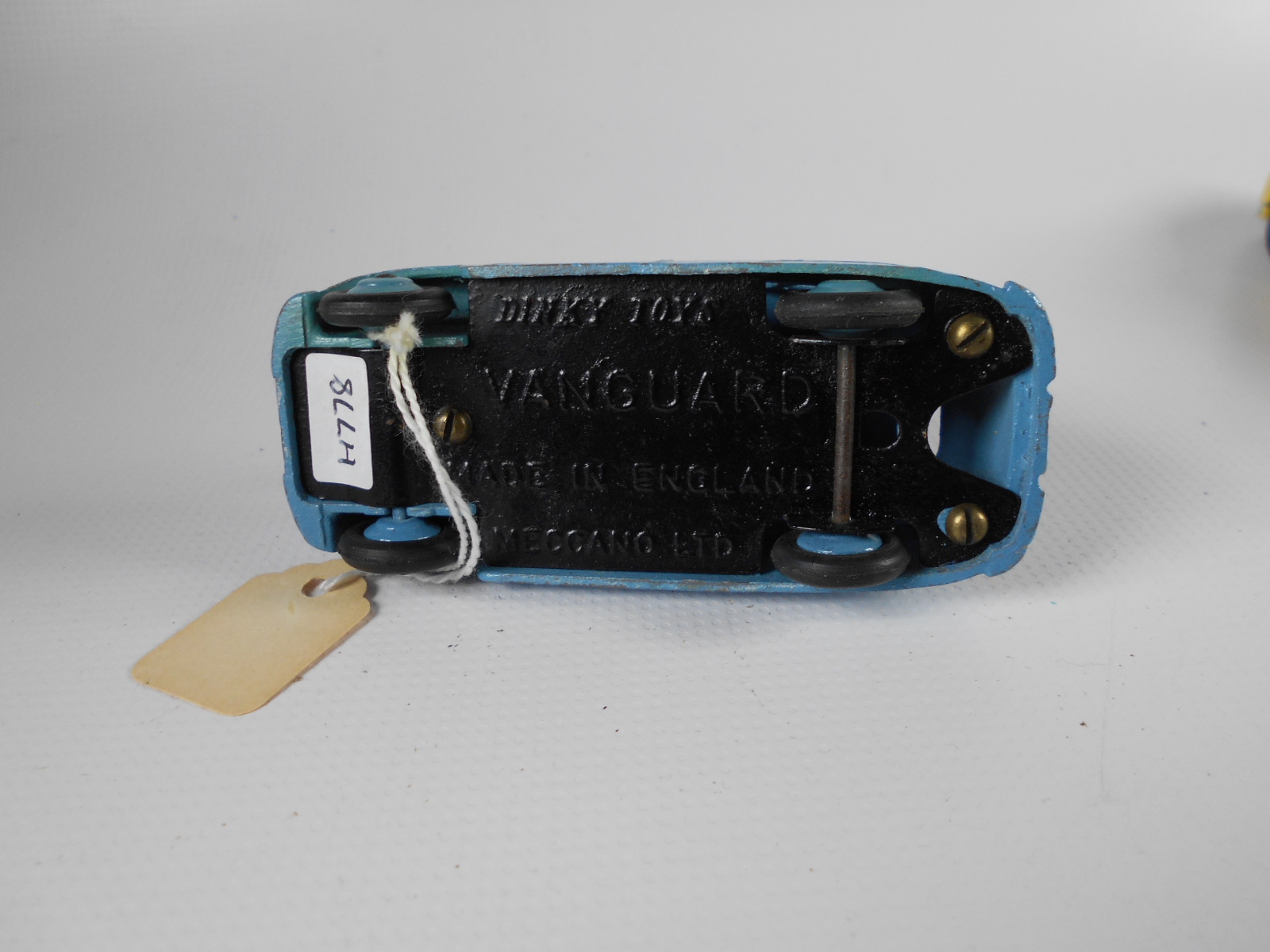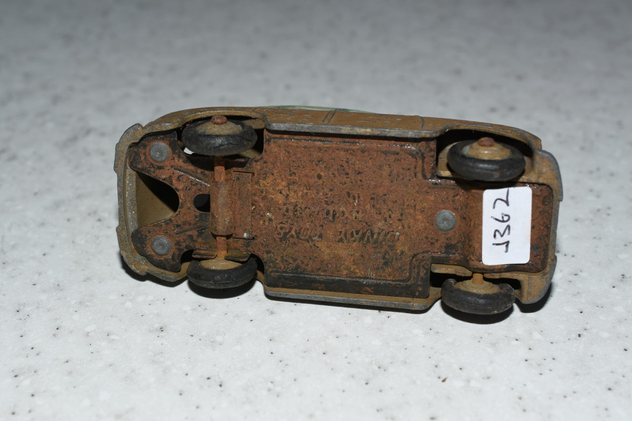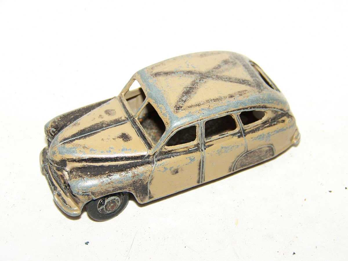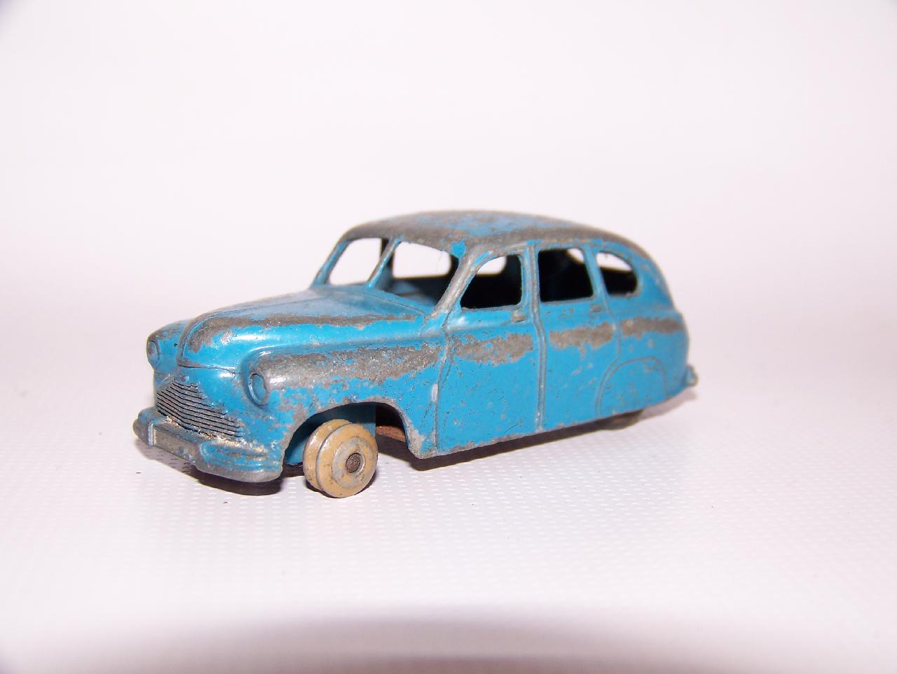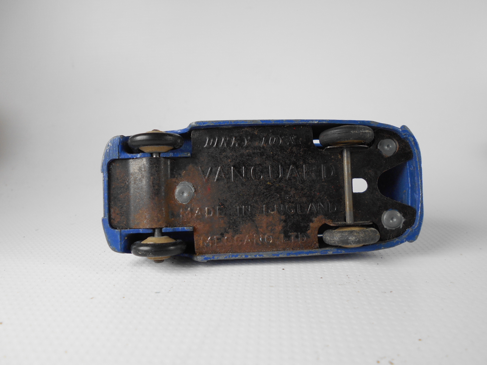 Ripe for restoration. Overpainted with blue over blue, just as you would have expected from this period but the Vanguard was never given such luxury. The original was beige but I decided to go for the light blue. Rusty chassis but otherwise the model did not require any repair. The earlier model had rear wheel arches as shown in the 1957 catalogue. The 1958 shows enclosed rear wheels.