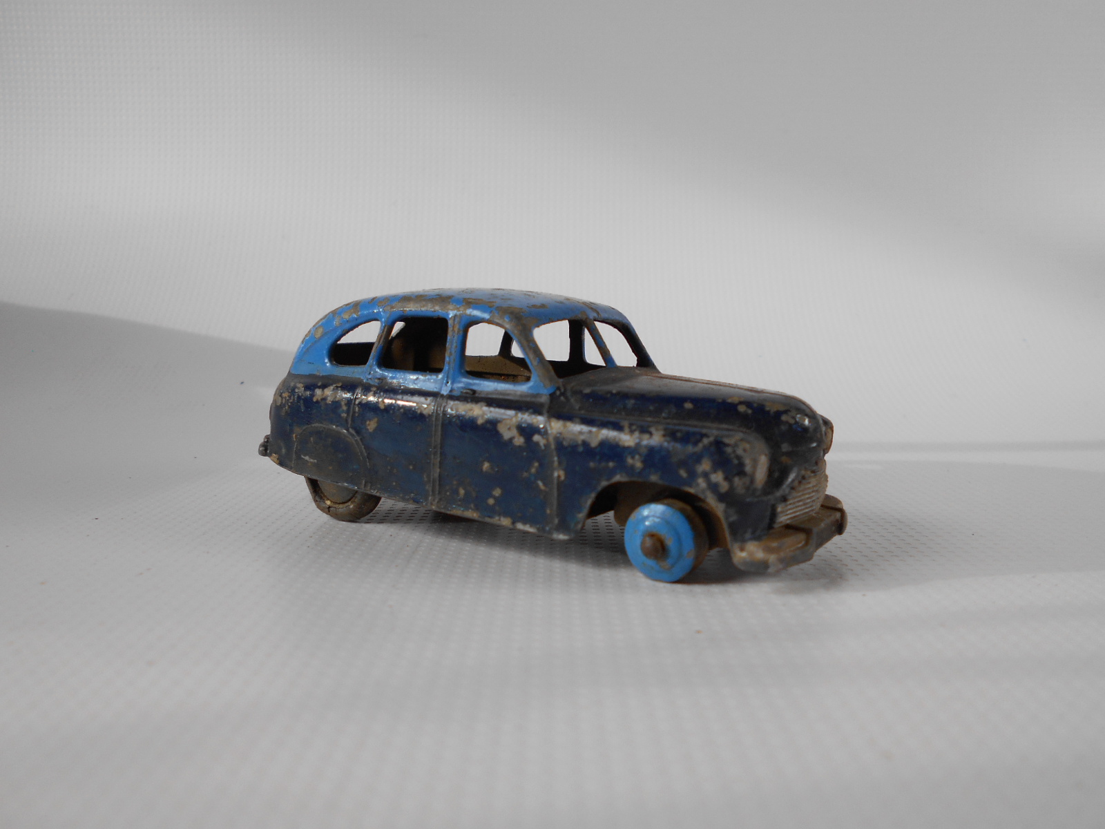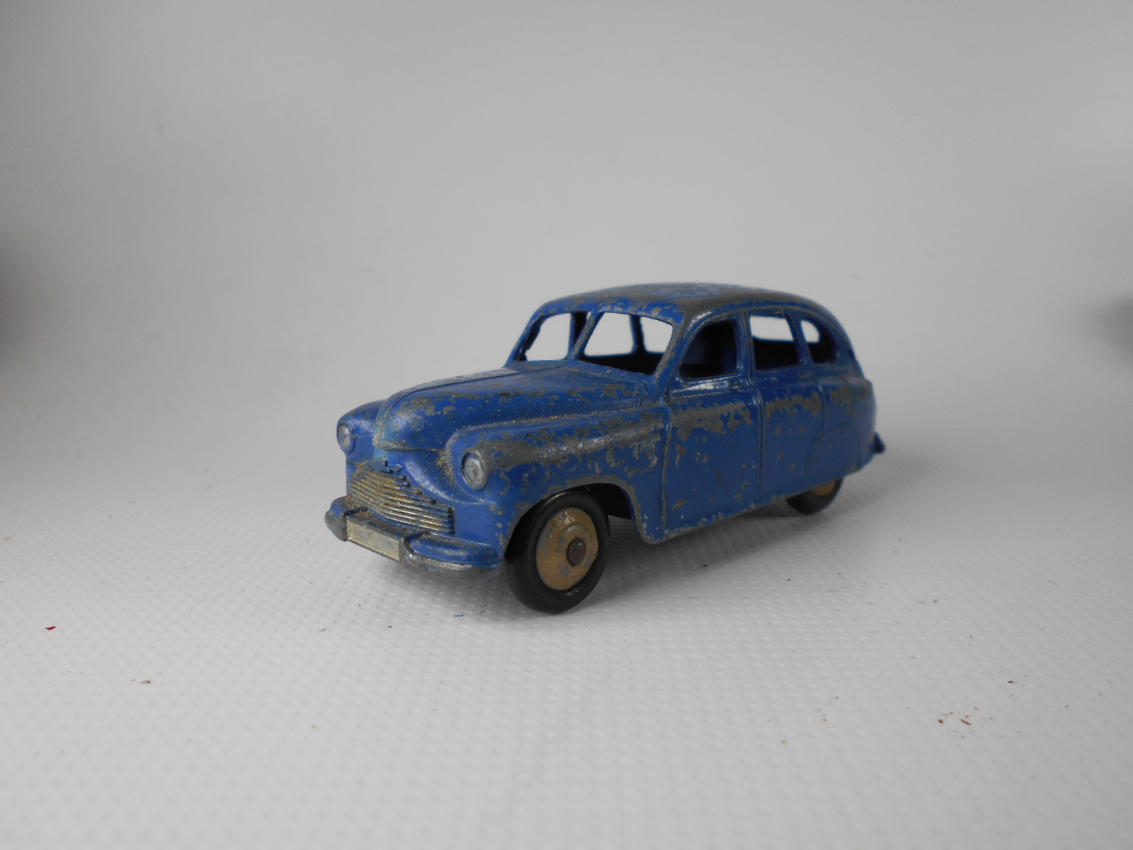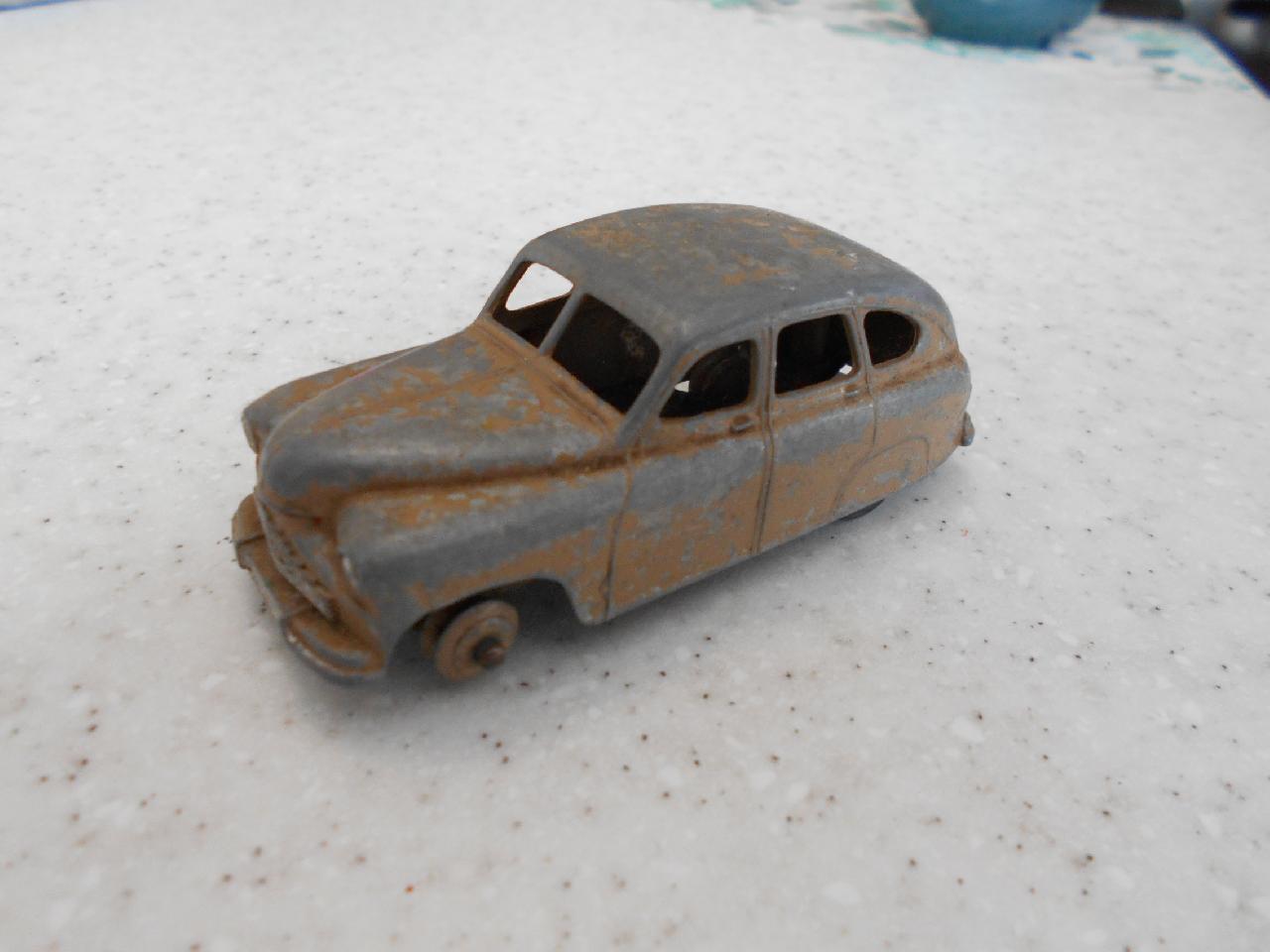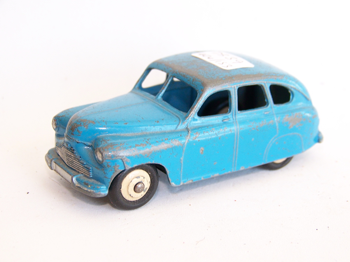 Ripe for restoration. Overpainted with blue over blue, just as you would have expected from this period but the Vanguard was never given such luxury. The original was beige but I decided to go for the light blue. Rusty chassis but otherwise the model did not require any repair. The earlier model had rear wheel arches as shown in the 1957 catalogue. The 1958 shows enclosed rear wheels.