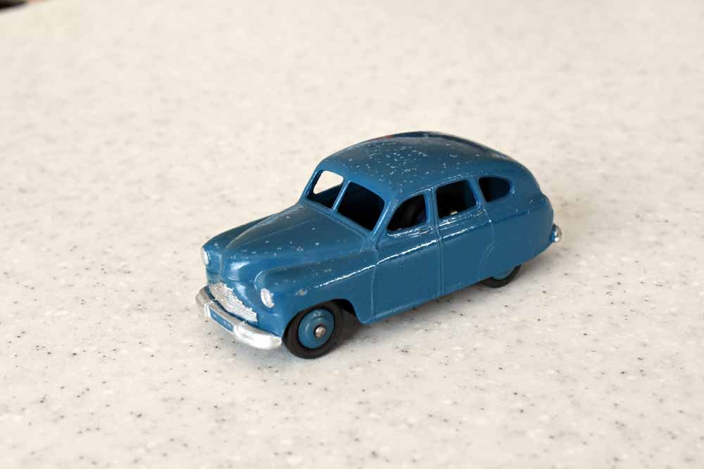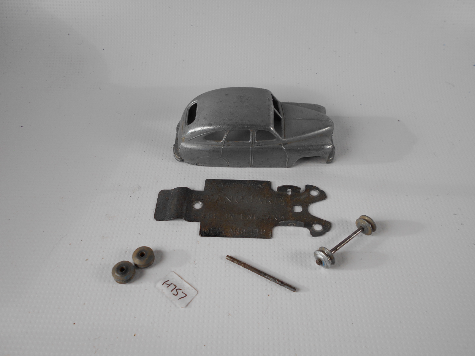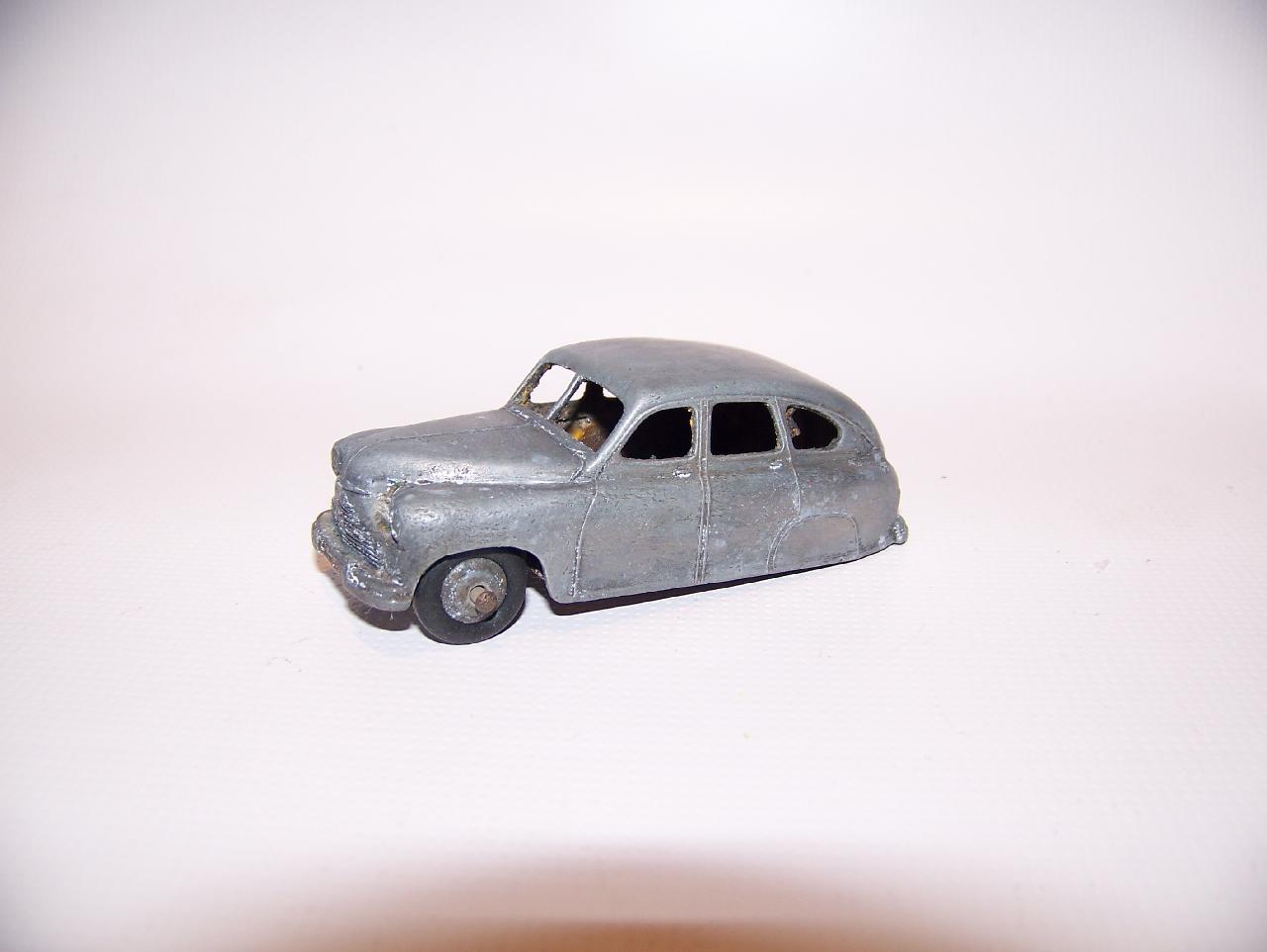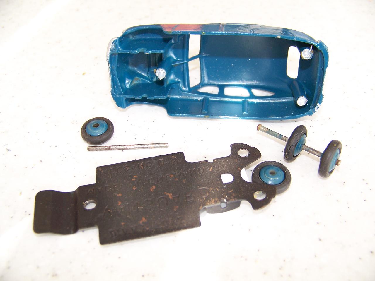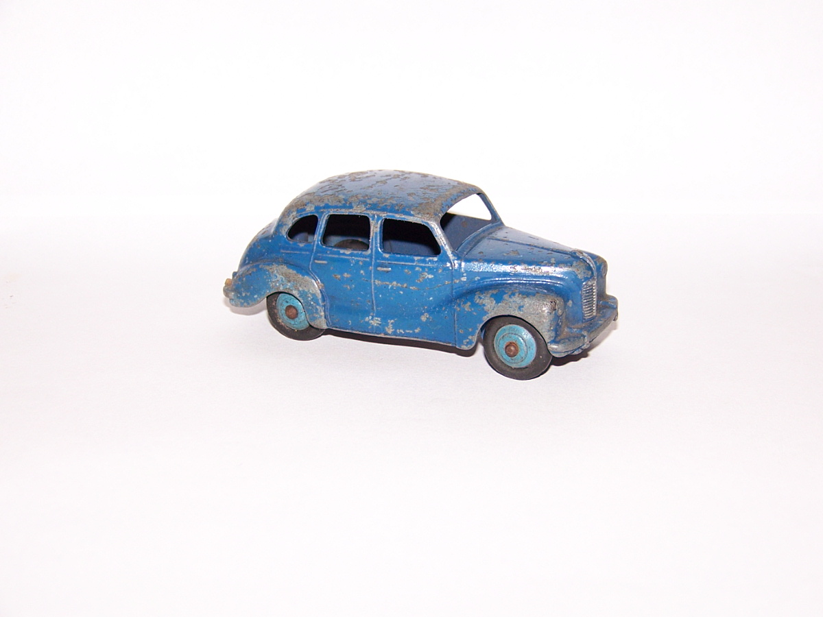 Ripe for restoration. Overpainted with blue over blue, just as you would have expected from this period but the Vanguard was never given such luxury. The original was beige but I decided to go for the light blue. Rusty chassis but otherwise the model did not require any repair. The earlier model had rear wheel arches as shown in the 1957 catalogue. The 1958 shows enclosed rear wheels.