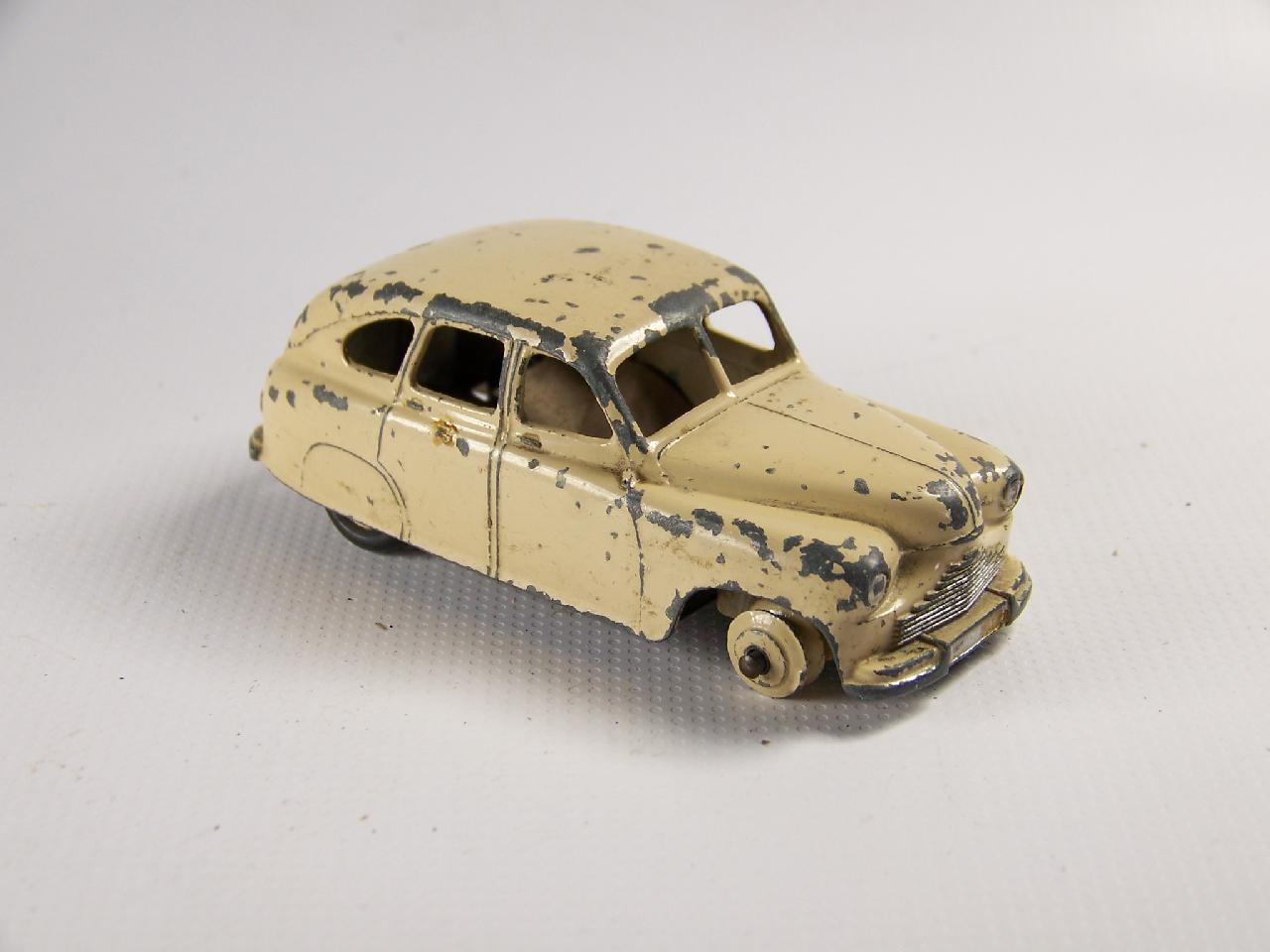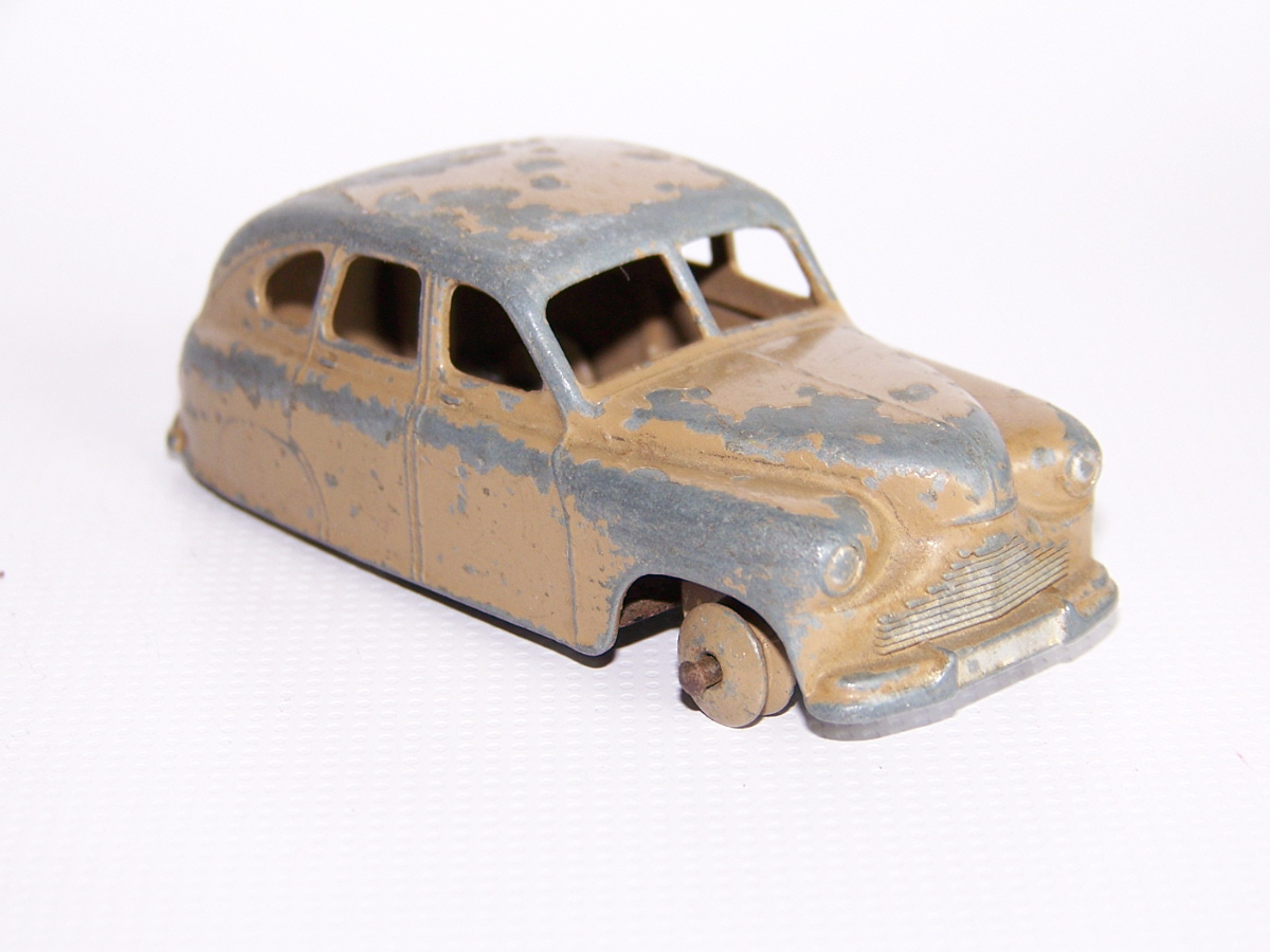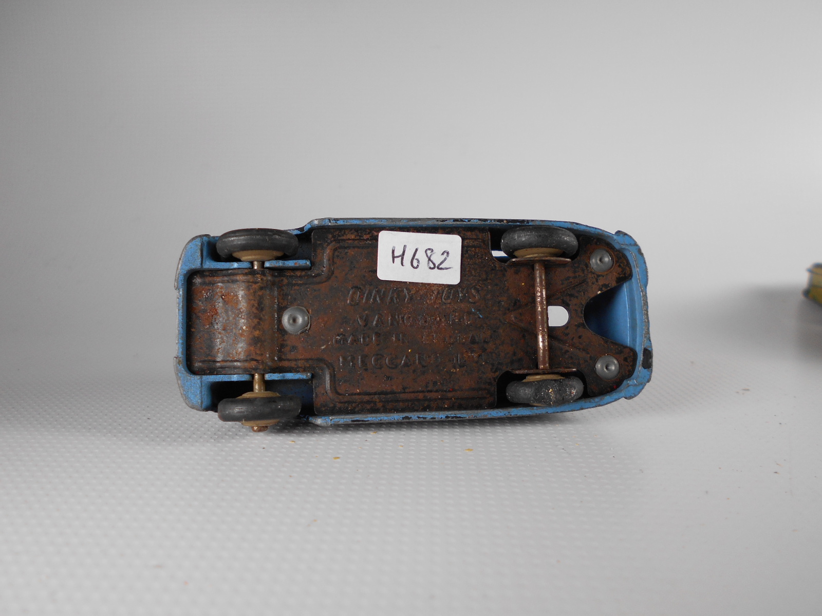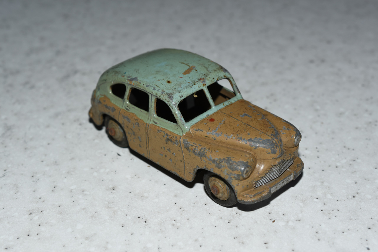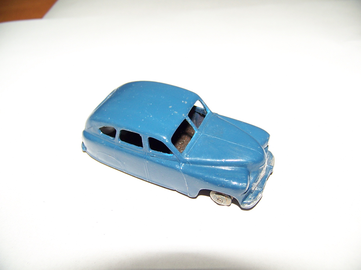 Ripe for restoration. Overpainted with blue over blue, just as you would have expected from this period but the Vanguard was never given such luxury. The original was beige but I decided to go for the light blue. Rusty chassis but otherwise the model did not require any repair. The earlier model had rear wheel arches as shown in the 1957 catalogue. The 1958 shows enclosed rear wheels.