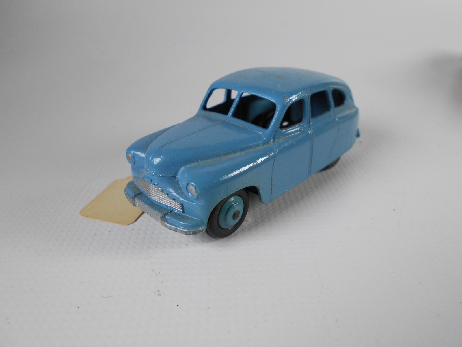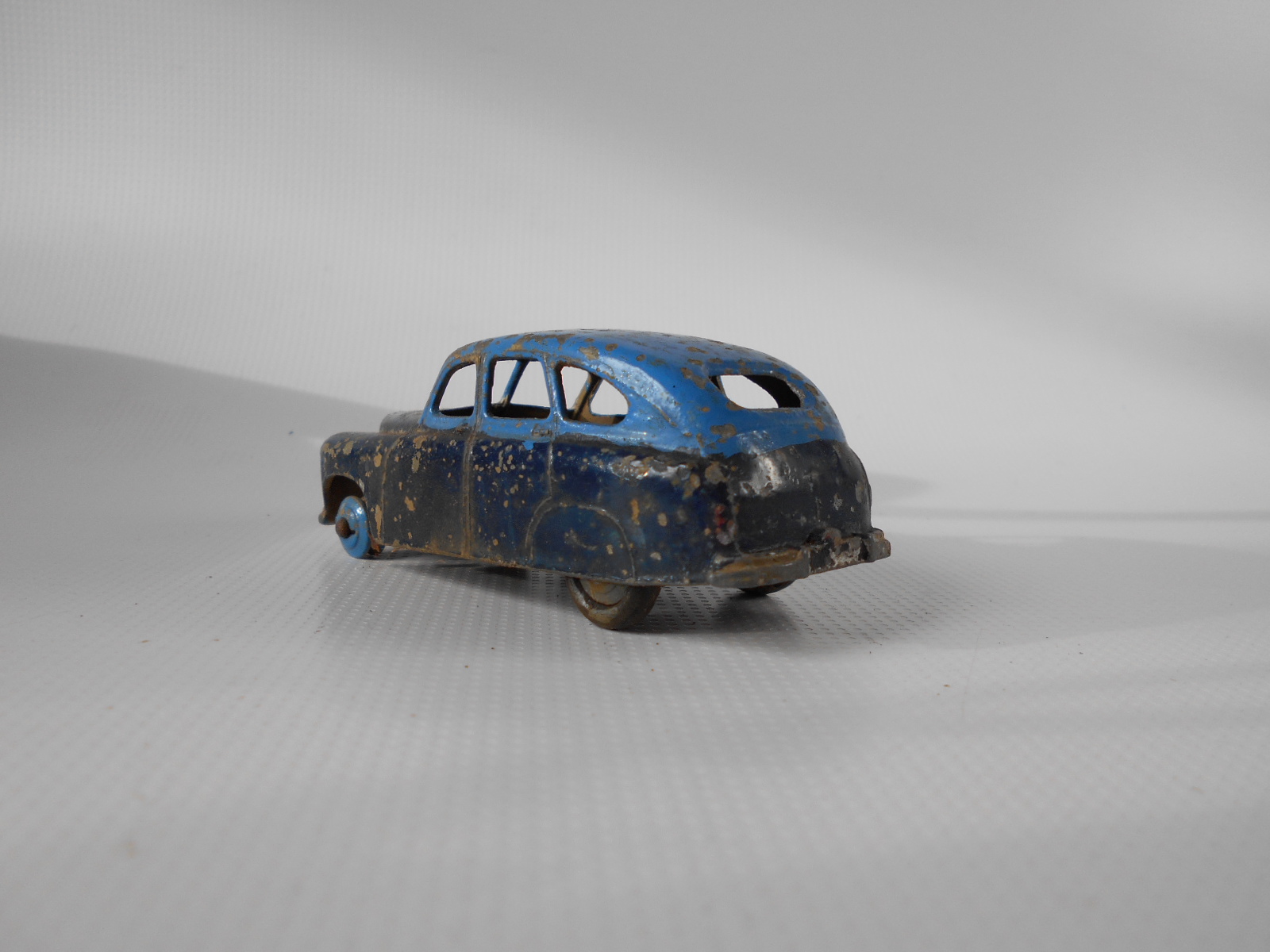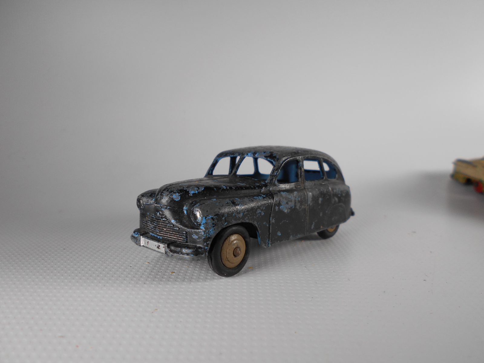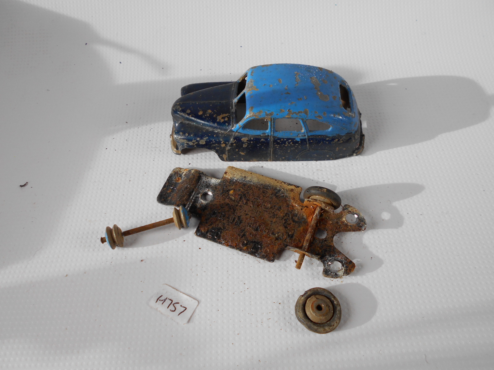 Ripe for restoration. Overpainted with blue over blue, just as you would have expected from this period but the Vanguard was never given such luxury. The original was beige but I decided to go for the light blue. Rusty chassis but otherwise the model did not require any repair. The earlier model had rear wheel arches as shown in the 1957 catalogue. The 1958 shows enclosed rear wheels.