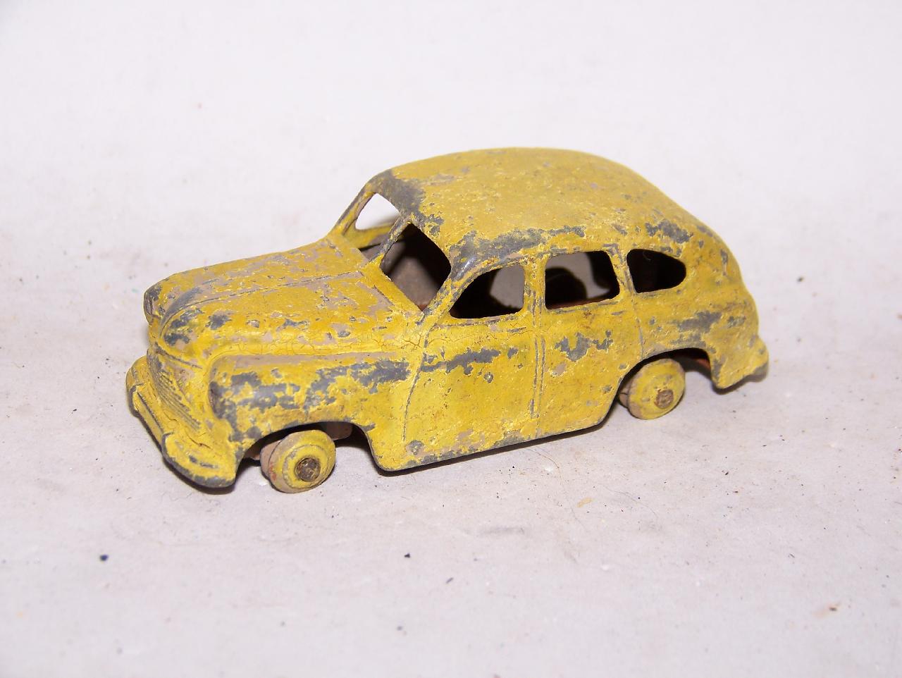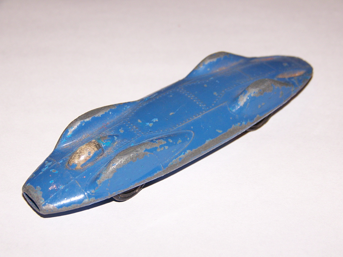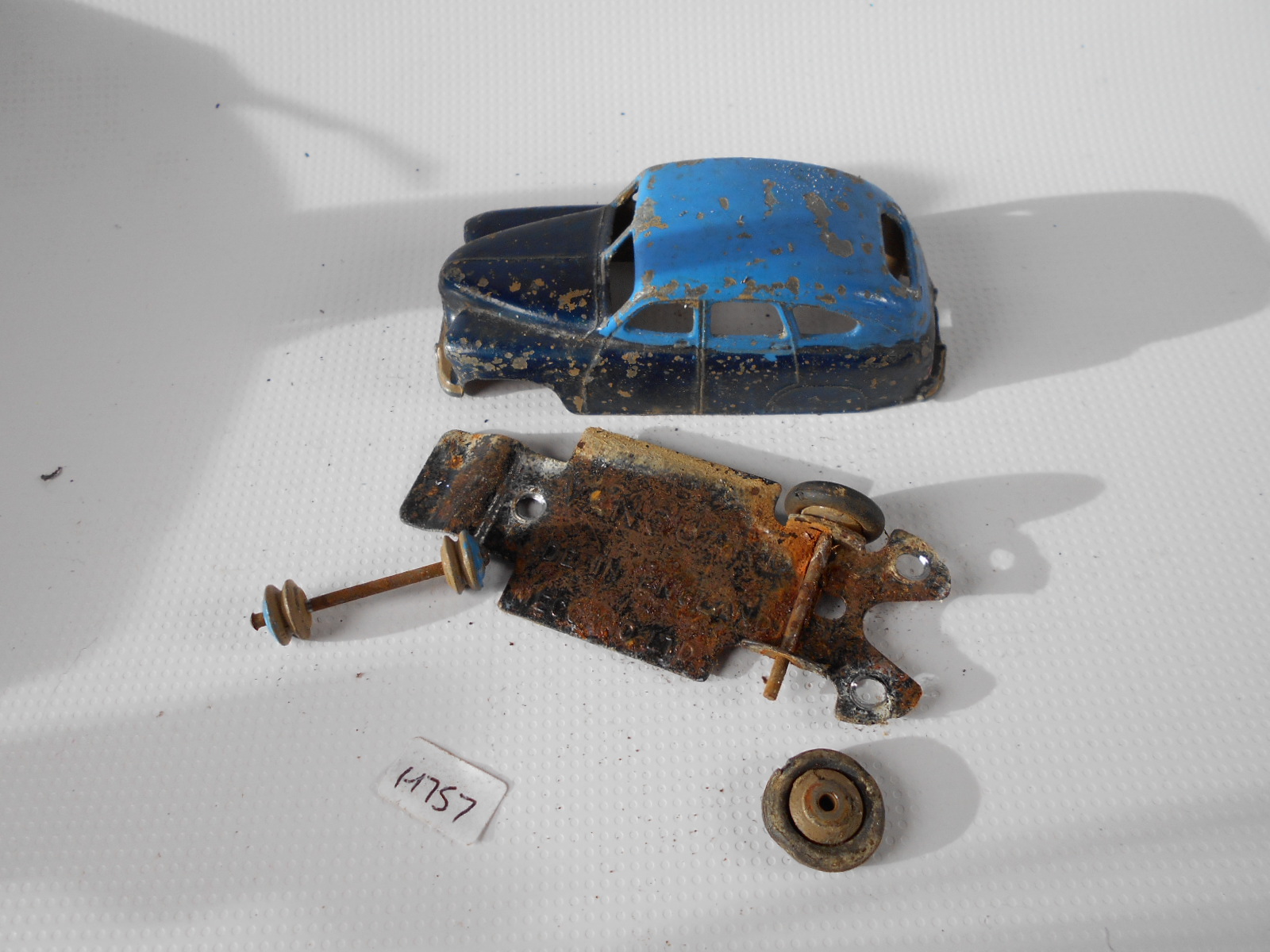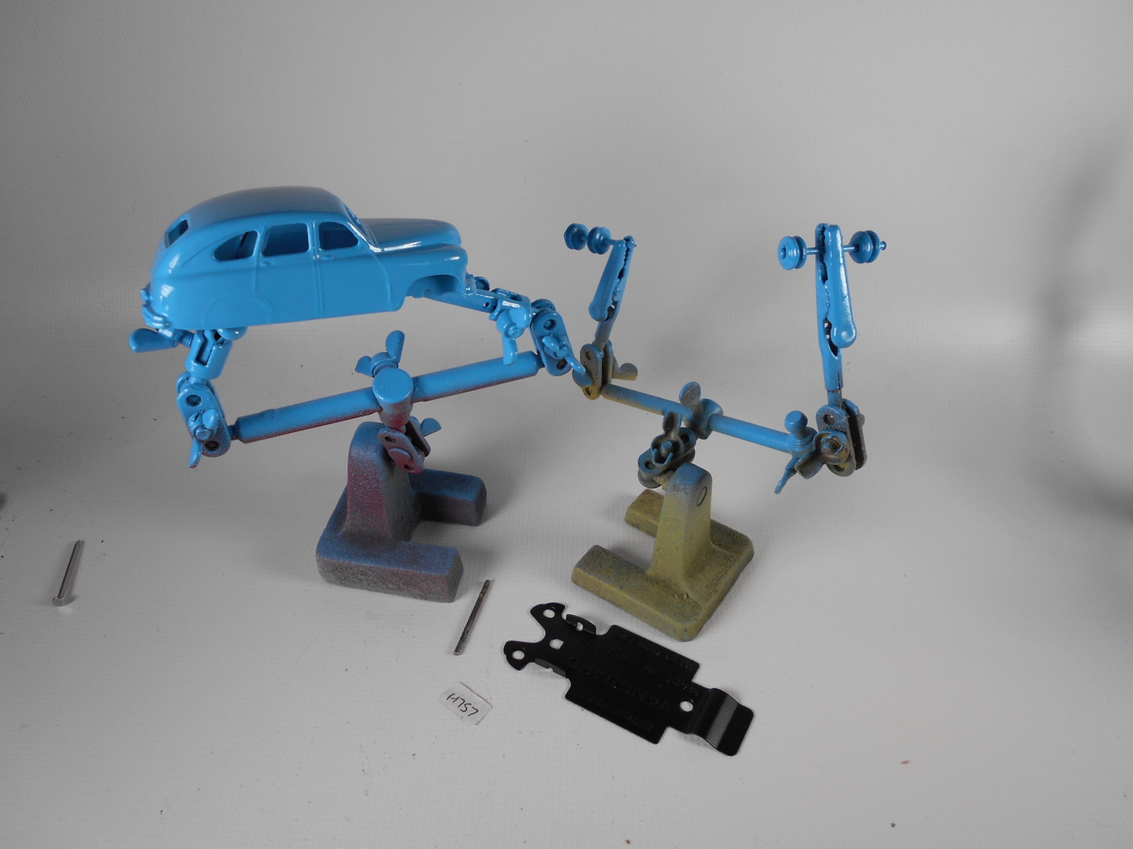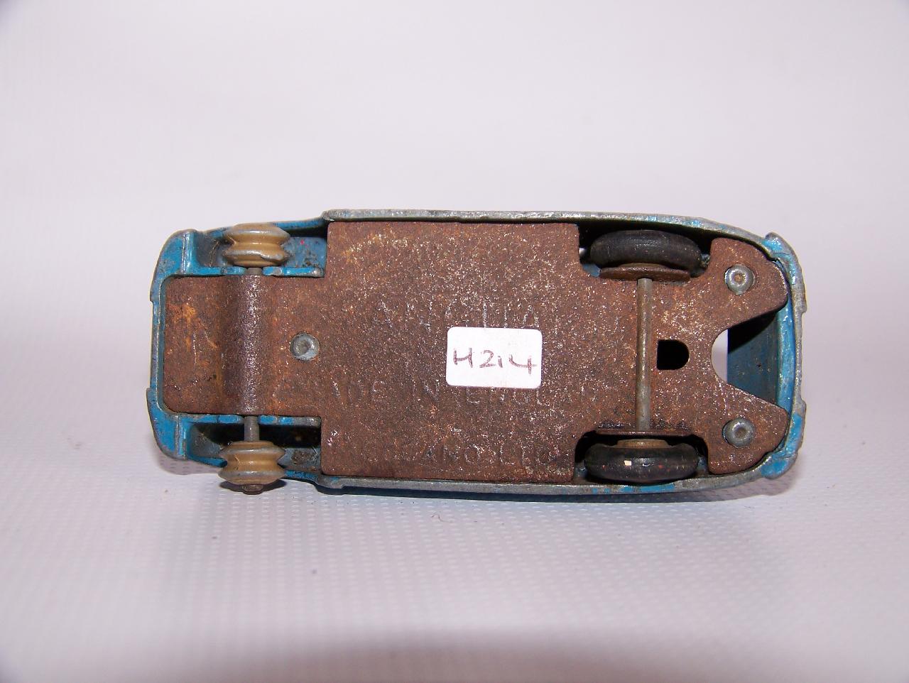 Ripe for restoration. Overpainted with blue over blue, just as you would have expected from this period but the Vanguard was never given such luxury. The original was beige but I decided to go for the light blue. Rusty chassis but otherwise the model did not require any repair. The earlier model had rear wheel arches as shown in the 1957 catalogue. The 1958 shows enclosed rear wheels.