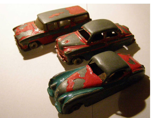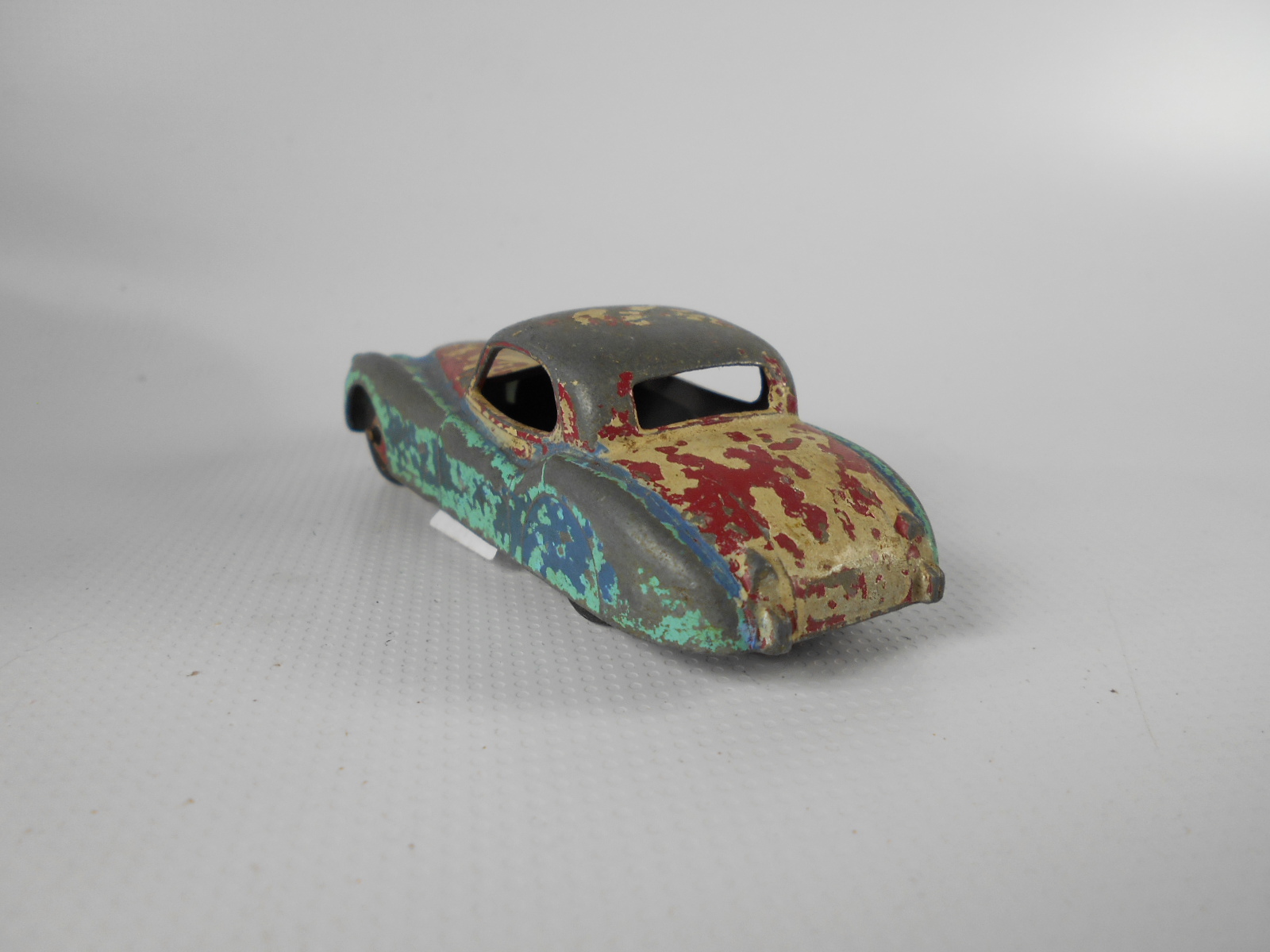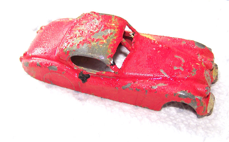 I guess this car must have been painted at least three times over the original red. The final coat was silver but there was yellow and black underneath. I am confused a little by the yellow as it was inside the car as well but after stripping the paint the only color left was red. Judge for yourself by the images as the yellow could not have easily got where it was without removing the base. There was a little damage to the left front fender and chassis and the roof surface was pitted. Straight forward strip and respray