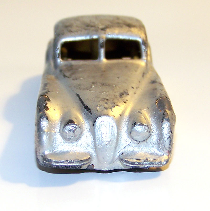 Received in very poor condition with the central windscreen pillar missing and part of a job lot of three. The chassis removed, paint stripped, and the pillar was replaced before a respray. The chassis was rusted so a brutal wire brush treatment was necessary before a coat of black paint was applied. The two color finish was achieved with masking tape and finished with a brush. Silver applied to the grille and bumpers finished this car off.