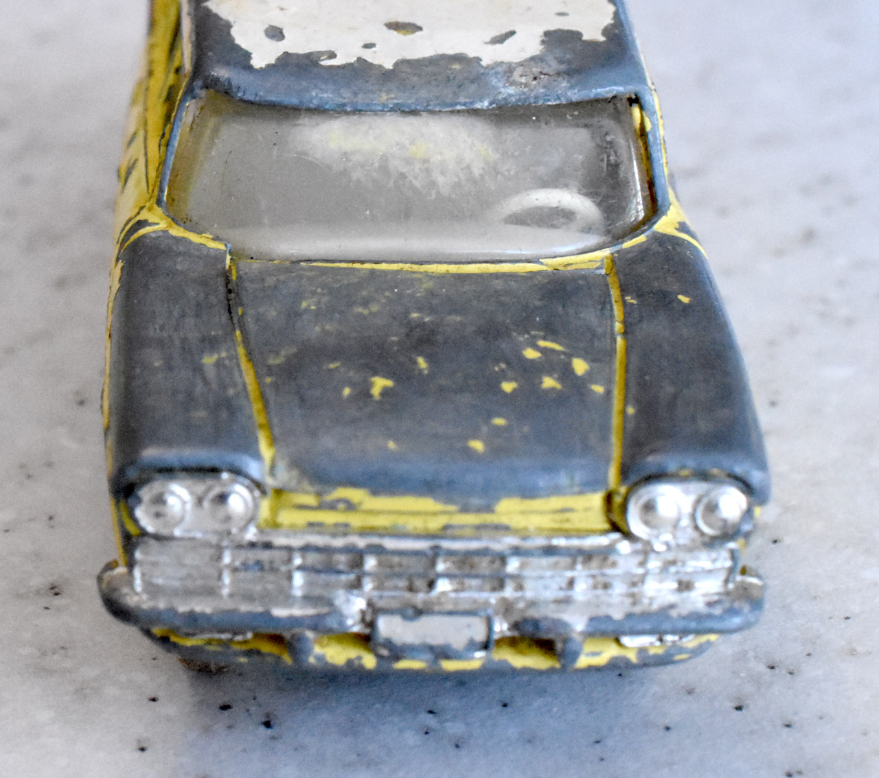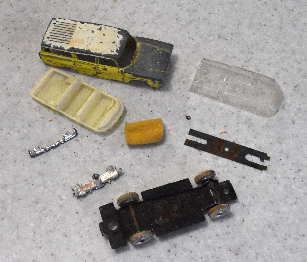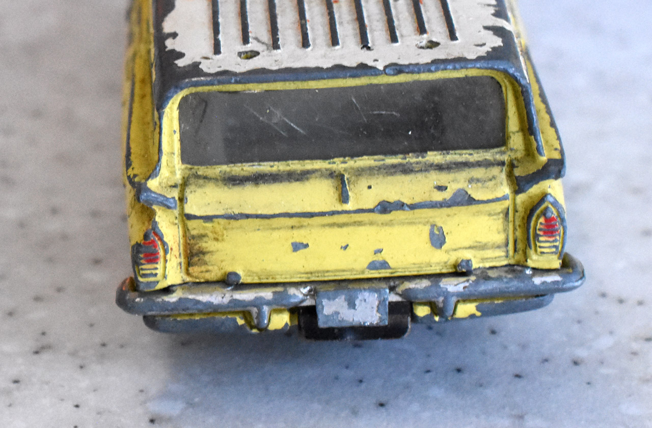There are more parts to this model than it first looked. The bumpers and grille are separate parts and have to be removed. The pictures show that the front grille is removed by grinding away the head of the stub inside the bodyshell and carefully tapping the assembly out. The stub needs to be removed from the grille, see photograph. The rear bumper just needs the tabs to be squeezed inwards. All parts of this model need attention. The screen is cracked, the hood bonnet is dented and general rust on the chassis and axles have impeded the steering.