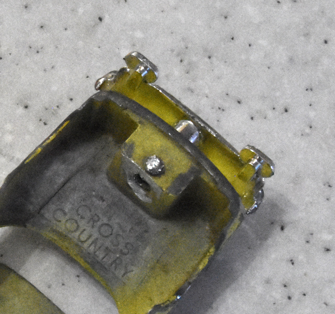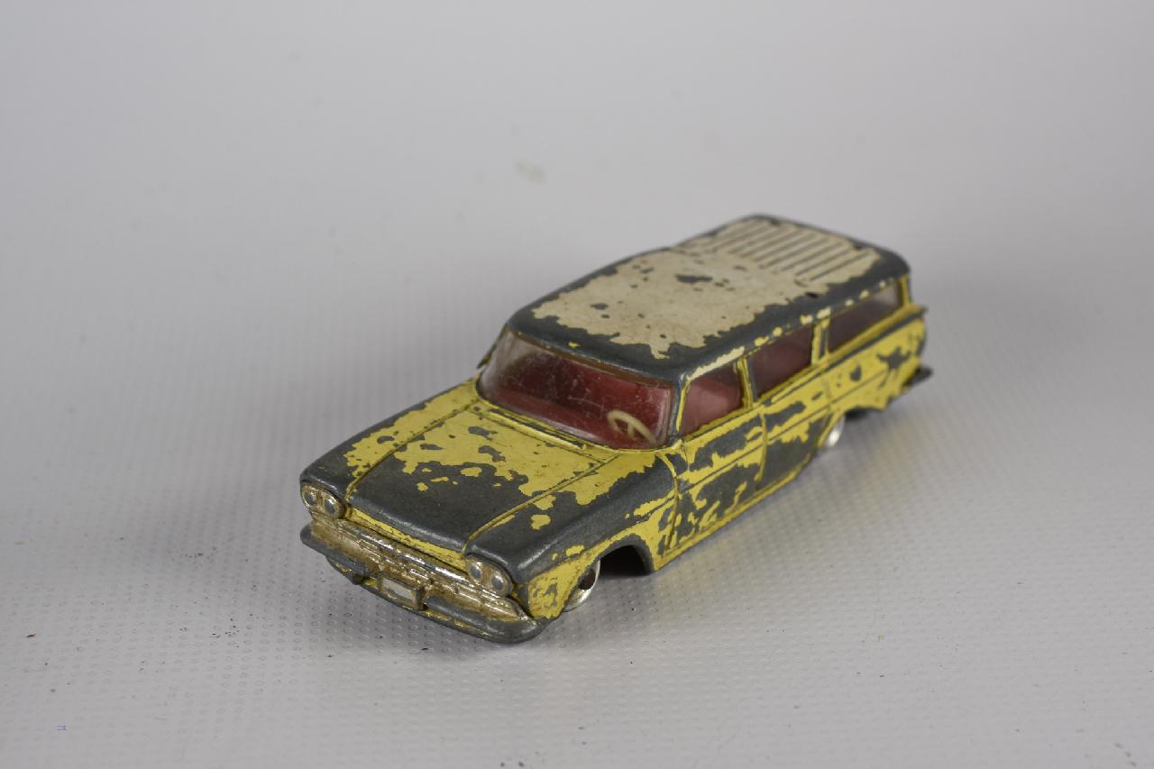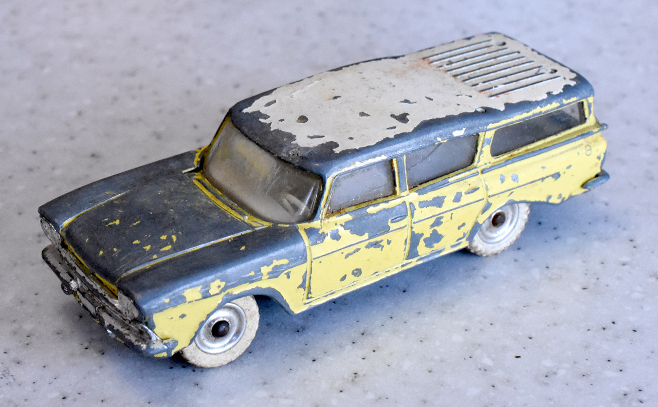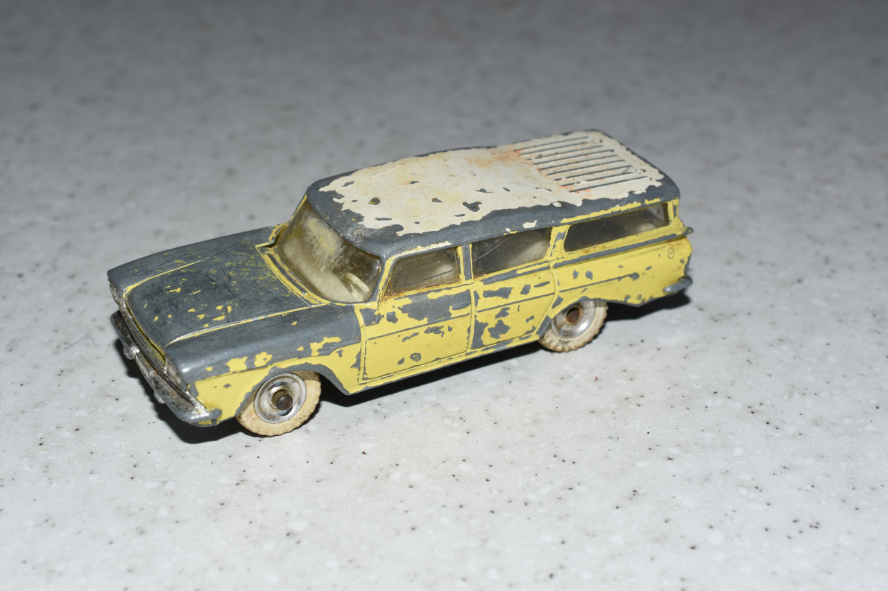 There are more parts to this model than it first looked. The bumpers and grille are separate parts and have to be removed. The pictures show that the front grille is removed by grinding away the head of the stub inside the bodyshell and carefully tapping the assembly out. The stub needs to be removed from the grille, see photograph. The rear bumper just needs the tabs to be squeezed inwards. All parts of this model need attention. The screen is cracked, the hood bonnet is dented and general rust on the chassis and axles have impeded the steering.