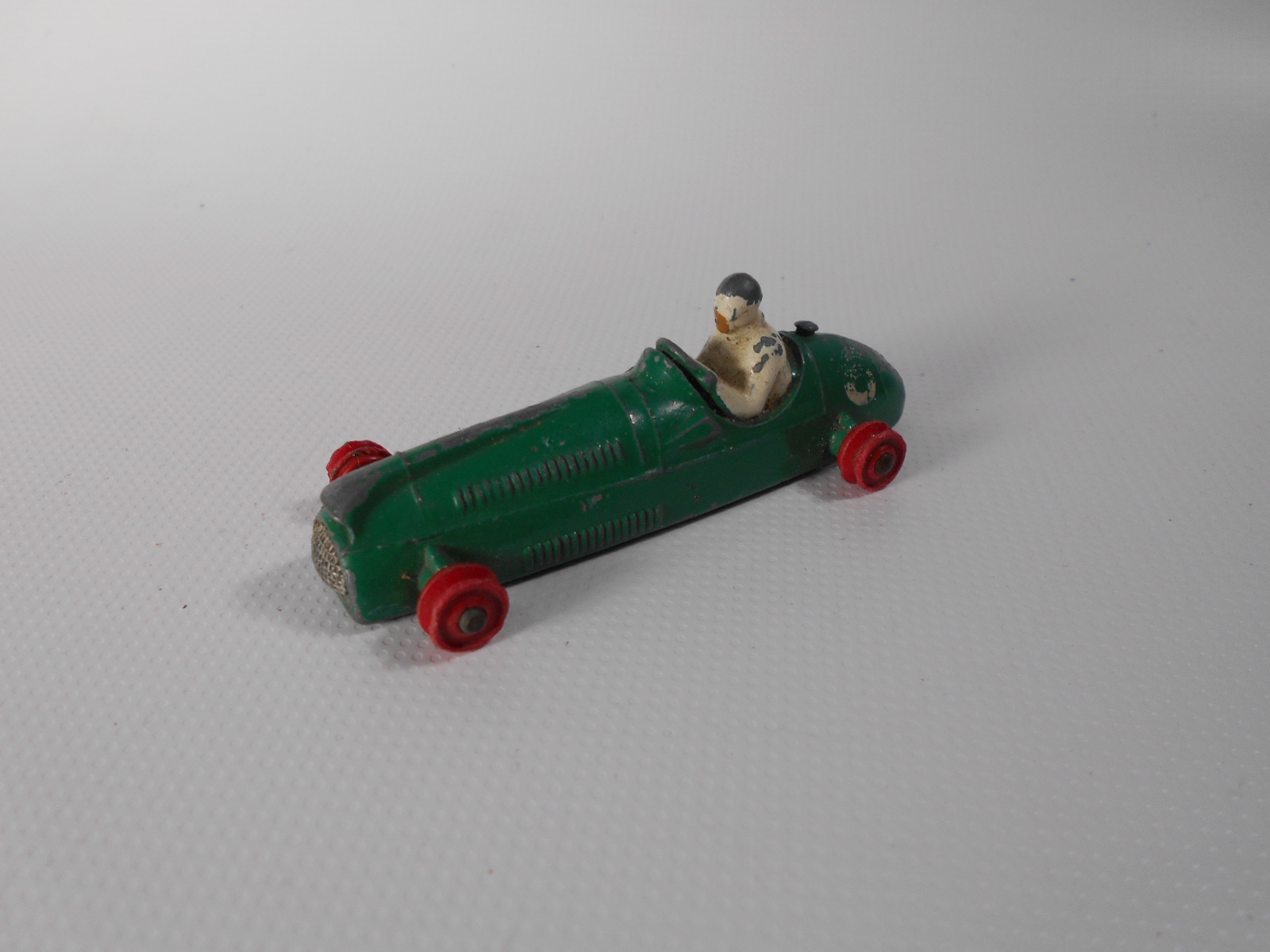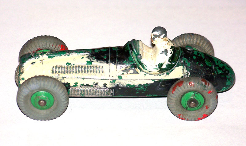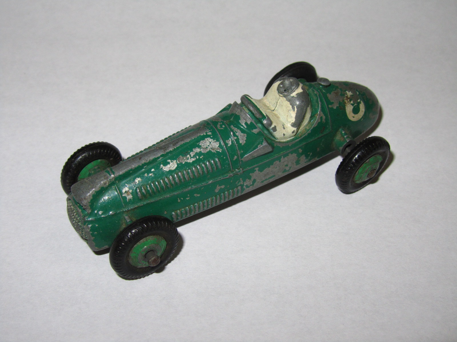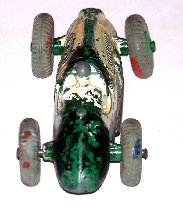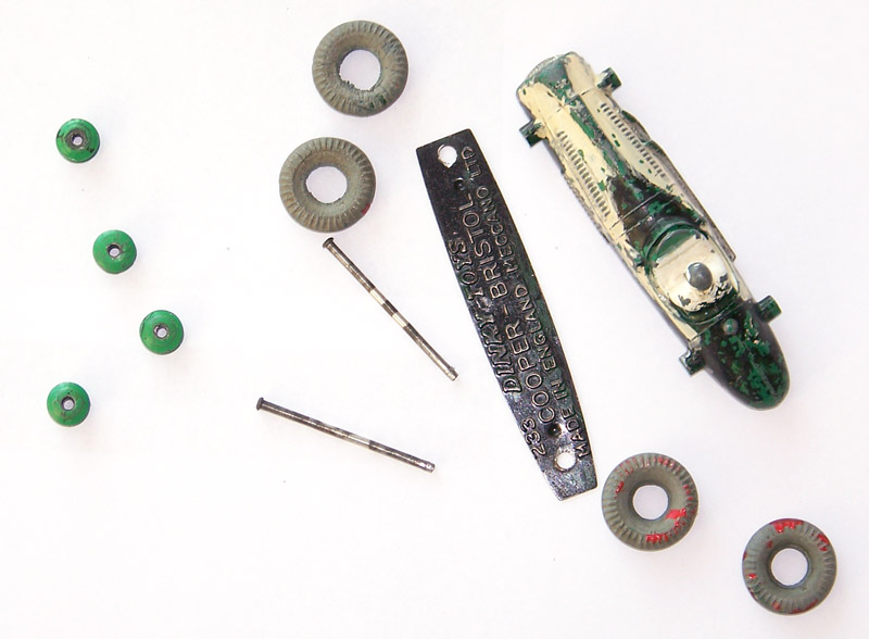 Complete but badly repainted. Hard and cracked rubber tires. Purchased on eBay. The first task will be to disassemble and strip the paint. The strip down was straight forward. The rivets were drilled out using a #43 bit, followed by a larger size to break the rivet top. Care was taken to ensure the initial hole was centered and breaking the rivet top did not damage the chassis. The choice of a #43 bit was that it could be re-riveted or tapped and screwed. The ends of the axles were tapped flat and the wheels removed. One end of the axle was originally tapped over and this is the end that was tapped flat. A small hammer and anvil is ideal for this. The next stage is to strip the paint and I use aircraft paint stripper. It is very corrosive so no getting it on your hands or breathing in the fumes, but it does work very well. A good wash in soapy water is good enough to prepare for new paint. For some reason the white paint used for the driver was difficult to remove, a little sand blasting may have helped. Casting marks were removed and a coat of primer and several top coats were applied to wheels and body, the base plate recoated in black. A little paint here and there and reassembled using small threaded screws. Needs only the number applied to the sides.