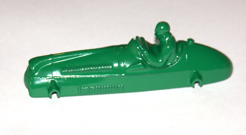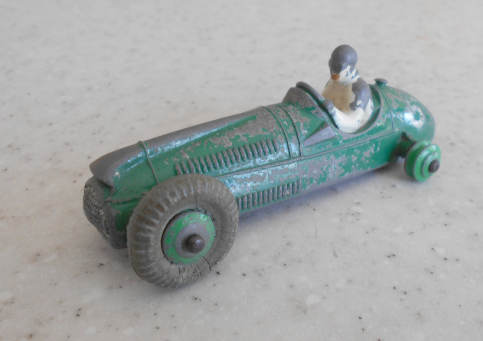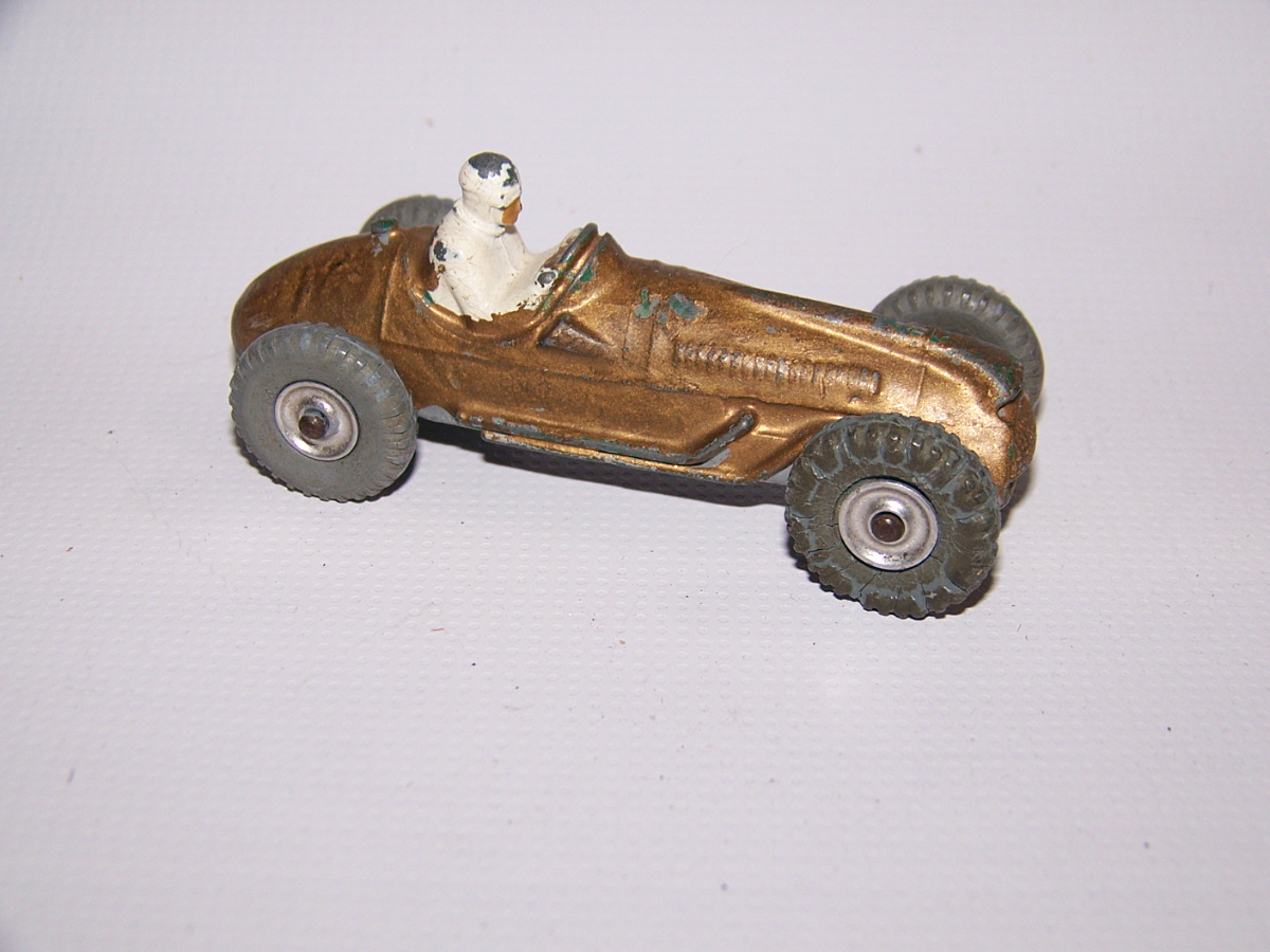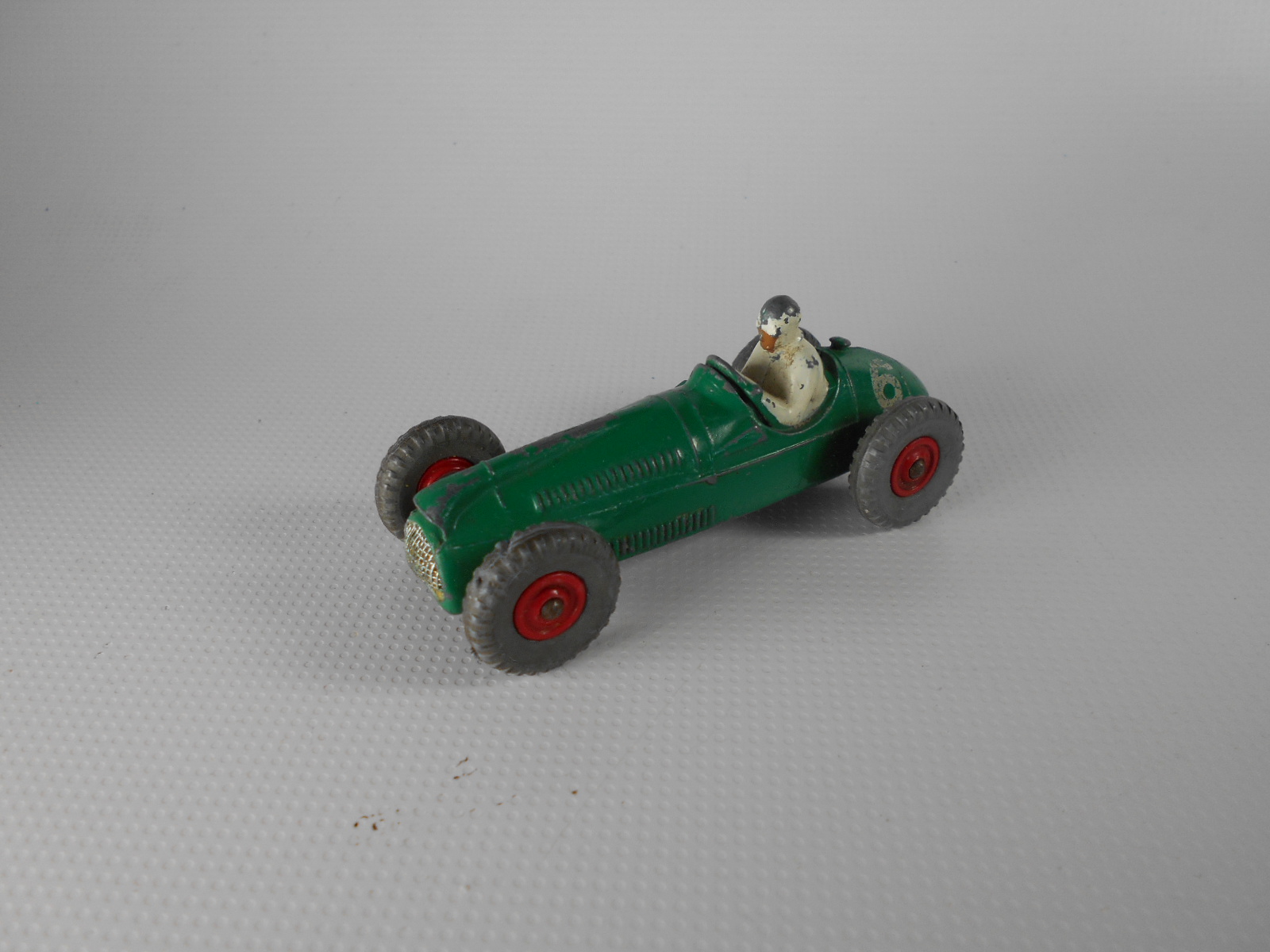 Complete but badly repainted. Hard and cracked rubber tires. Purchased on eBay. The first task will be to disassemble and strip the paint. The strip down was straight forward. The rivets were drilled out using a #43 bit, followed by a larger size to break the rivet top. Care was taken to ensure the initial hole was centered and breaking the rivet top did not damage the chassis. The choice of a #43 bit was that it could be re-riveted or tapped and screwed. The ends of the axles were tapped flat and the wheels removed. One end of the axle was originally tapped over and this is the end that was tapped flat. A small hammer and anvil is ideal for this. The next stage is to strip the paint and I use aircraft paint stripper. It is very corrosive so no getting it on your hands or breathing in the fumes, but it does work very well. A good wash in soapy water is good enough to prepare for new paint. For some reason the white paint used for the driver was difficult to remove, a little sand blasting may have helped. Casting marks were removed and a coat of primer and several top coats were applied to wheels and body, the base plate recoated in black. A little paint here and there and reassembled using small threaded screws. Needs only the number applied to the sides.