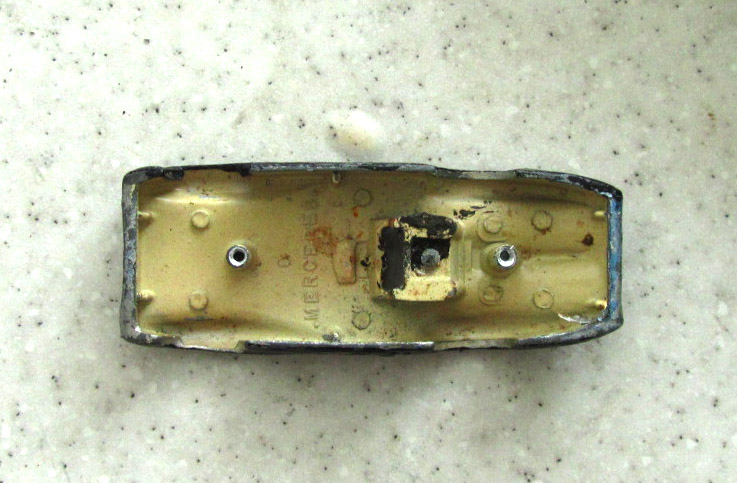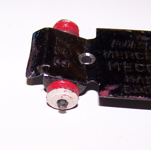 Front end damage, front wheels jammed and a buckled chassis marks this one as a necessary restore. No driver but otherwise complete. Several repaints but the original cream and red hubs. The newer paint was removed with a gentle paint remover hoping to find the number decal. The number was found and it was the standard 30 (see photo). The chassis was removed and straightened and lined up with the body showing only 1cm of body damage. The body was dressed back into shape and the chassis fitted perfectly with the wheels now turning freely.