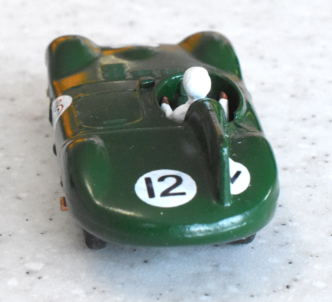 Undergoing Restoration The chassis was buckled and one of the blue plastic wheels was cracked and all loose on the axles and no steering wheel. A full strip down was done, removing the hubs and axles. Paint stripped and chassis straightened photography picks out blemishes too well but we will see after paint is applied. I finished this with numbers as on the Stirling Moss Jaguar. With a custom box bearing the completed restoration.