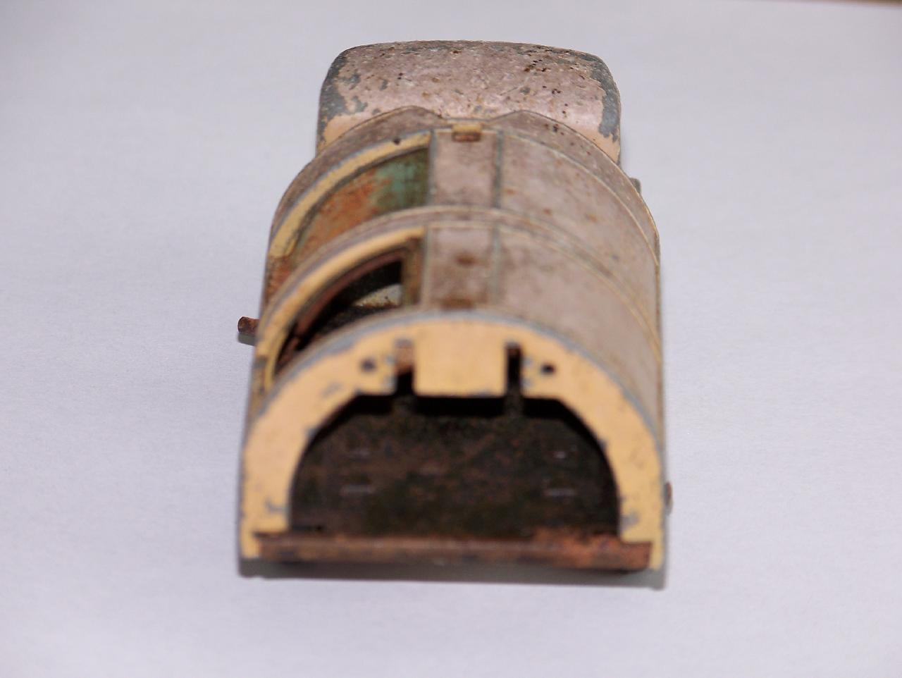 Complete with all parts and unbroken but needed some loving attention. First stage, as always, to strip it down to the component parts. The restore was quite a challenge. There are a few secrets hidden away for anyone tempting to restore this model. The winding mechanism needed some attention, the chassis was bent, the guides for the shutters had to be fitted and gapped to allow the shutters to glide properly. The rear door should have been fitted before the shutter guides. I may include a guide for the winding mechanism restoration at some point. Easy once you have done it once. I chose to give it a different paint job just to make it more distinctive and may add some decals to finish it off.