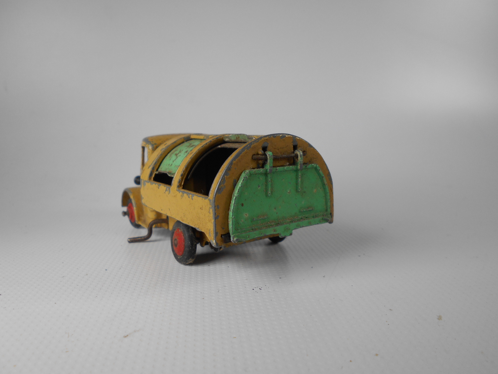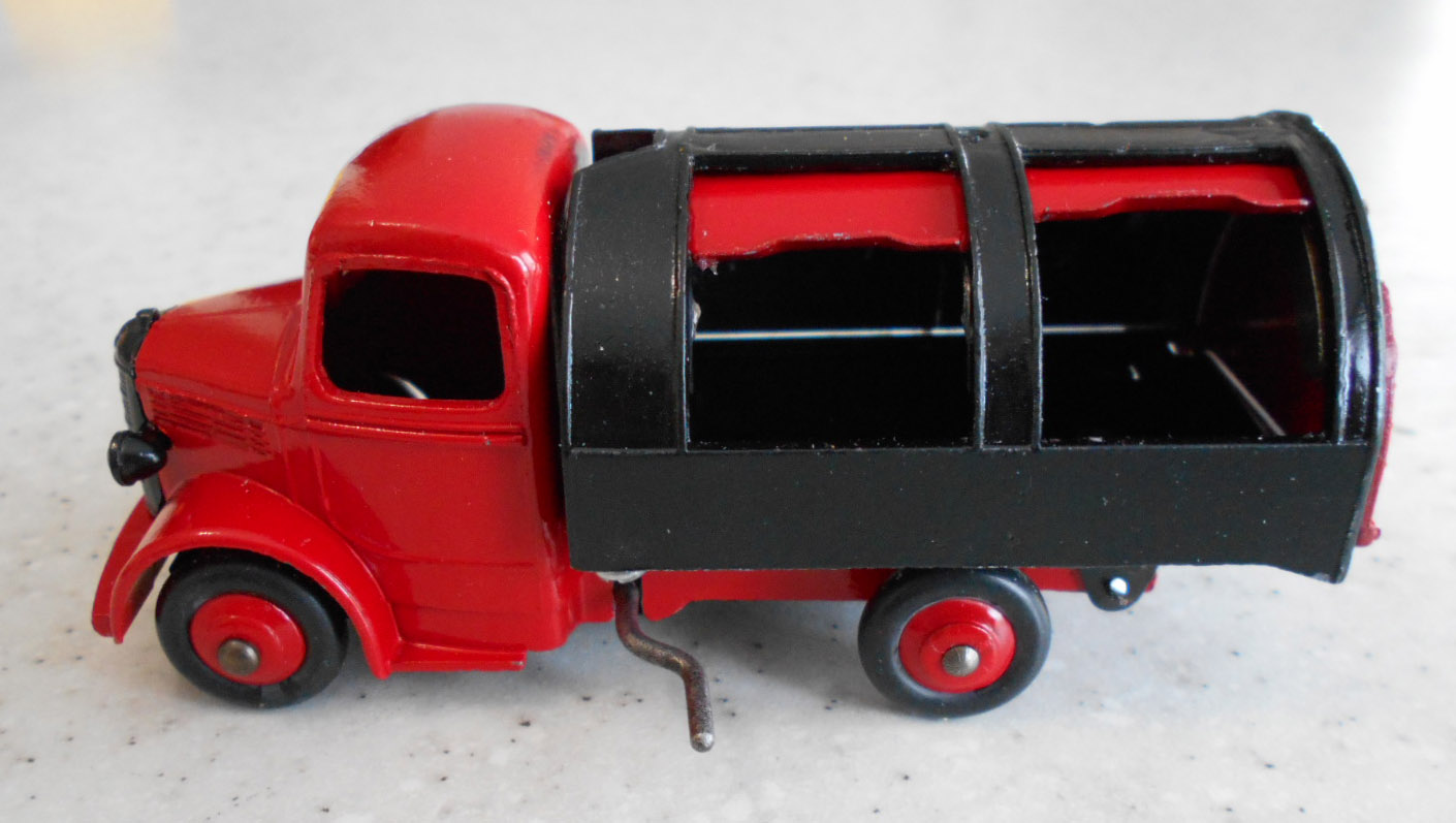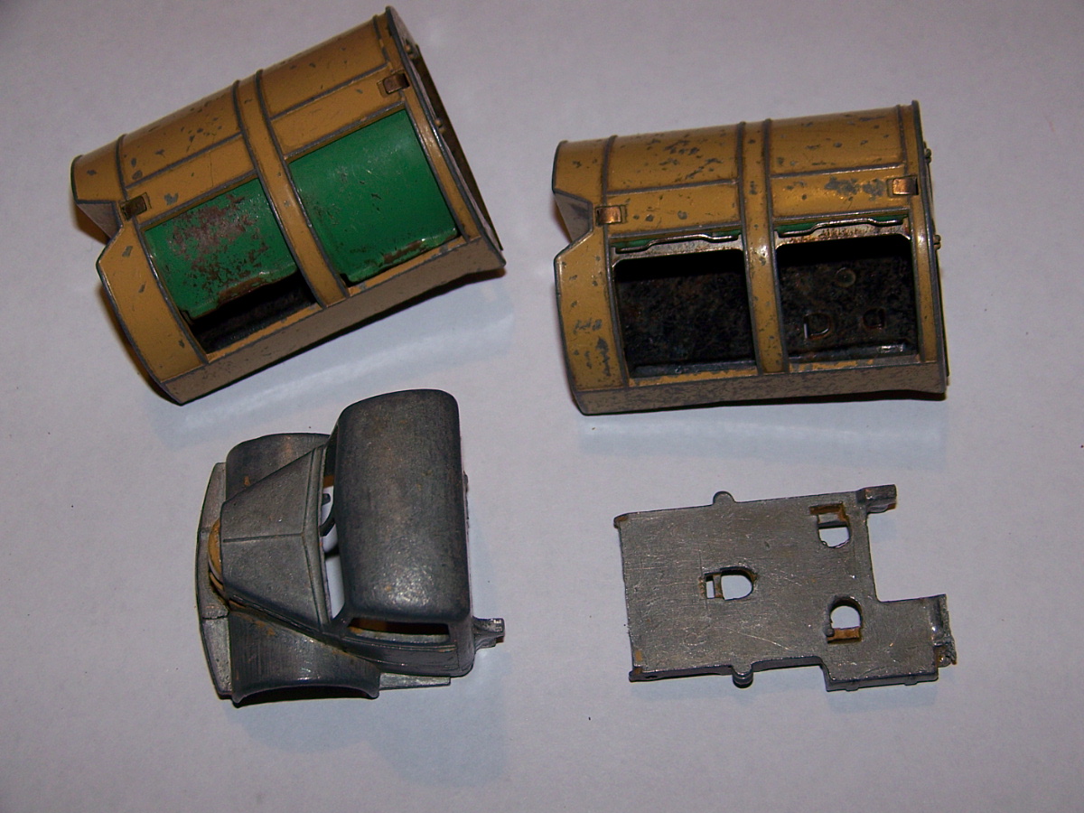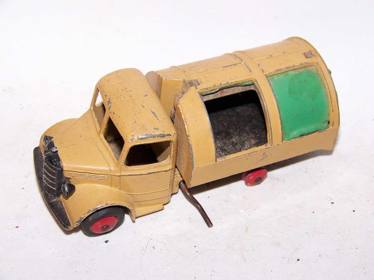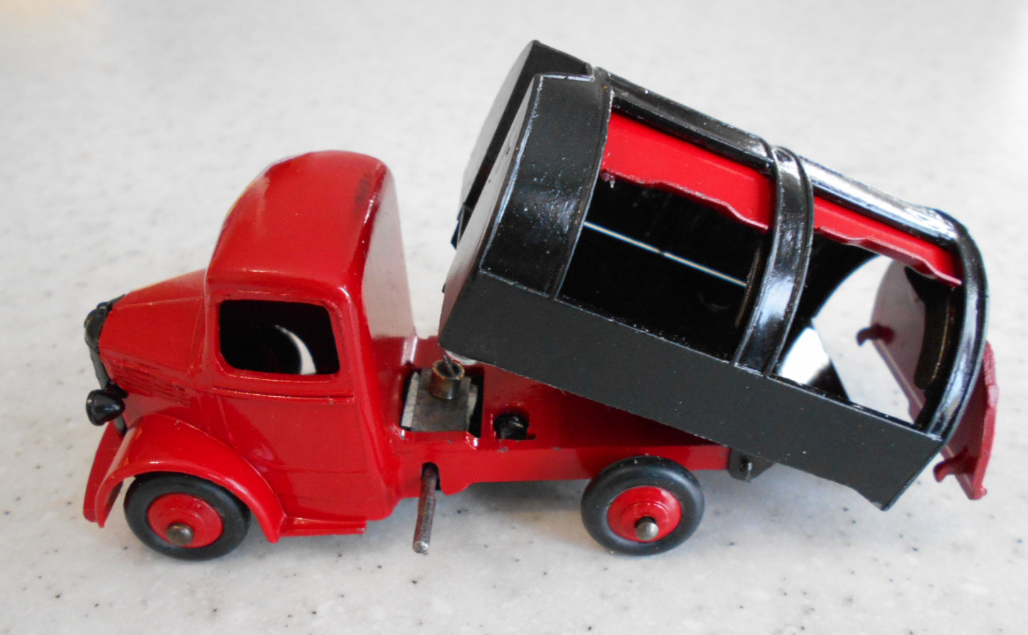Well in need of restoration, this Bedford Refuse Truck totally scabby and the tipper winder seized, back door missing, very rough condition. The strip down was tricky as I wanted not to destroy the winder mechanism. Without the box being elevated the tabs on the base could not be released and therefore the winder could not be released. However, I did find that the base of the box could be removed and thus access to the tabs on the base. A hook was used to pull the tabs and the winder gear could be wriggled free. The winder gear was then soaked in WD40 for an hour or so and gentle twisting freed up the gear. Never be in a hurry to strip down and never use force on the gears. Gentle persuasion is all that is needed and it is quite rewarding to have it all working again. The radiator/headlamp unit was prized forward to release it. In the meantime, the paint was stripped from the body and chassis and rough spots rubbed down. The tin parts have yet to be cleaned before reassembly. Tips: The baseplate and chassis was drilled and the chassis tapped to take a 4-40 screw rather than reuse the tabs so that it could be taken apart again. The slider bracket was fastened to the body using a 4-40 screw after drilling and tapping the body. This can be easily seen in the picture and needs to be properly finished. The radiator was stuck in place using household goop. The rear door is missing and I am trying to source this, any ideas? All repainted and assembled.