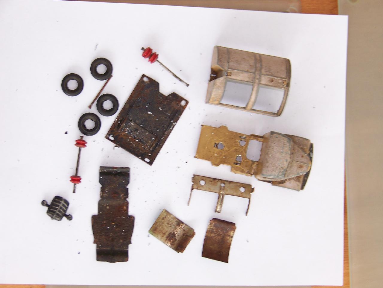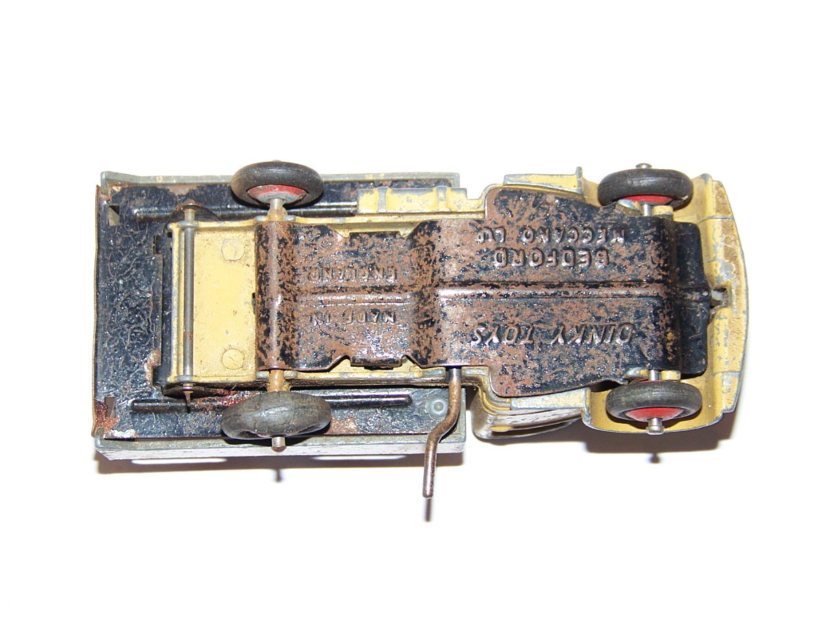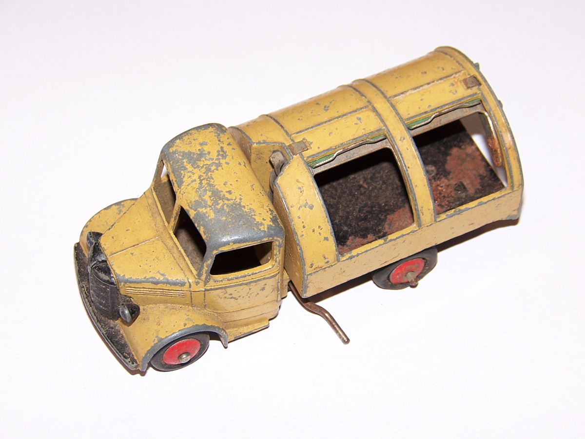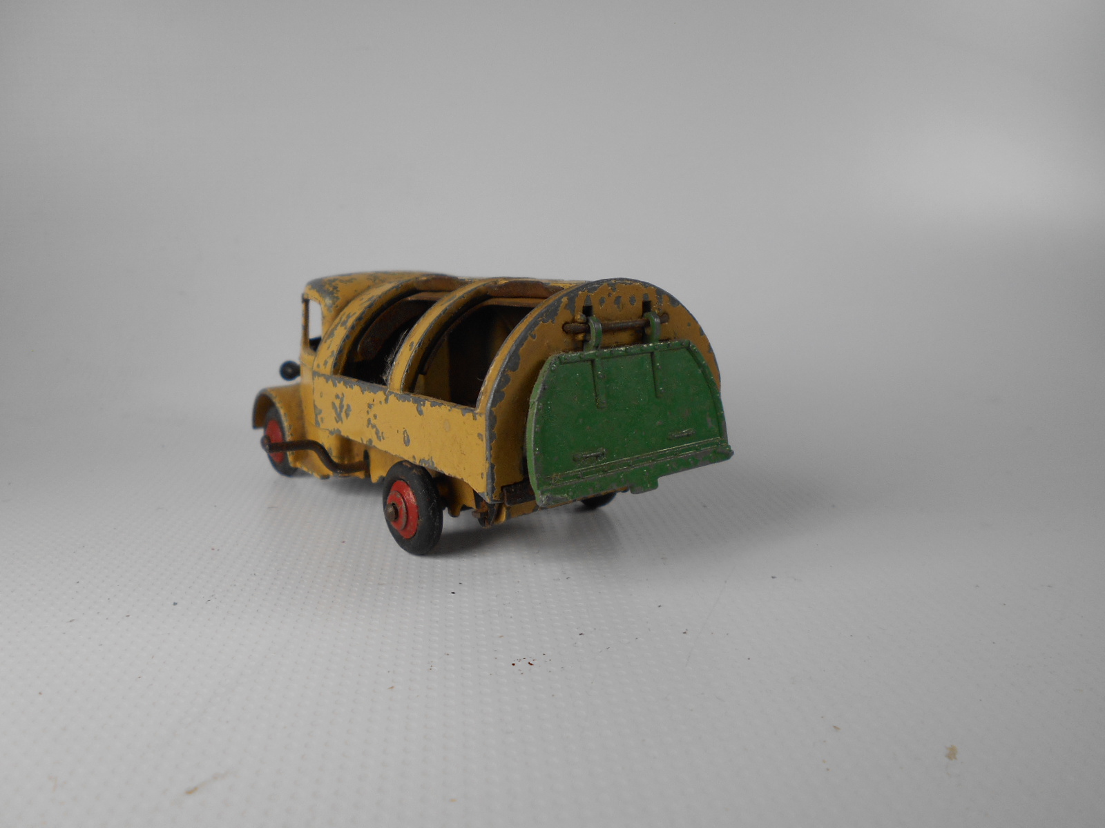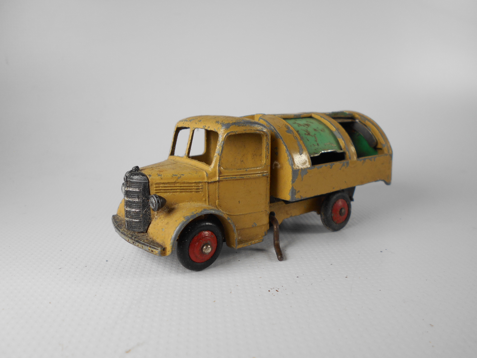 Well in need of restoration, this Bedford Refuse Truck totally scabby and the tipper winder seized, back door missing, very rough condition. The strip down was tricky as I wanted not to destroy the winder mechanism. Without the box being elevated the tabs on the base could not be released and therefore the winder could not be released. However, I did find that the base of the box could be removed and thus access to the tabs on the base. A hook was used to pull the tabs and the winder gear could be wriggled free. The winder gear was then soaked in WD40 for an hour or so and gentle twisting freed up the gear. Never be in a hurry to strip down and never use force on the gears. Gentle persuasion is all that is needed and it is quite rewarding to have it all working again. The radiator/headlamp unit was prized forward to release it. In the meantime, the paint was stripped from the body and chassis and rough spots rubbed down. The tin parts have yet to be cleaned before reassembly. Tips: The baseplate and chassis was drilled and the chassis tapped to take a 4-40 screw rather than reuse the tabs so that it could be taken apart again. The slider bracket was fastened to the body using a 4-40 screw after drilling and tapping the body. This can be easily seen in the picture and needs to be properly finished. The radiator was stuck in place using household goop. The rear door is missing and I am trying to source this, any ideas? All repainted and assembled.