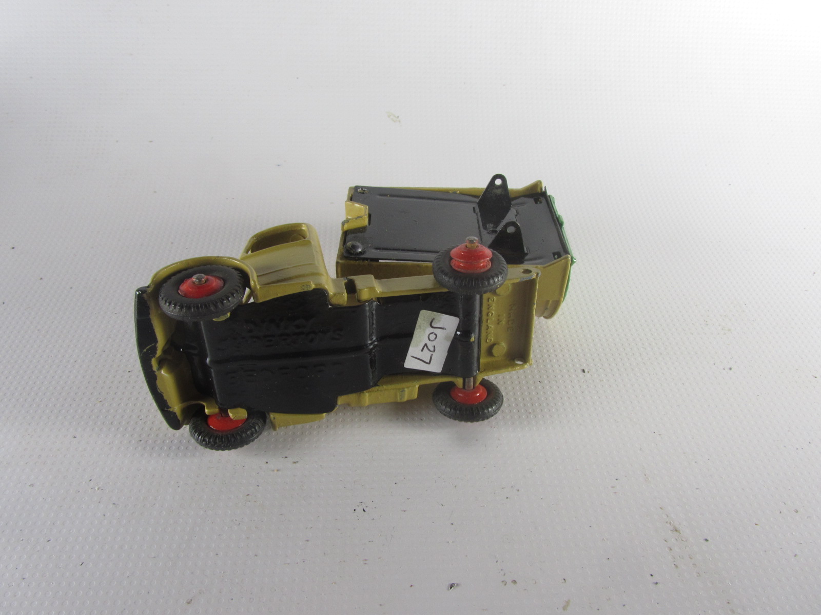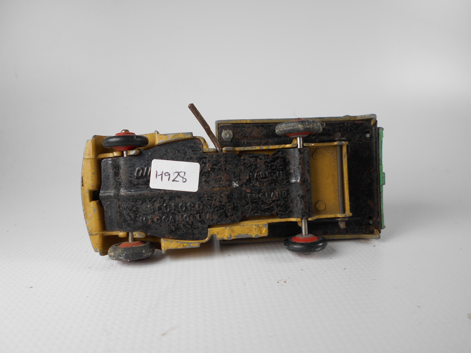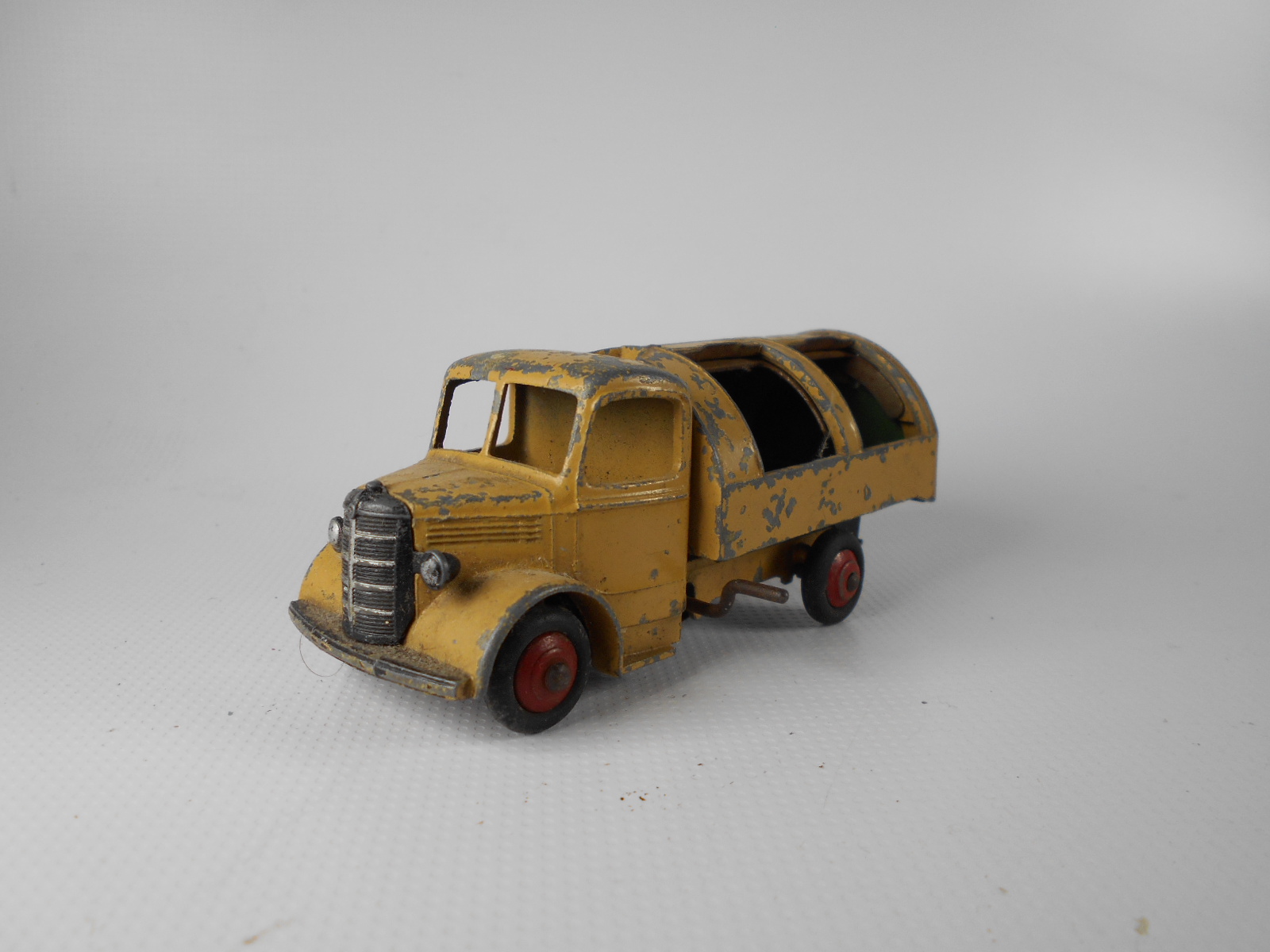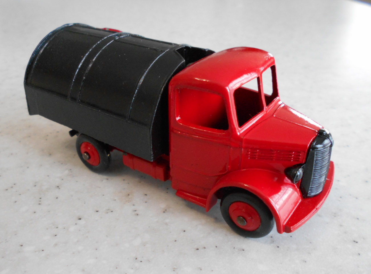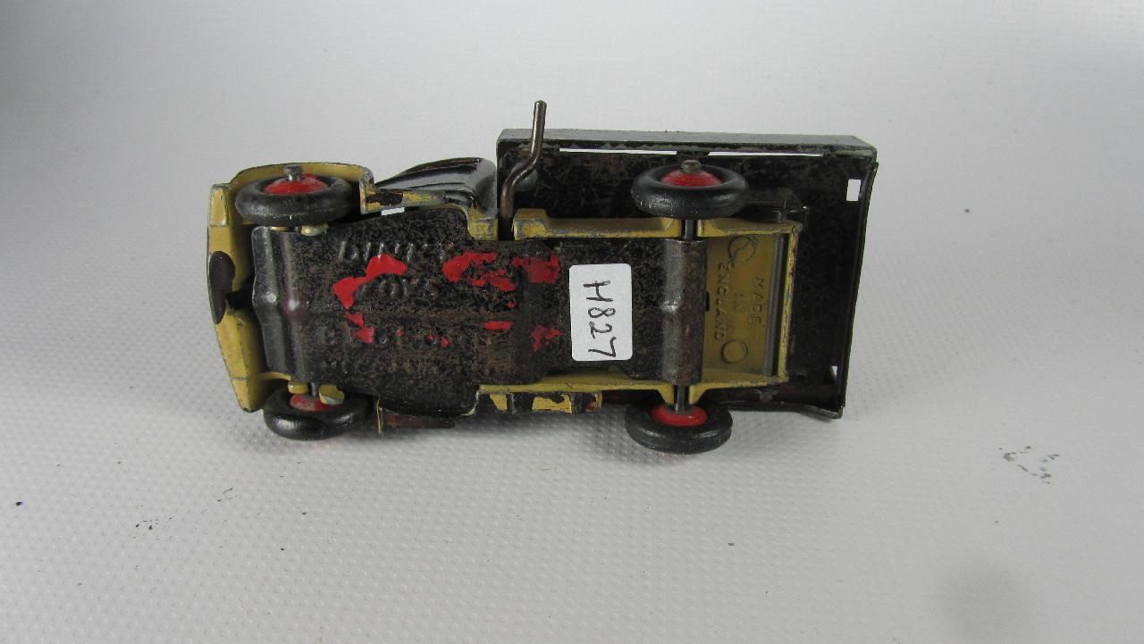 Well in need of restoration, this Bedford Refuse Truck totally scabby and the tipper winder seized, back door missing, very rough condition. The strip down was tricky as I wanted not to destroy the winder mechanism. Without the box being elevated the tabs on the base could not be released and therefore the winder could not be released. However, I did find that the base of the box could be removed and thus access to the tabs on the base. A hook was used to pull the tabs and the winder gear could be wriggled free. The winder gear was then soaked in WD40 for an hour or so and gentle twisting freed up the gear. Never be in a hurry to strip down and never use force on the gears. Gentle persuasion is all that is needed and it is quite rewarding to have it all working again. The radiator/headlamp unit was prized forward to release it. In the meantime, the paint was stripped from the body and chassis and rough spots rubbed down. The tin parts have yet to be cleaned before reassembly. Tips: The baseplate and chassis was drilled and the chassis tapped to take a 4-40 screw rather than reuse the tabs so that it could be taken apart again. The slider bracket was fastened to the body using a 4-40 screw after drilling and tapping the body. This can be easily seen in the picture and needs to be properly finished. The radiator was stuck in place using household goop. The rear door is missing and I am trying to source this, any ideas? All repainted and assembled.