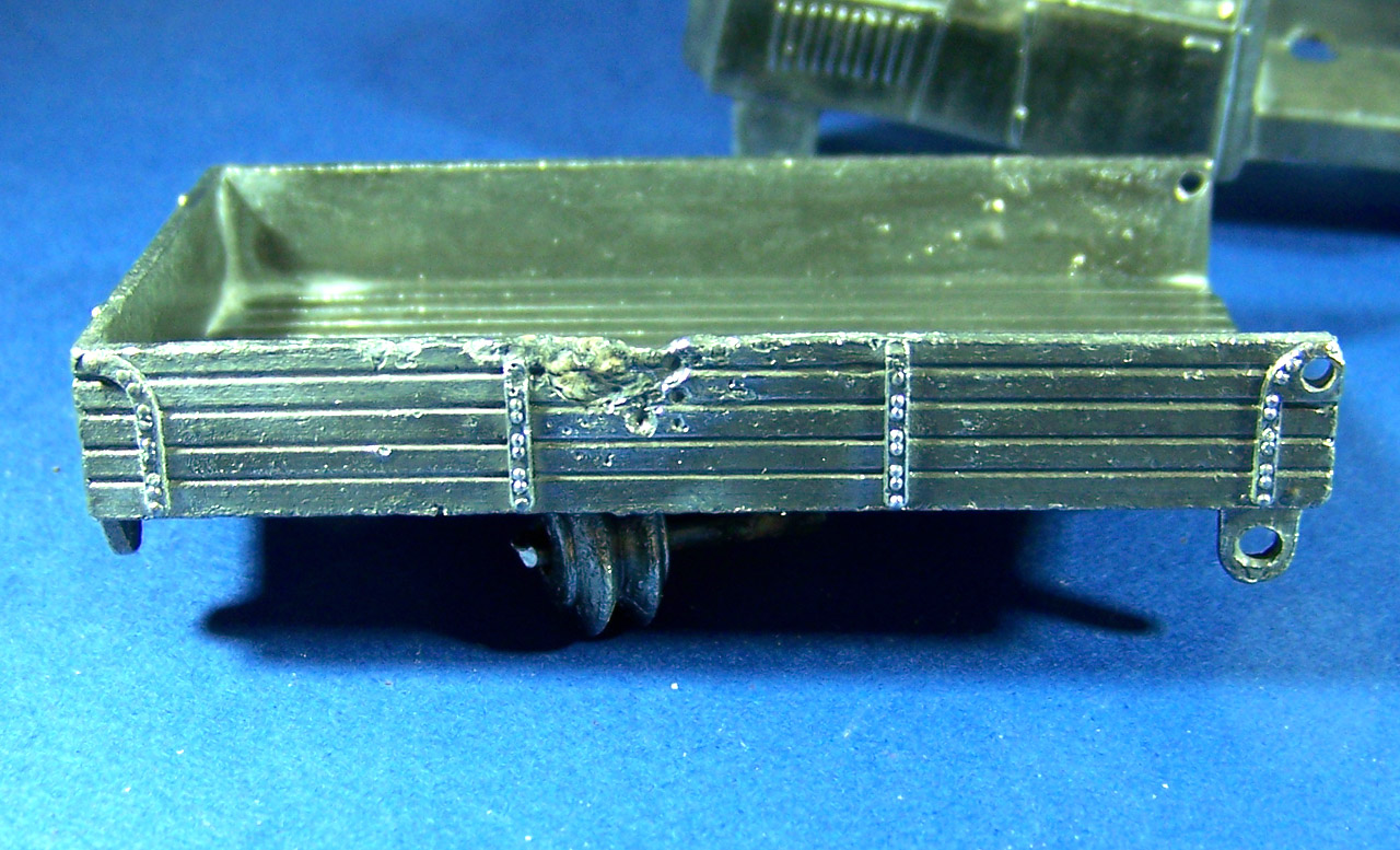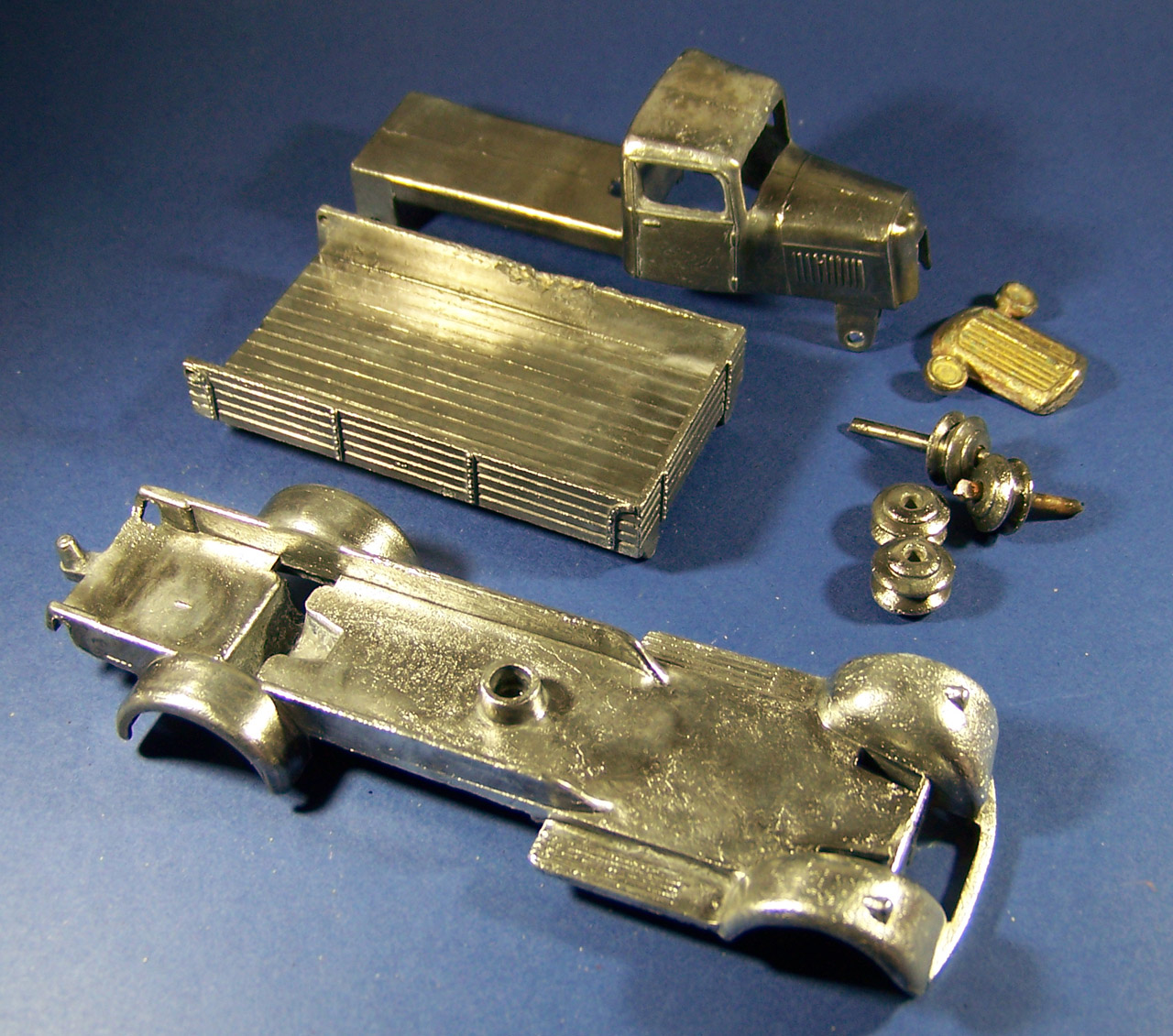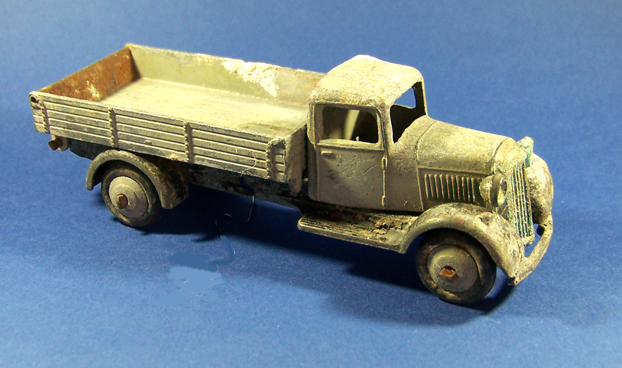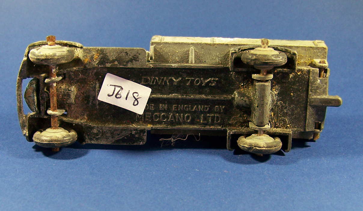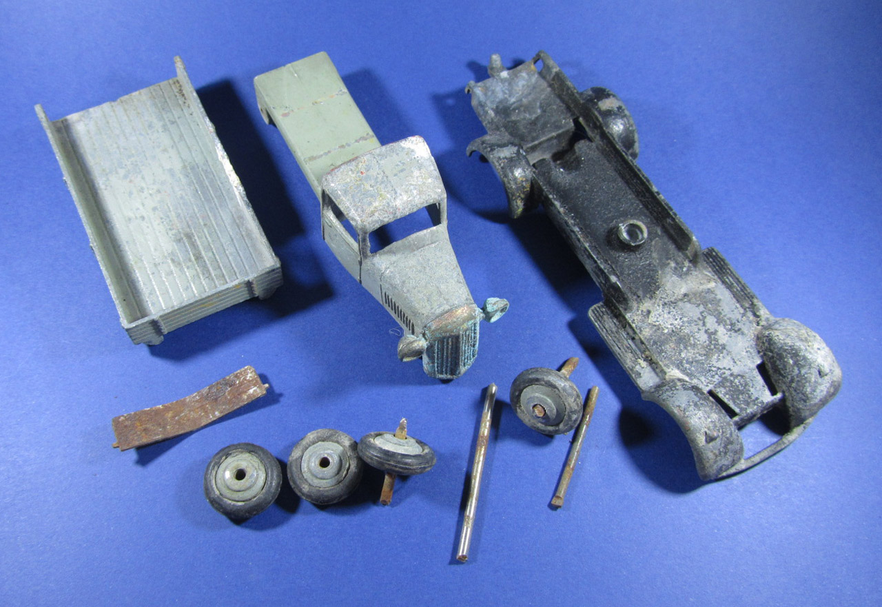 Corroded but complete with hand made rear flap. Wheels corroded onto the axles. Ripe for restoration.