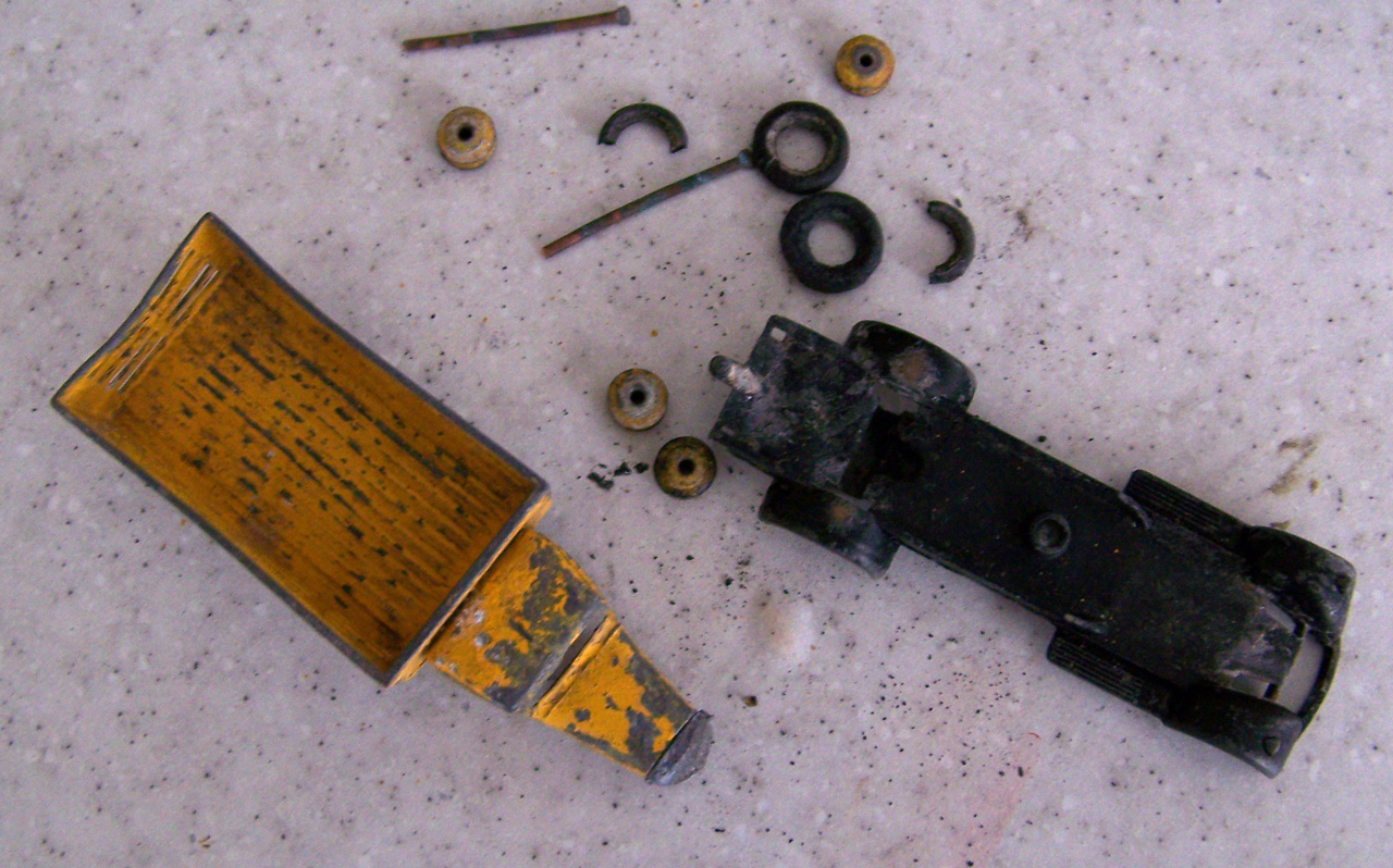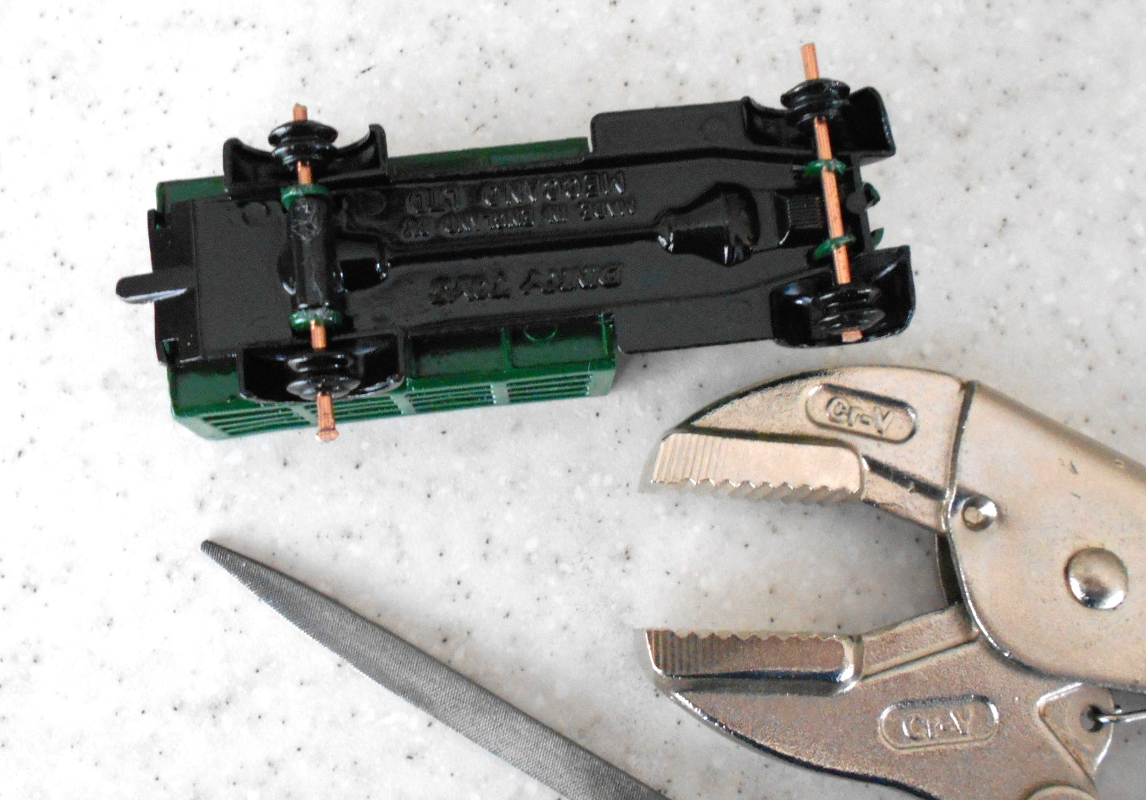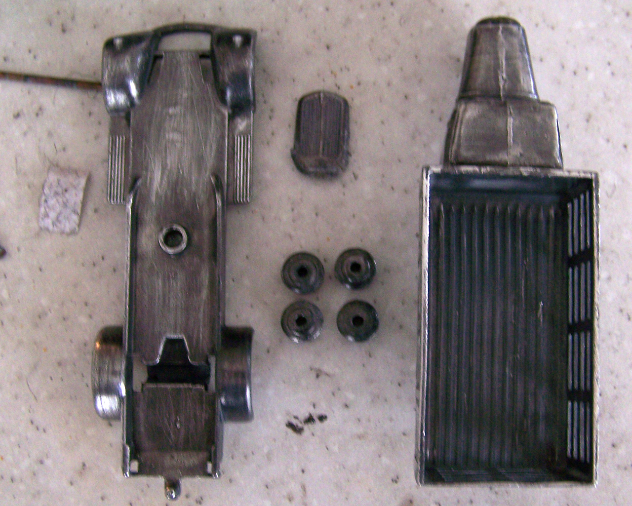 Badly corroded sides, broken grille. I am including the repair to the corrosion that was done using JB Weld KwickWeld, a steel reinforced epoxy. Great stuff for such repairs. Repainted, 3D printed grille, and new axles.