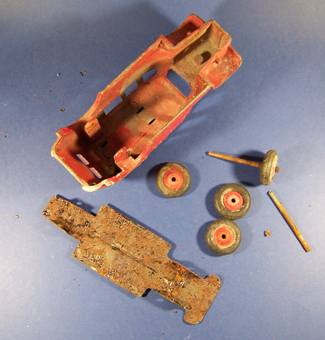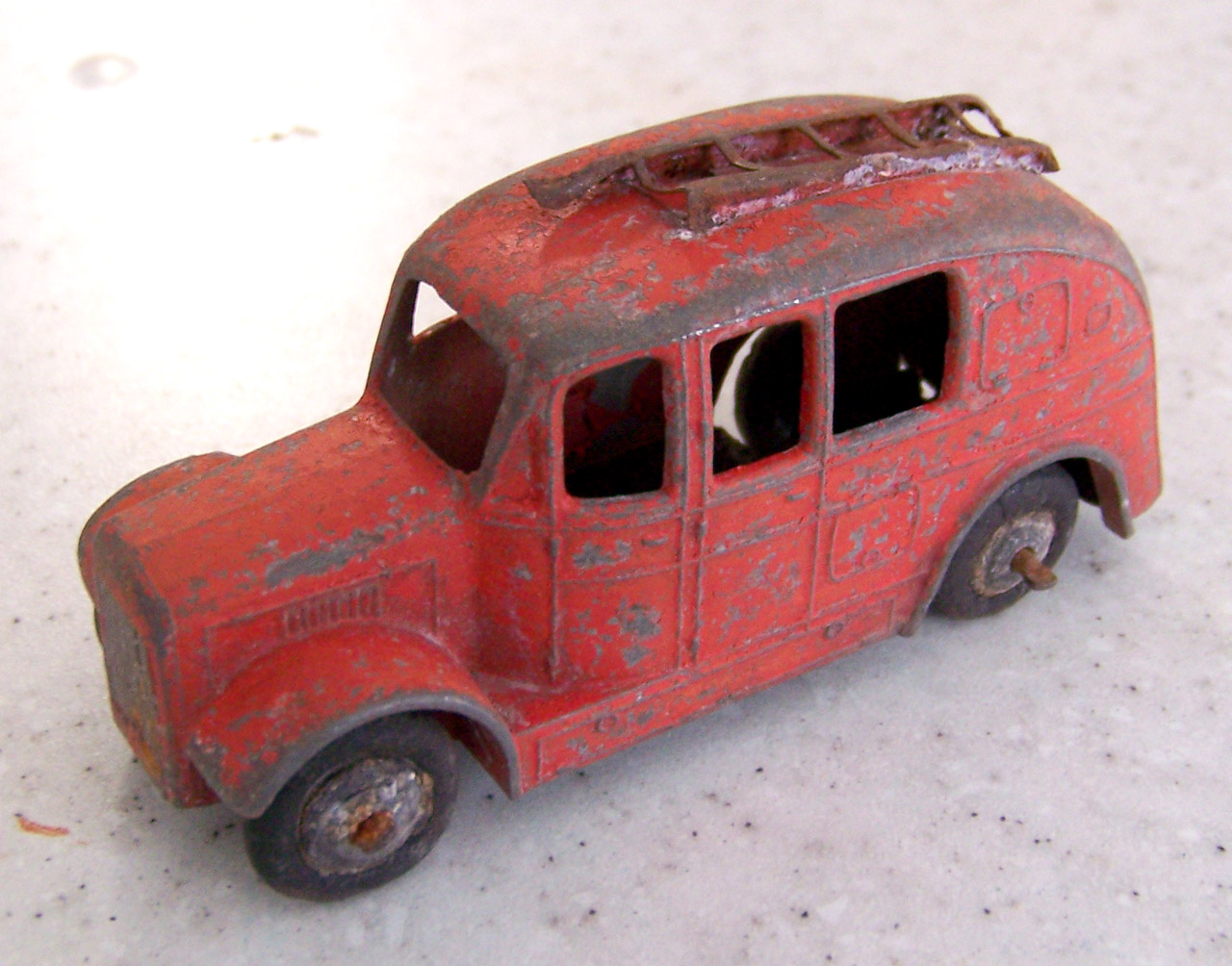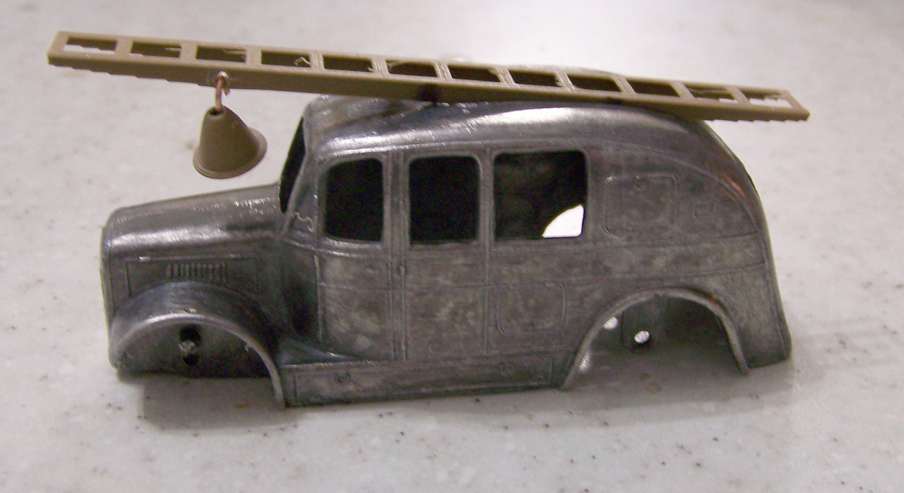 Time for a makeover on this fire engine. Fairly common so a change will not hurt. The strip down was quite straightforward but some corrosion was found as shown. A little metal epoxy fixed that.