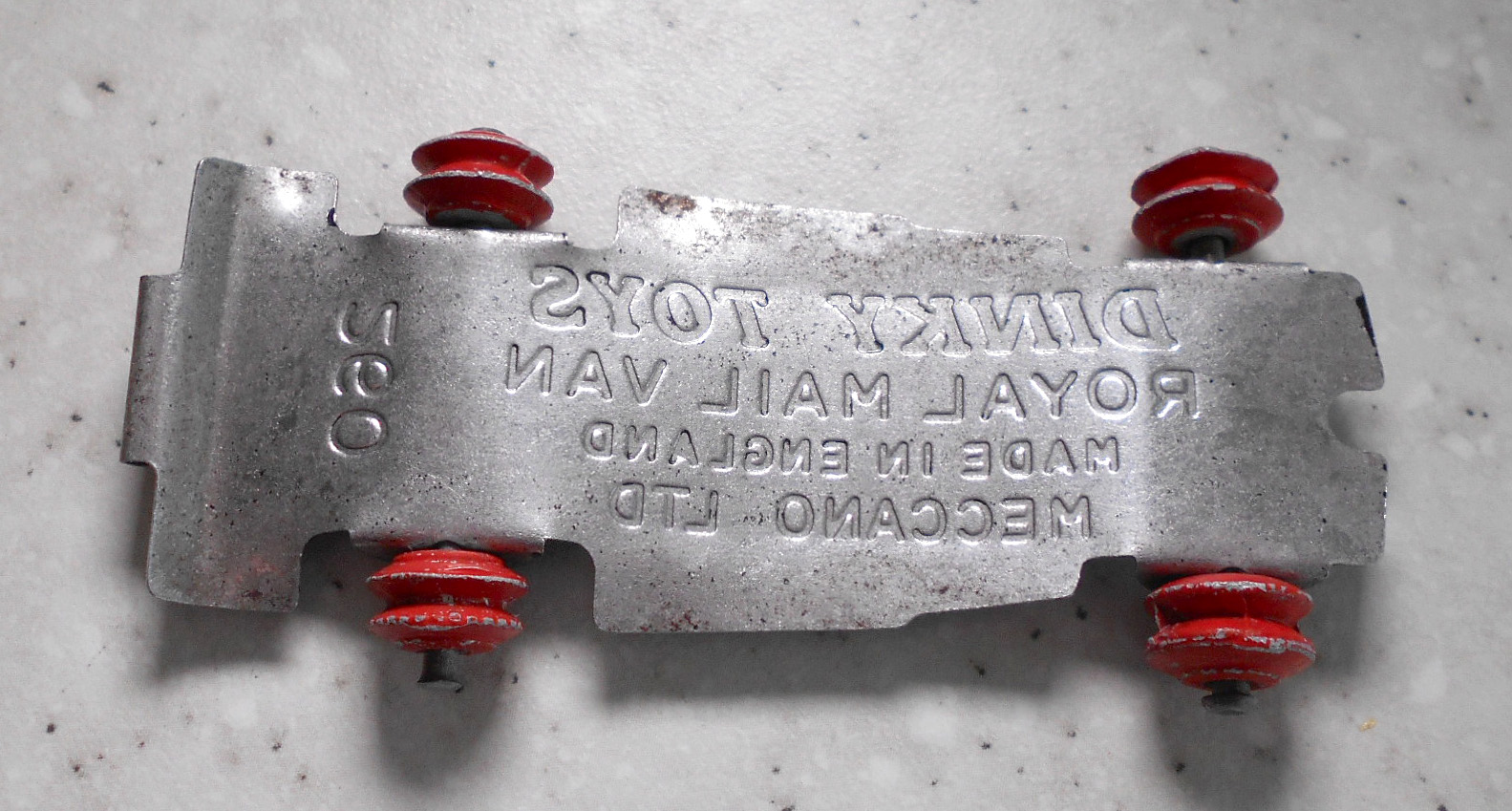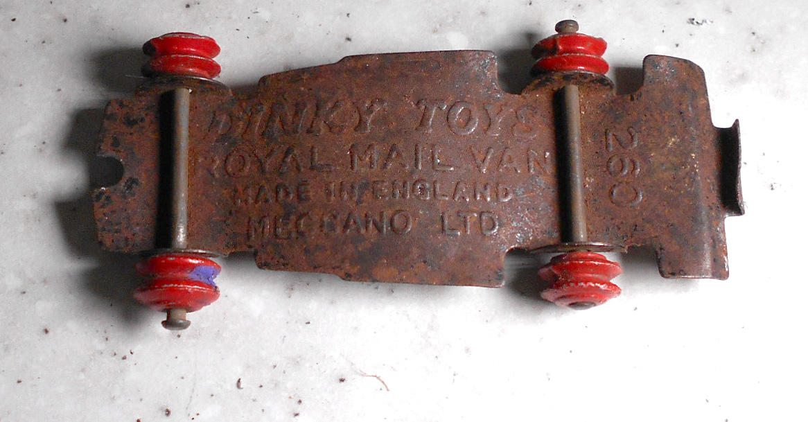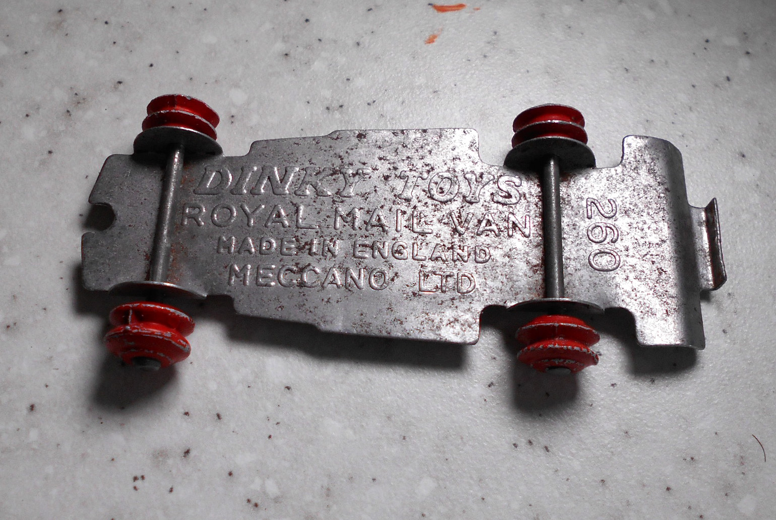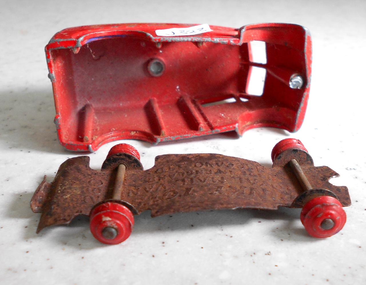 Sometimes you have to decide if the model requires a repair or complete renovation. If the model is not rare but the paintwork is three quarters good, maybe it should just be cleaned. This one had not bad paint, fair decals, but a rusty chassis. So I decided to repair just the chassis. Removal is the regular procedure and the bonus is that there is just one rivet. The chassis was rusty and twisted. An overnight soak in vinegar and a brush with comet cleaned things up very well. Light use of a soft hammer and some twisting got the chassis in fair shape. I could have removed the axles but I wanted to keep the model as original as possible. Mask the wheels and two coats of gloss black finished this project. The body was given a good clean and made it quite presentable.
