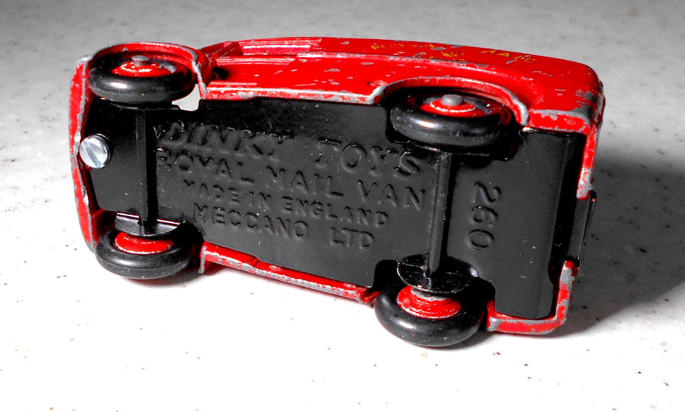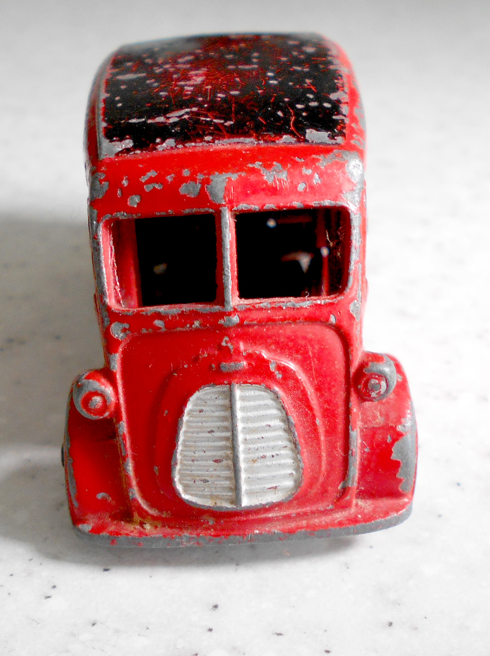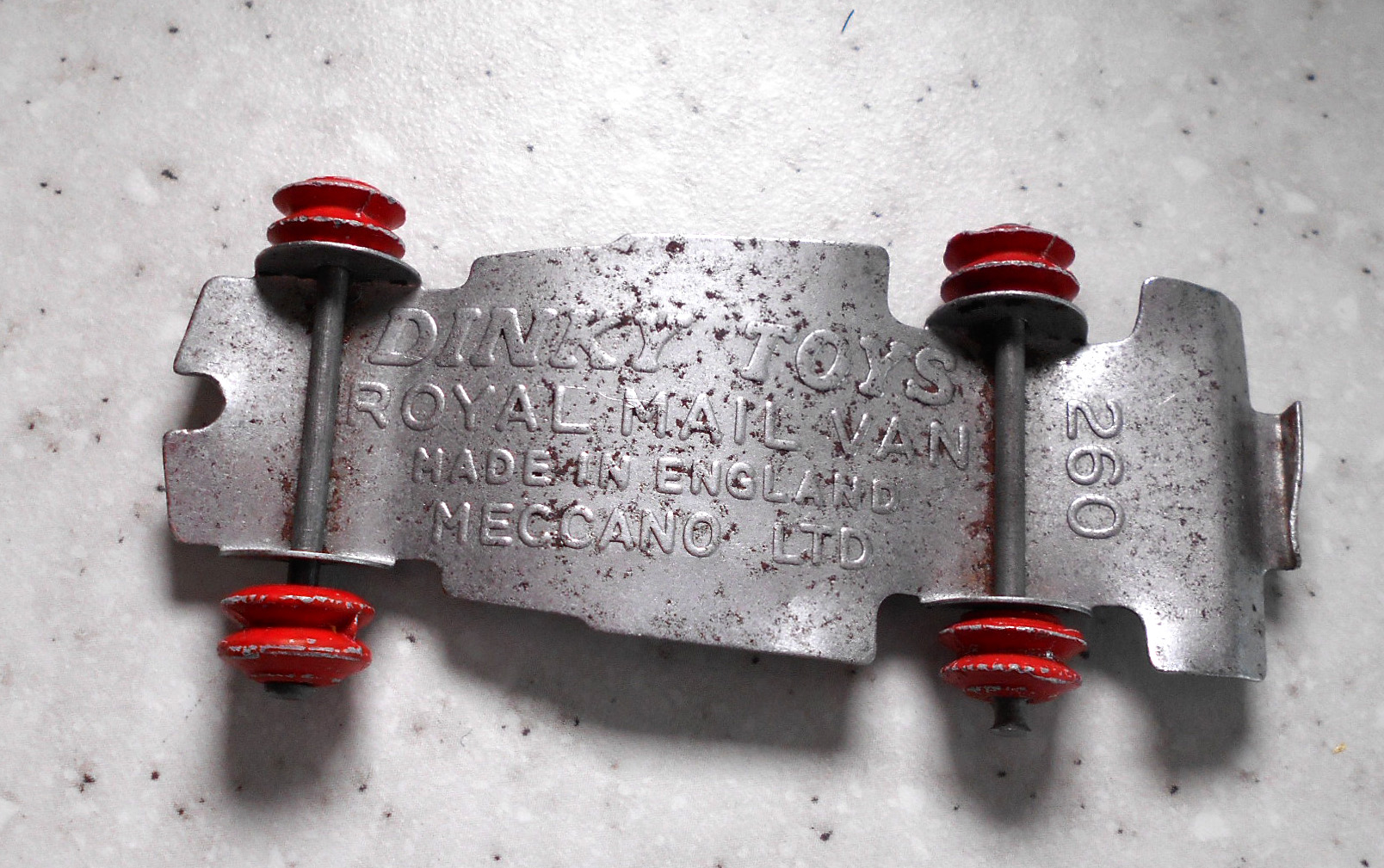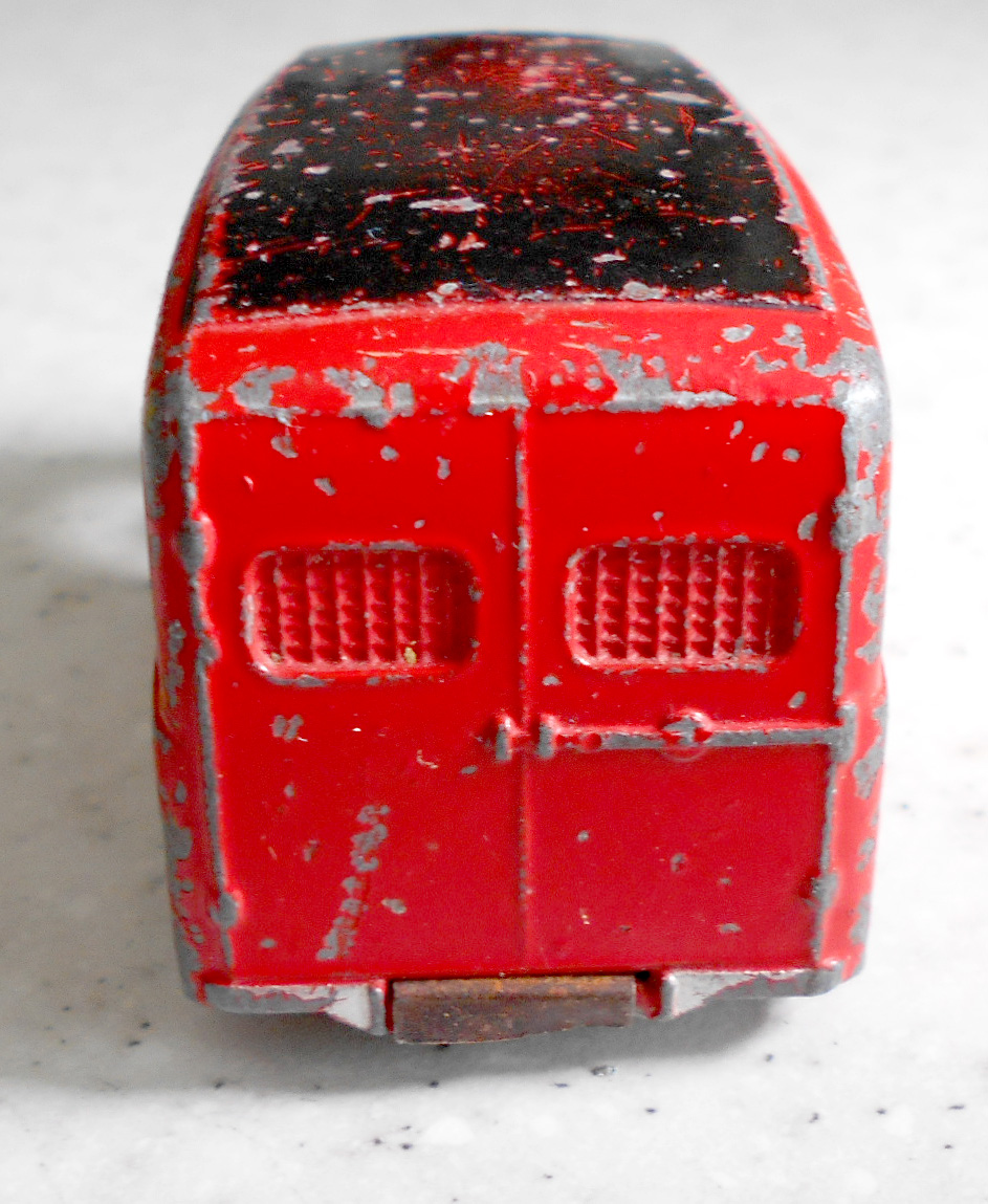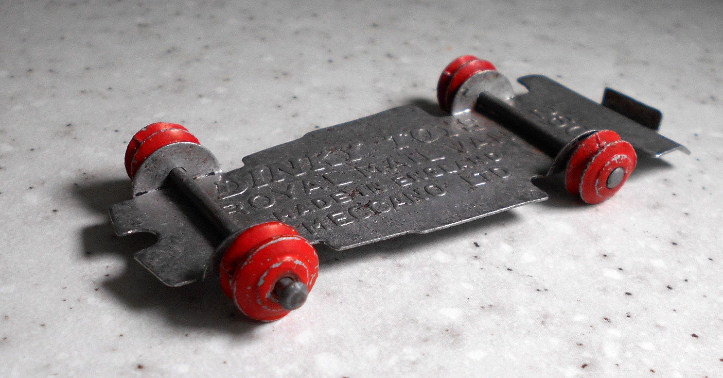 Sometimes you have to decide if the model requires a repair or complete renovation. If the model is not rare but the paintwork is three quarters good, maybe it should just be cleaned. This one had not bad paint, fair decals, but a rusty chassis. So I decided to repair just the chassis. Removal is the regular procedure and the bonus is that there is just one rivet. The chassis was rusty and twisted. An overnight soak in vinegar and a brush with comet cleaned things up very well. Light use of a soft hammer and some twisting got the chassis in fair shape. I could have removed the axles but I wanted to keep the model as original as possible. Mask the wheels and two coats of gloss black finished this project. The body was given a good clean and made it quite presentable.
