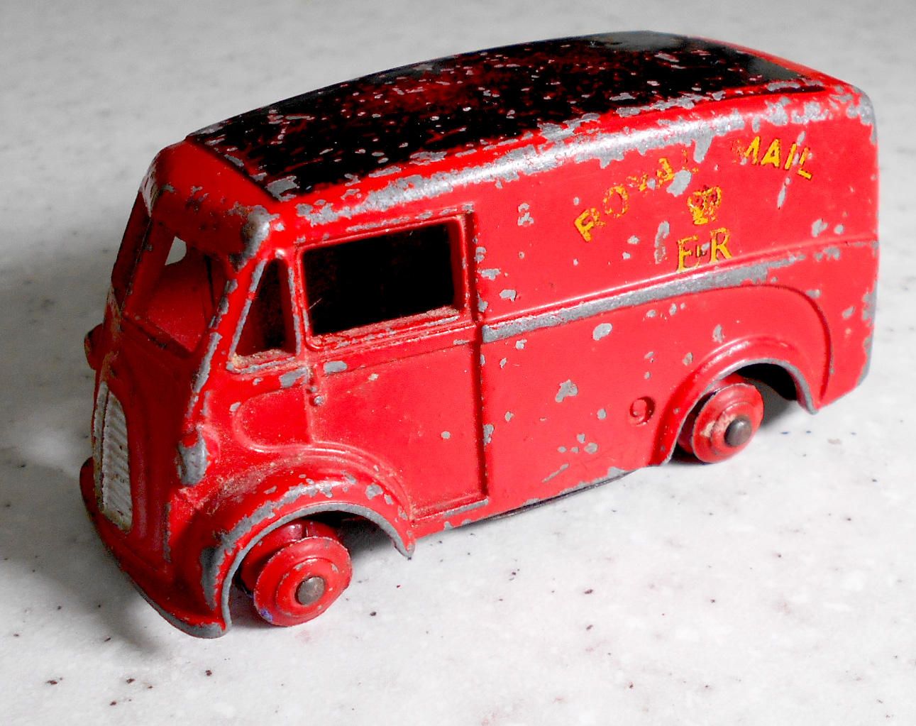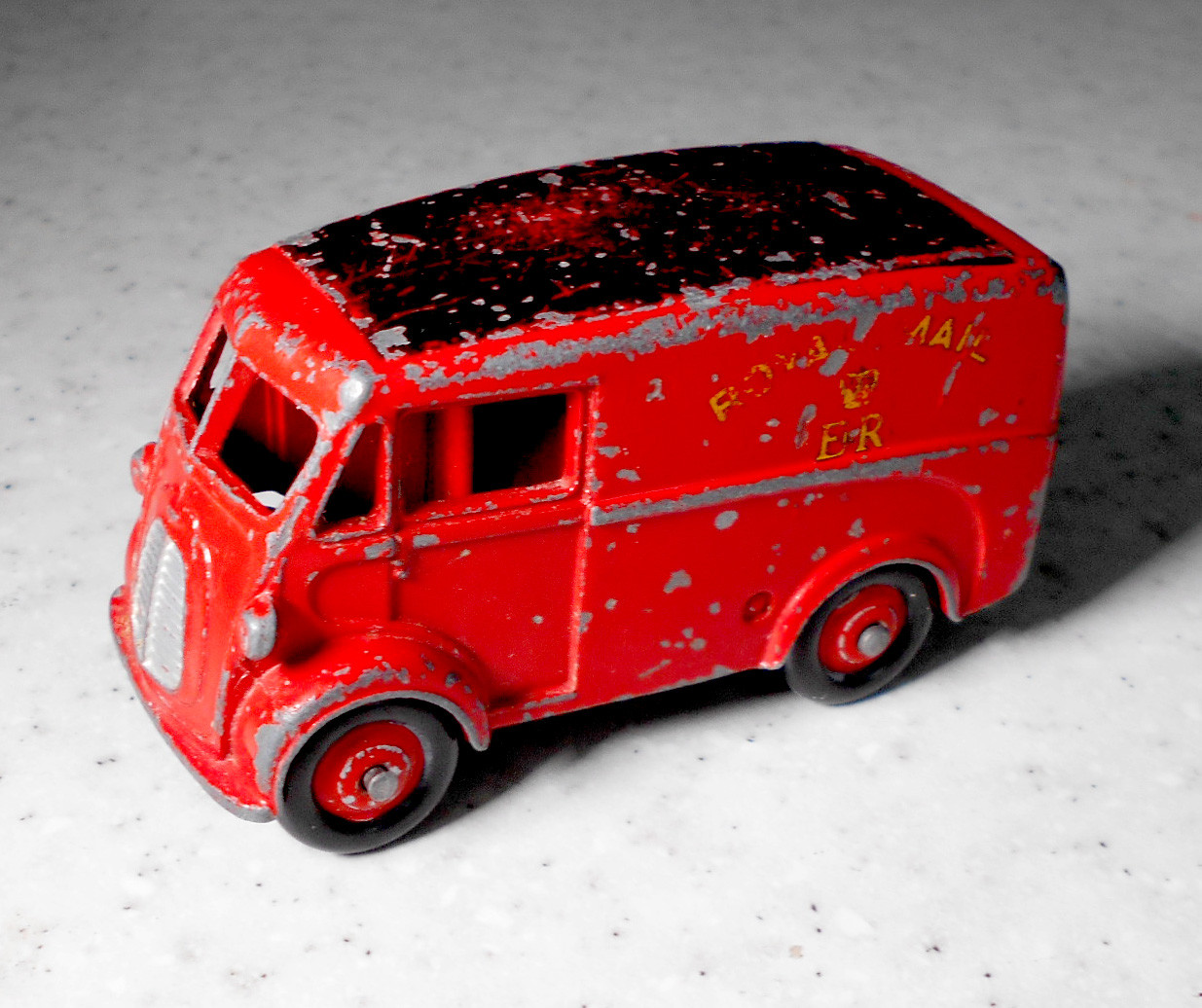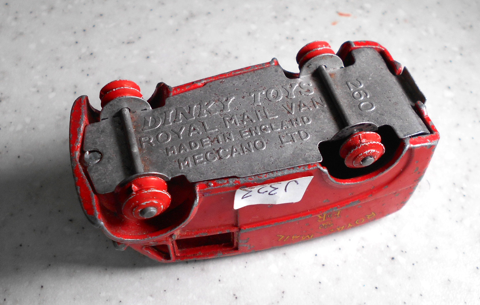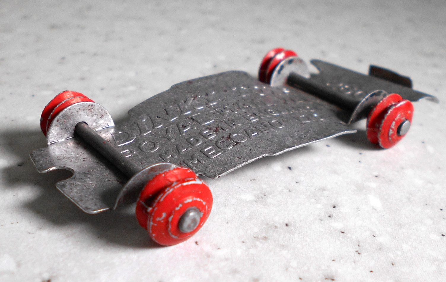 Sometimes you have to decide if the model requires a repair or complete renovation. If the model is not rare but the paintwork is three quarters good, maybe it should just be cleaned. This one had not bad paint, fair decals, but a rusty chassis. So I decided to repair just the chassis. Removal is the regular procedure and the bonus is that there is just one rivet. The chassis was rusty and twisted. An overnight soak in vinegar and a brush with comet cleaned things up very well. Light use of a soft hammer and some twisting got the chassis in fair shape. I could have removed the axles but I wanted to keep the model as original as possible. Mask the wheels and two coats of gloss black finished this project. The body was given a good clean and made it quite presentable.