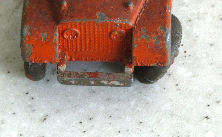 Well worn and played with, typical broken front bumper and windscreen. Otherwise solid. Strip down and repair to the bumper and fabricated new windscreen and then a repaint to the original colors. New tires fitted, screen fabricated and looking as good as new.
