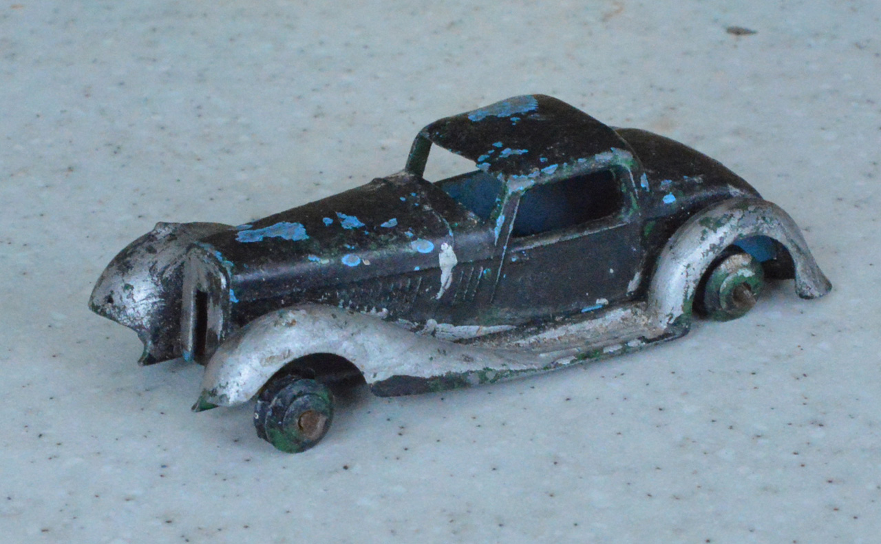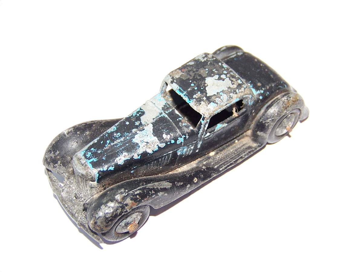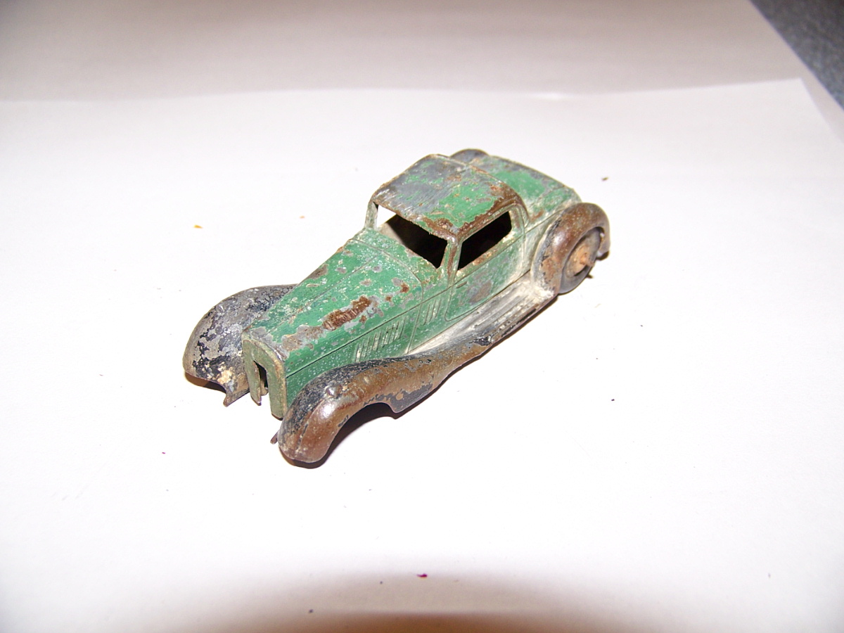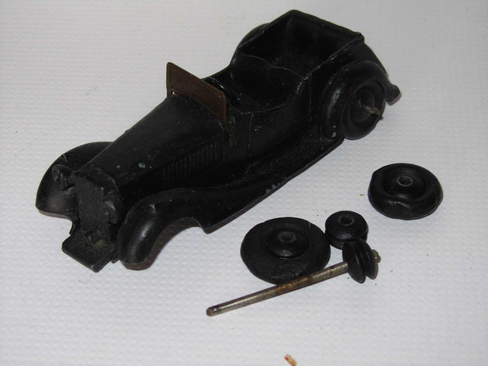 Overpainted missing radiator and headlamps, bent front fender, otherwise sound.