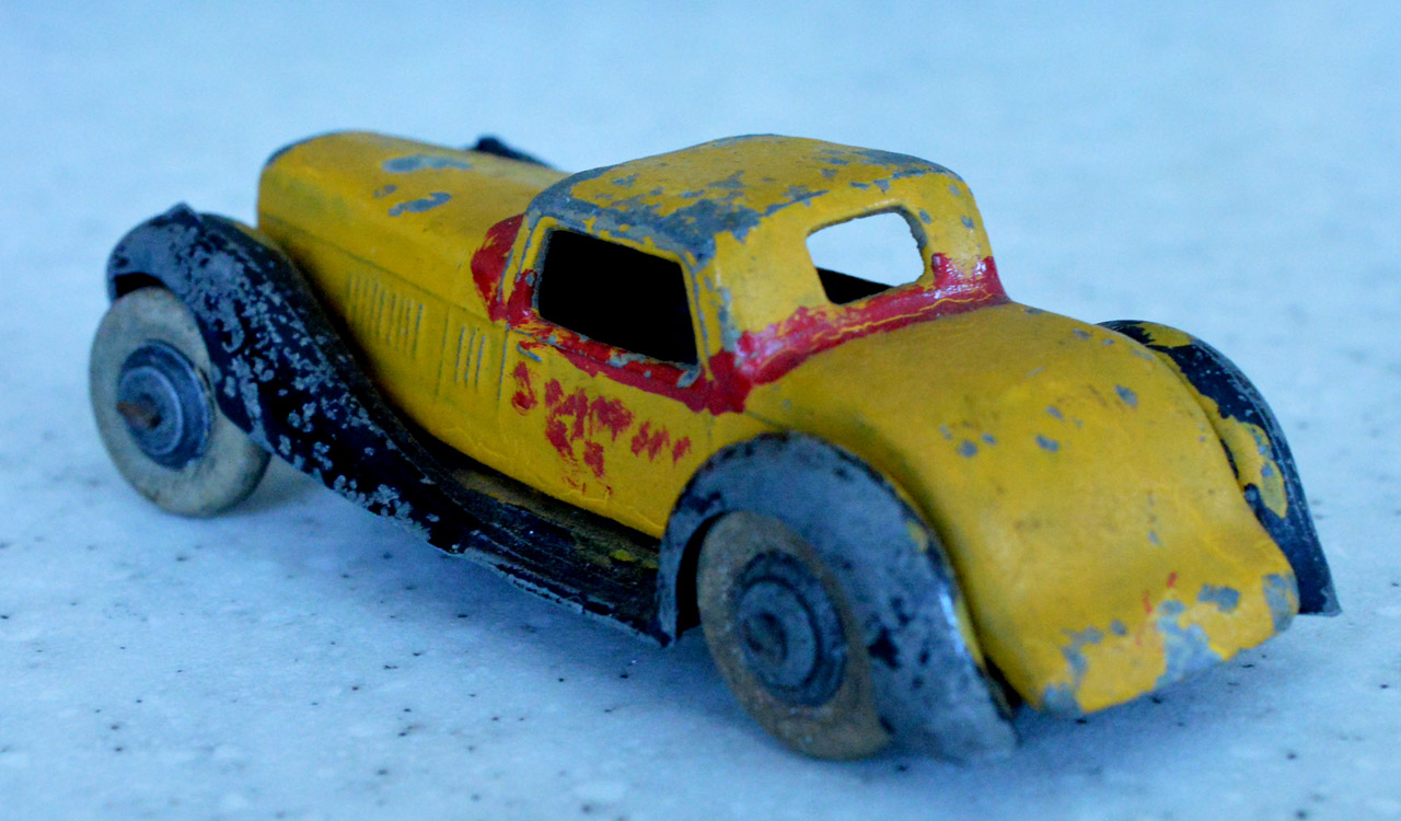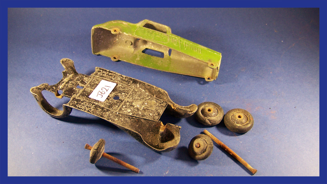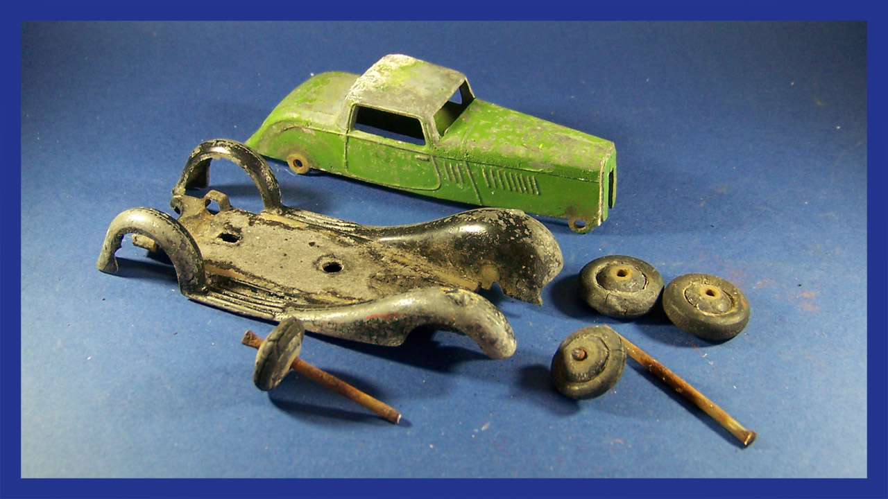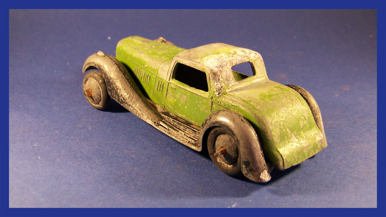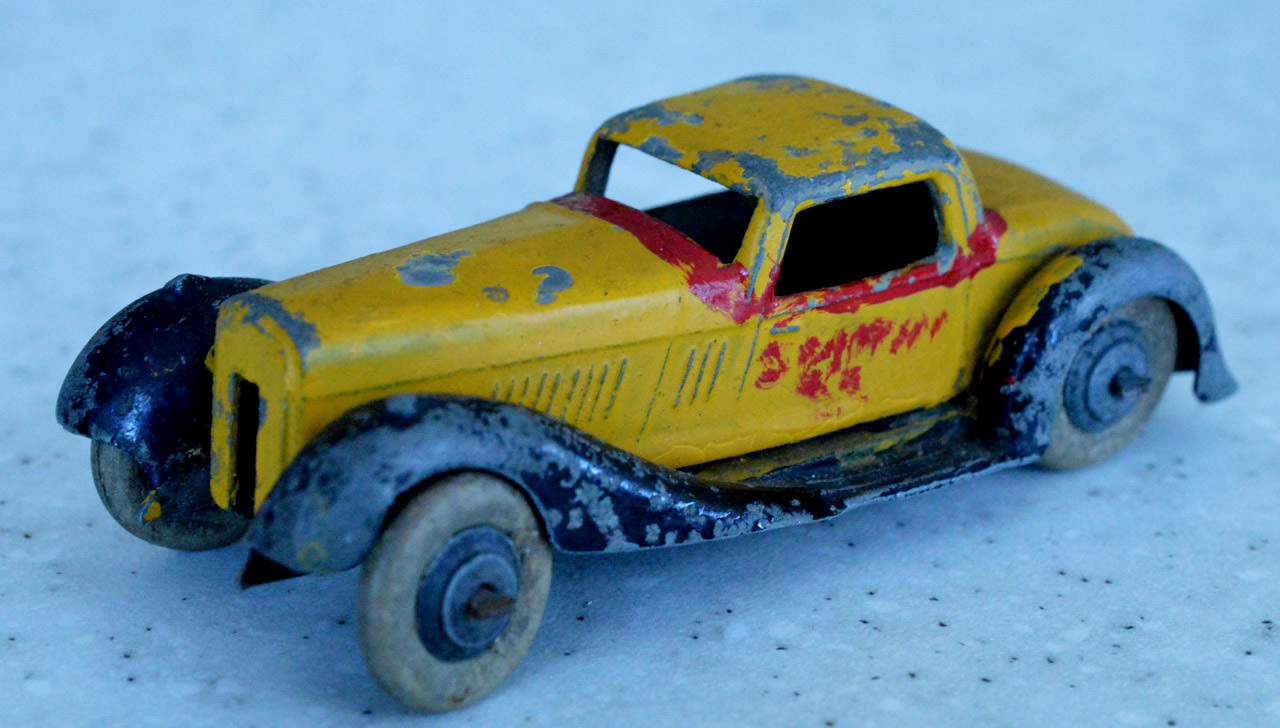 Overpainted missing radiator and headlamps, bent front fender, otherwise sound.