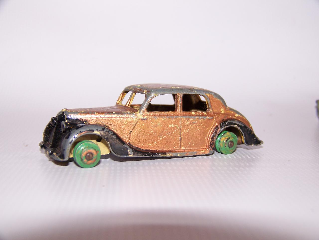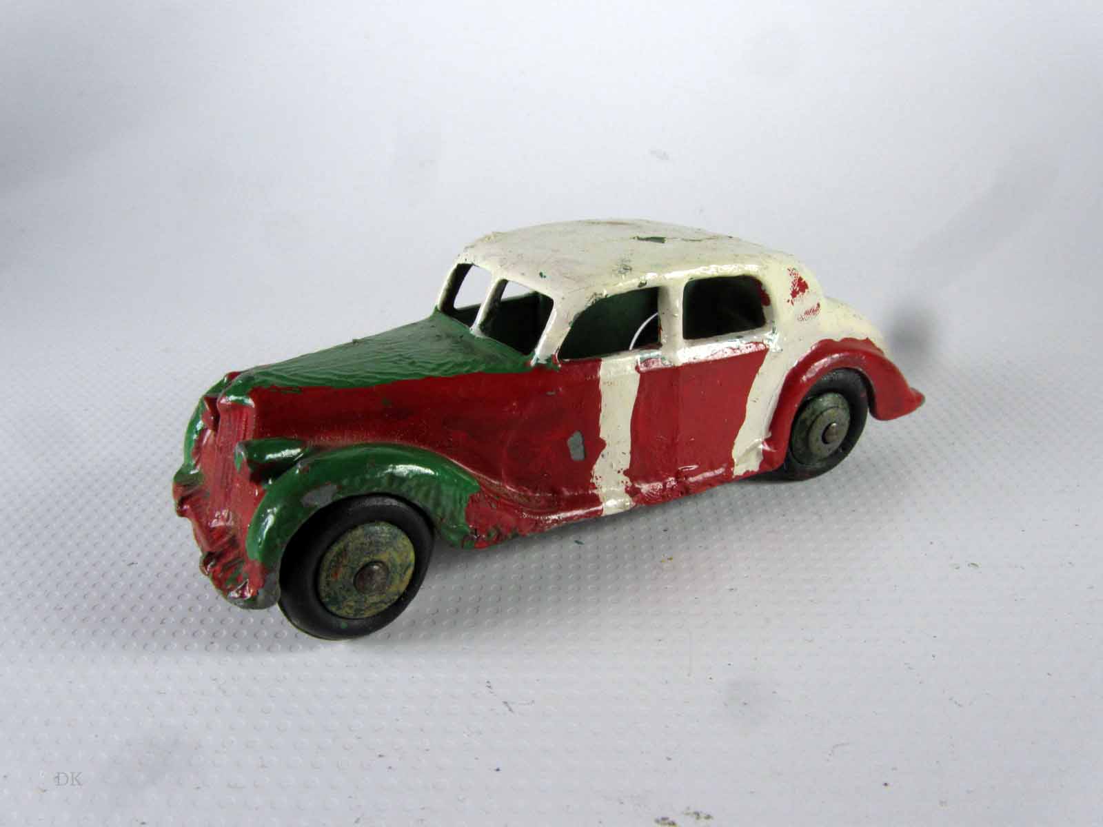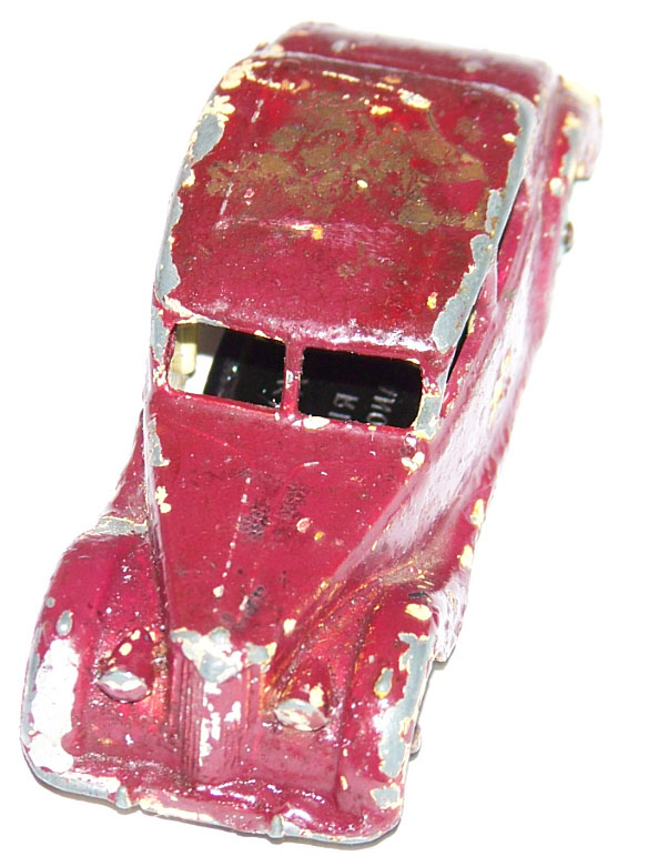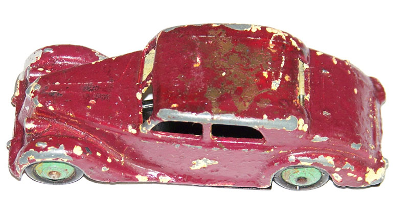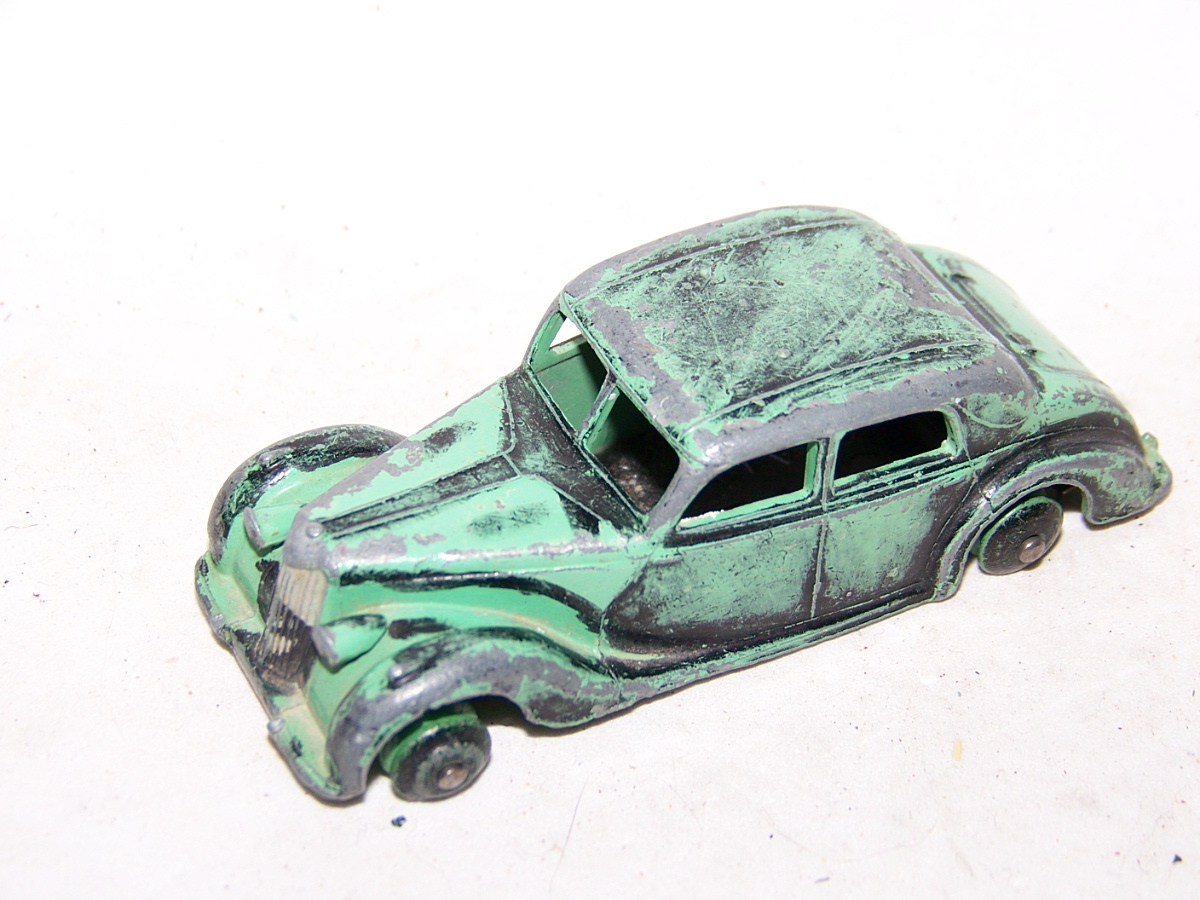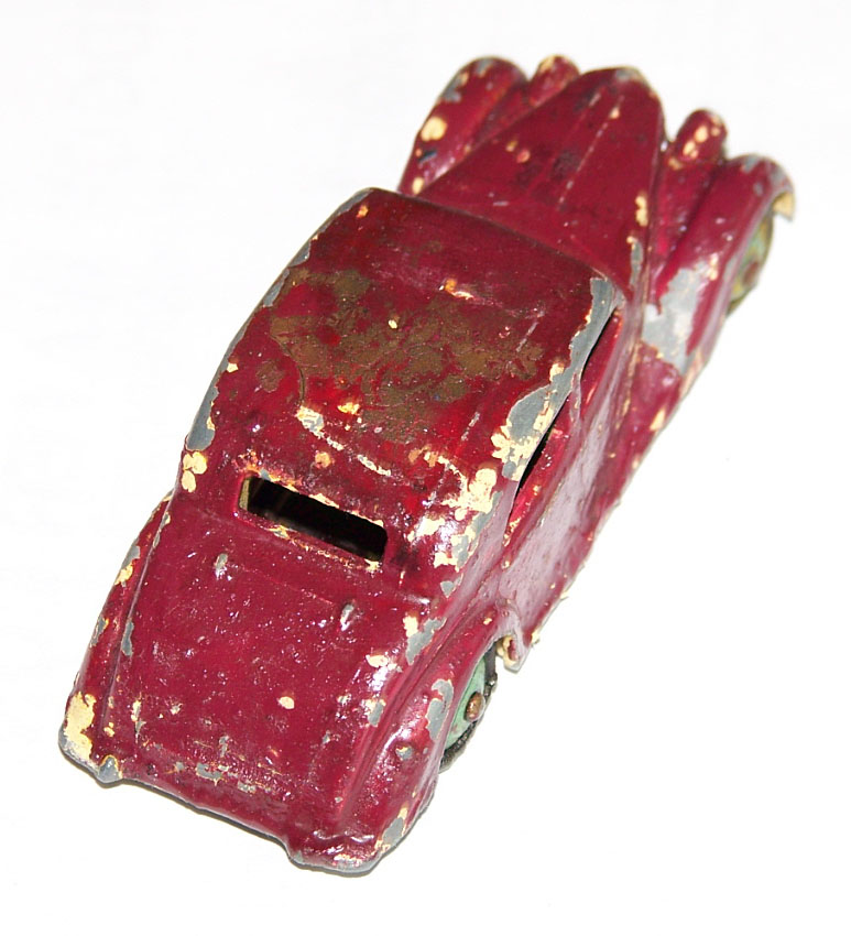i guess this one was dipped in old paint, what a mess, but otherwise an intact model. Following the same routine of stripping repairing and re-spraying I decided to finish this in burgundy. I already have one in the standard cream finish and if it ever were necessary to revert back to the original color it would be easy to do so. I think the new color to be quite a good choice for this particular model. Made by Dinky 1947-1960 this one 1950-1952.