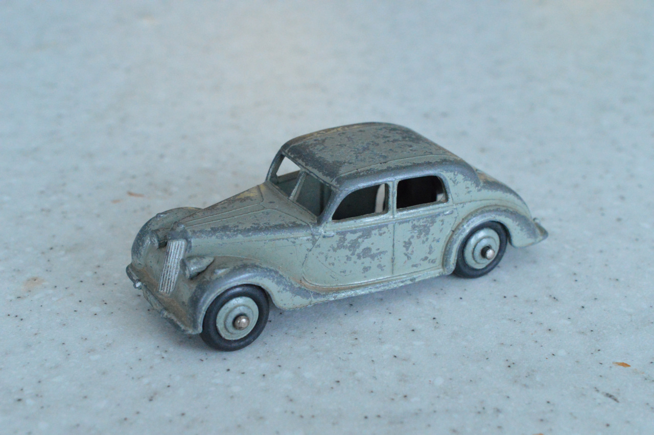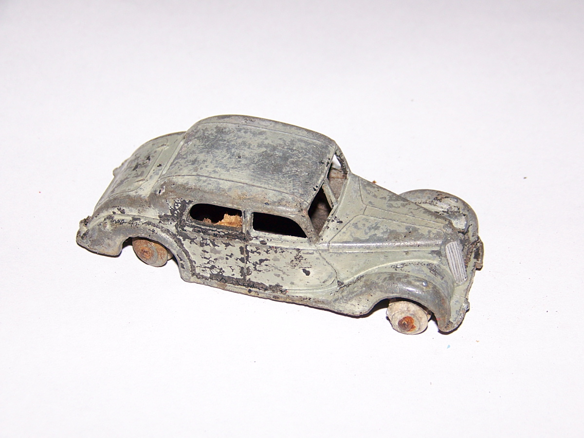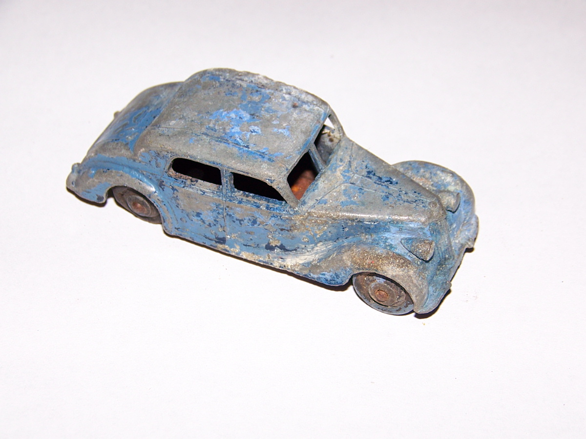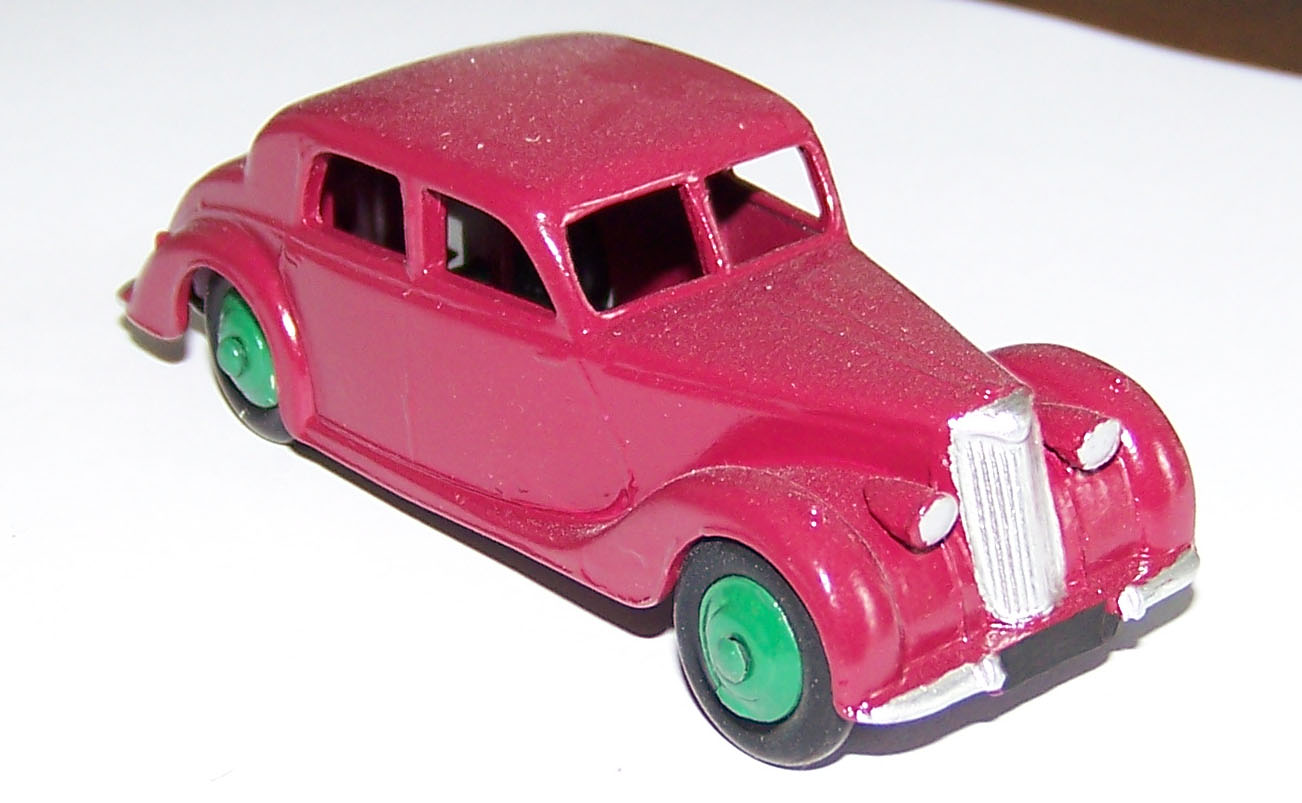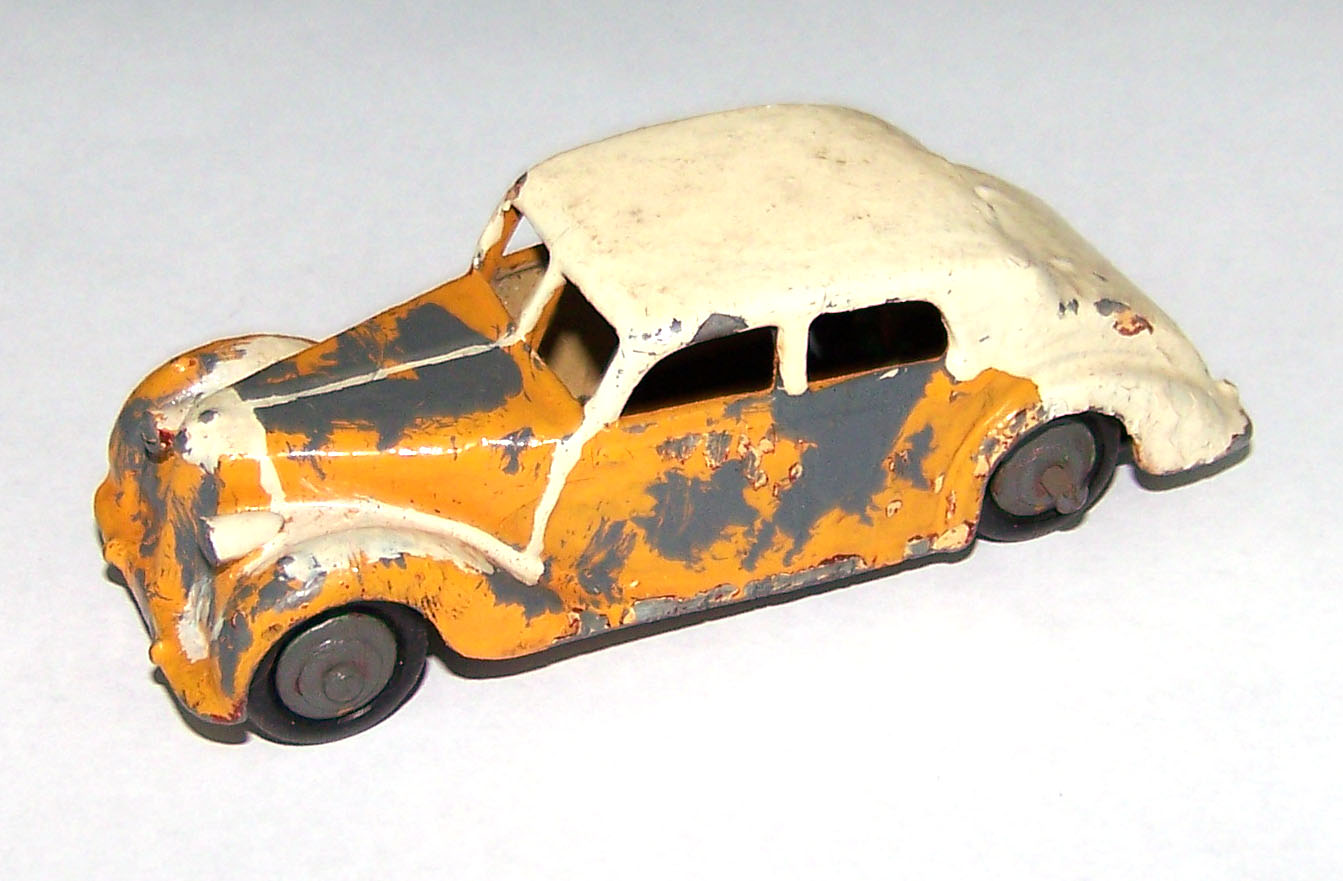 i guess this one was dipped in old paint, what a mess, but otherwise an intact model. Following the same routine of stripping repairing and re-spraying I decided to finish this in burgundy. I already have one in the standard cream finish and if it ever were necessary to revert back to the original color it would be easy to do so. I think the new color to be quite a good choice for this particular model. Made by Dinky 1947-1960 this one 1950-1952.