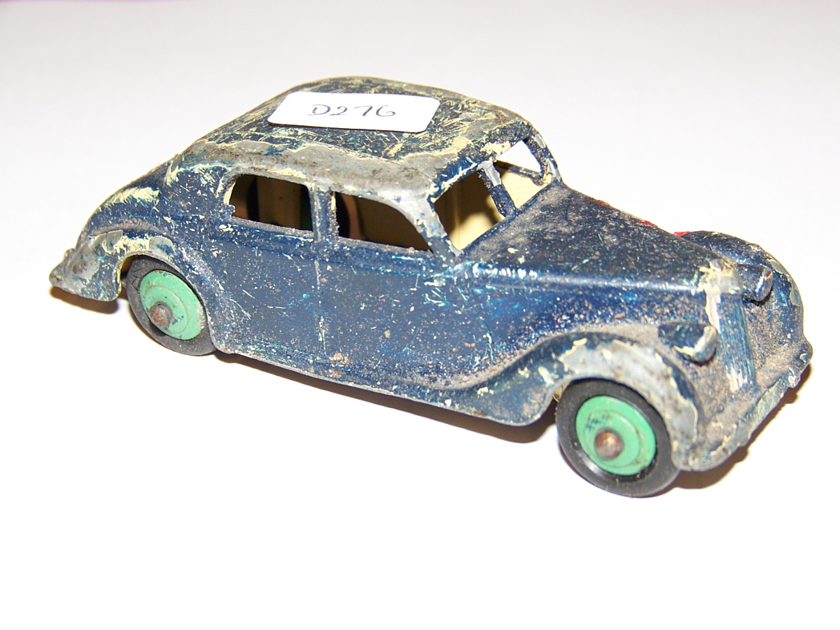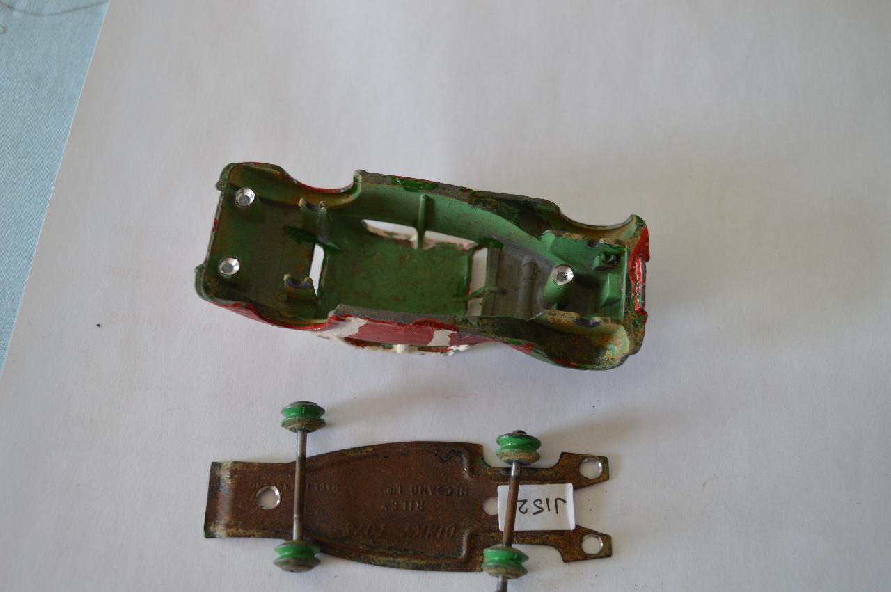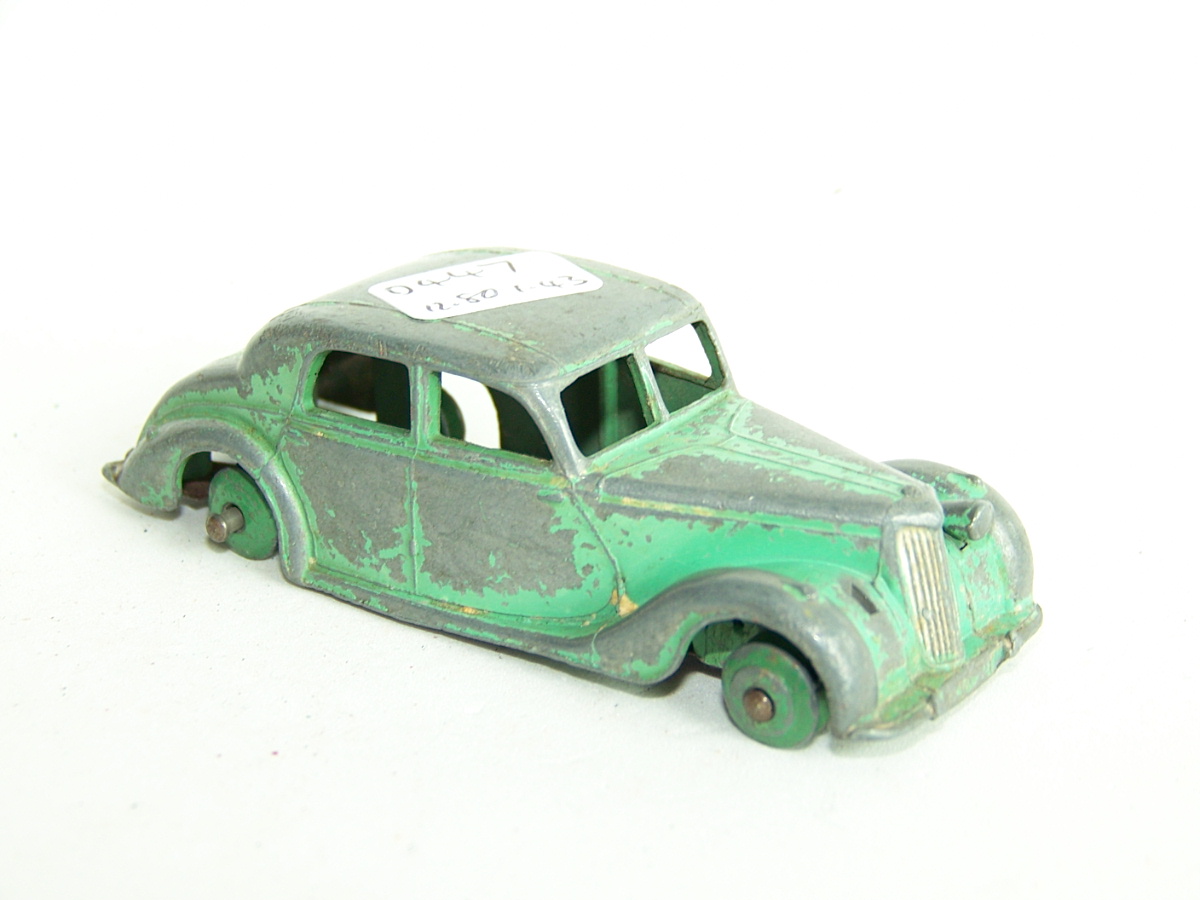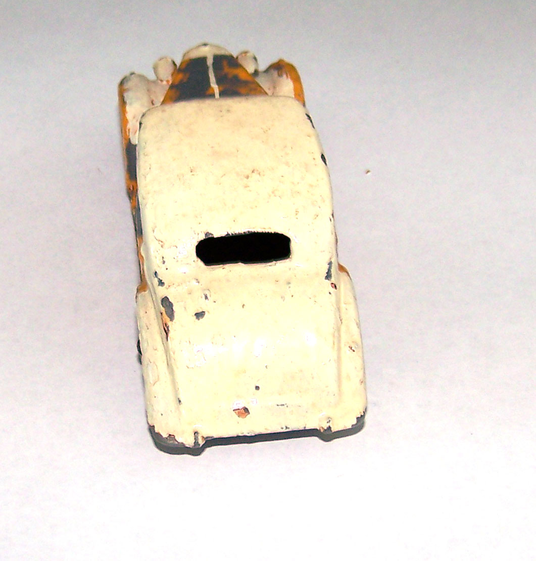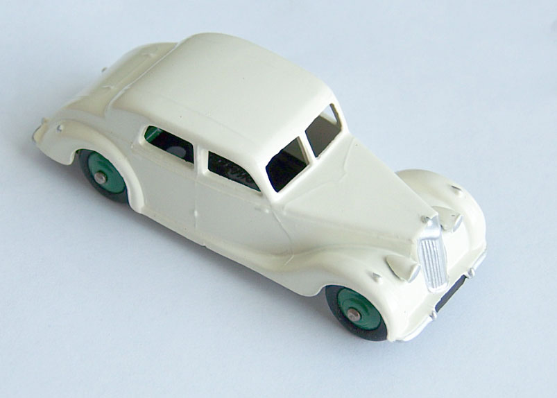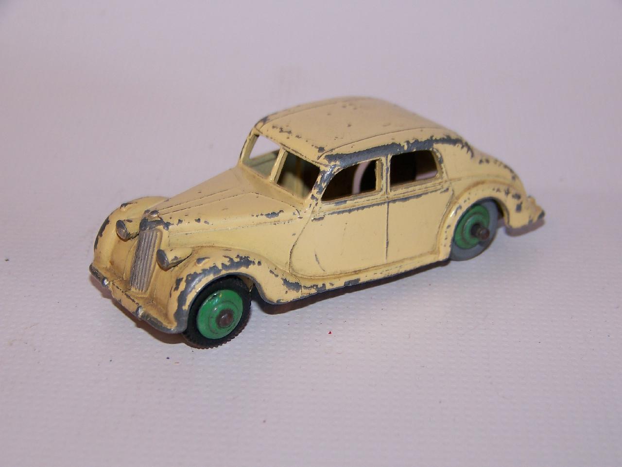 i guess this one was dipped in old paint, what a mess, but otherwise an intact model. Following the same routine of stripping repairing and re-spraying I decided to finish this in burgundy. I already have one in the standard cream finish and if it ever were necessary to revert back to the original color it would be easy to do so. I think the new color to be quite a good choice for this particular model. Made by Dinky 1947-1960 this one 1950-1952.