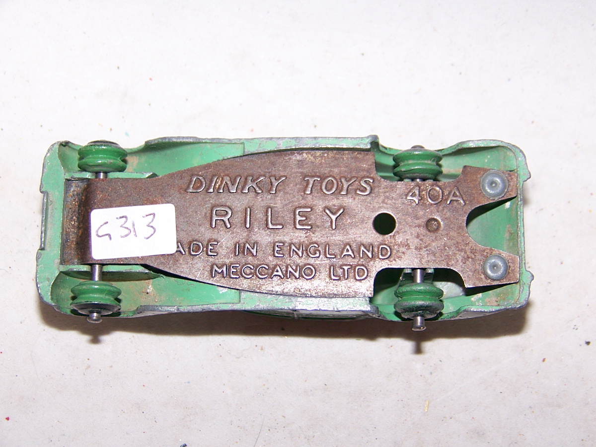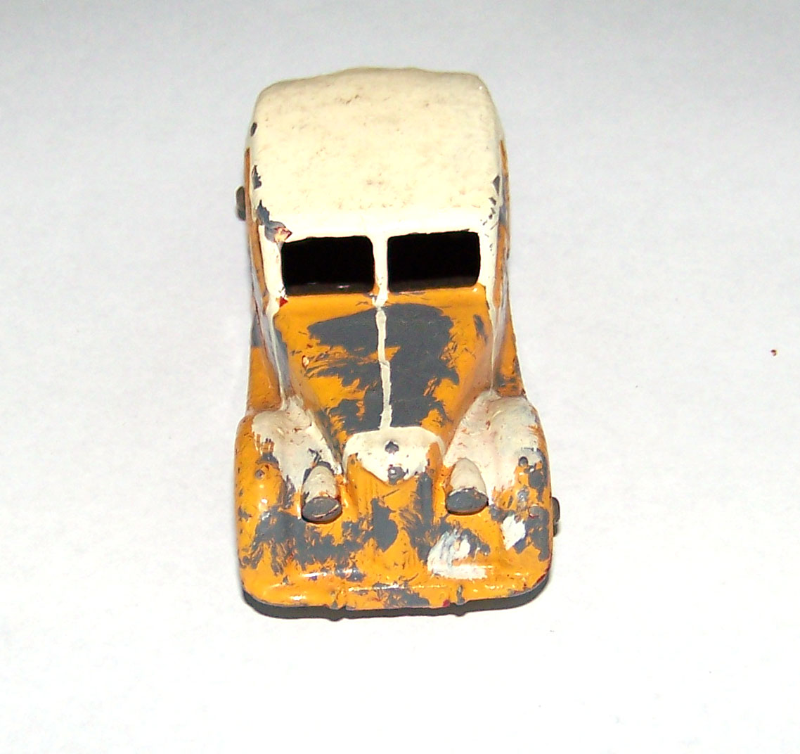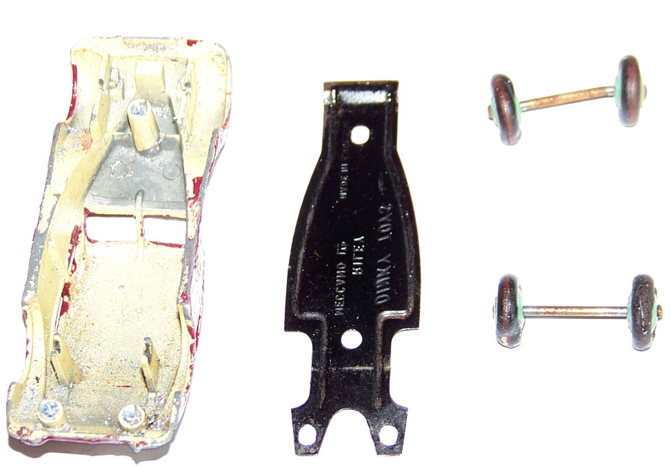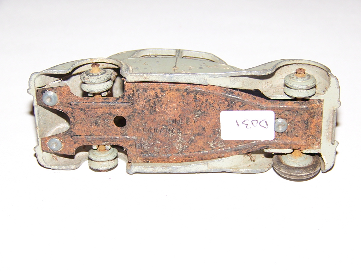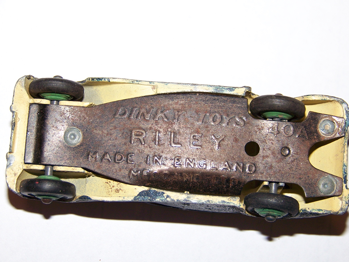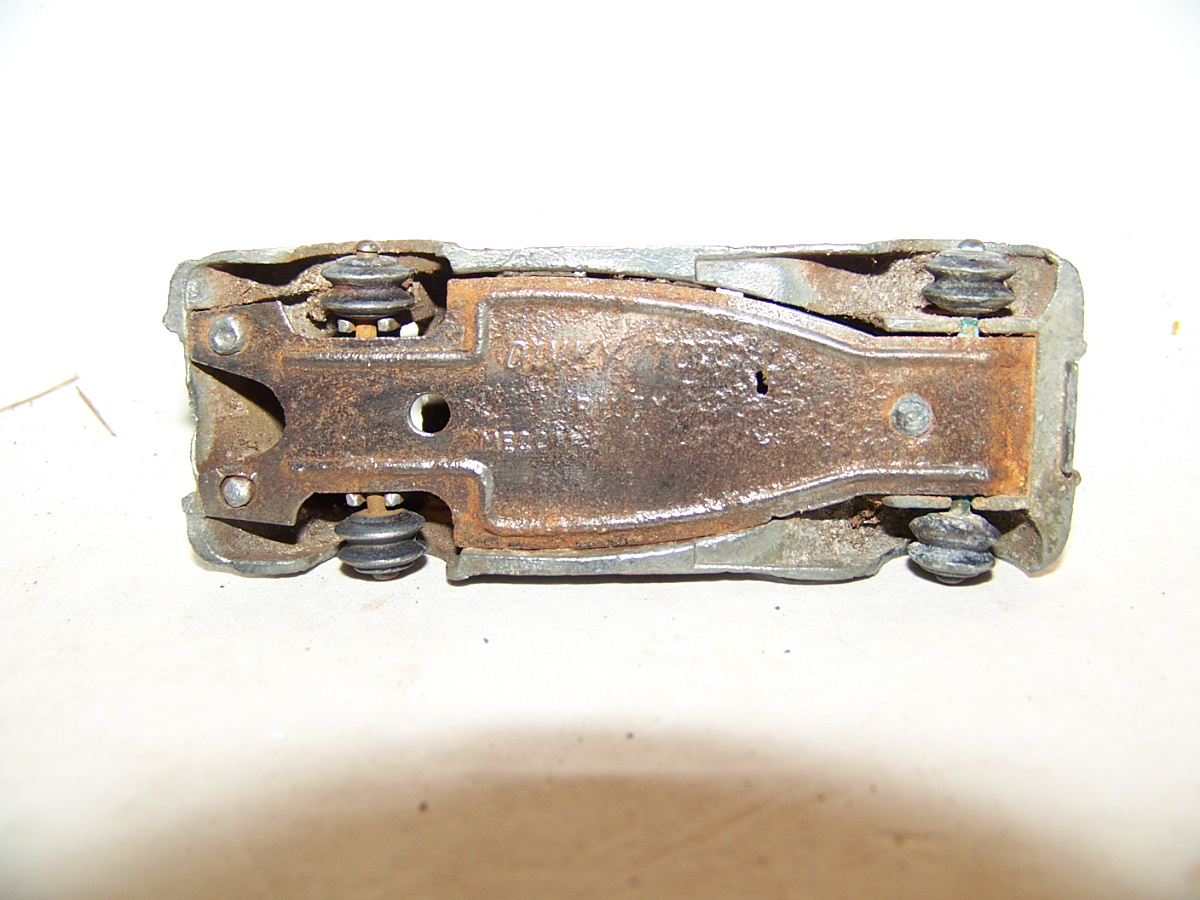 Poorly overpainted and with hardened tires this one was ripe for restoration. Strip down was quite straightforward with 3 rivets to drill out. The axles and wheels were independent and so this saves having to break the axle. The chassis was very clean on the inside with just a slight blemish on the bottom. The original color was cream with green hubs and the chassis had small lettering and no number which probably makes this an early model. The old paint was removed and the whole body shell given a fine wire brush and wire wool finish before a coat of white primer was added. This followed by some fine filler for minor scratches and three top coats on the body, three for the wheels and two for the chassis. Pre drilled holes, made during the strip down, were tapped for screws and the model was reassembled, one minor bend in one axle was straightened. New tires and trim paint added to complete the restoration
