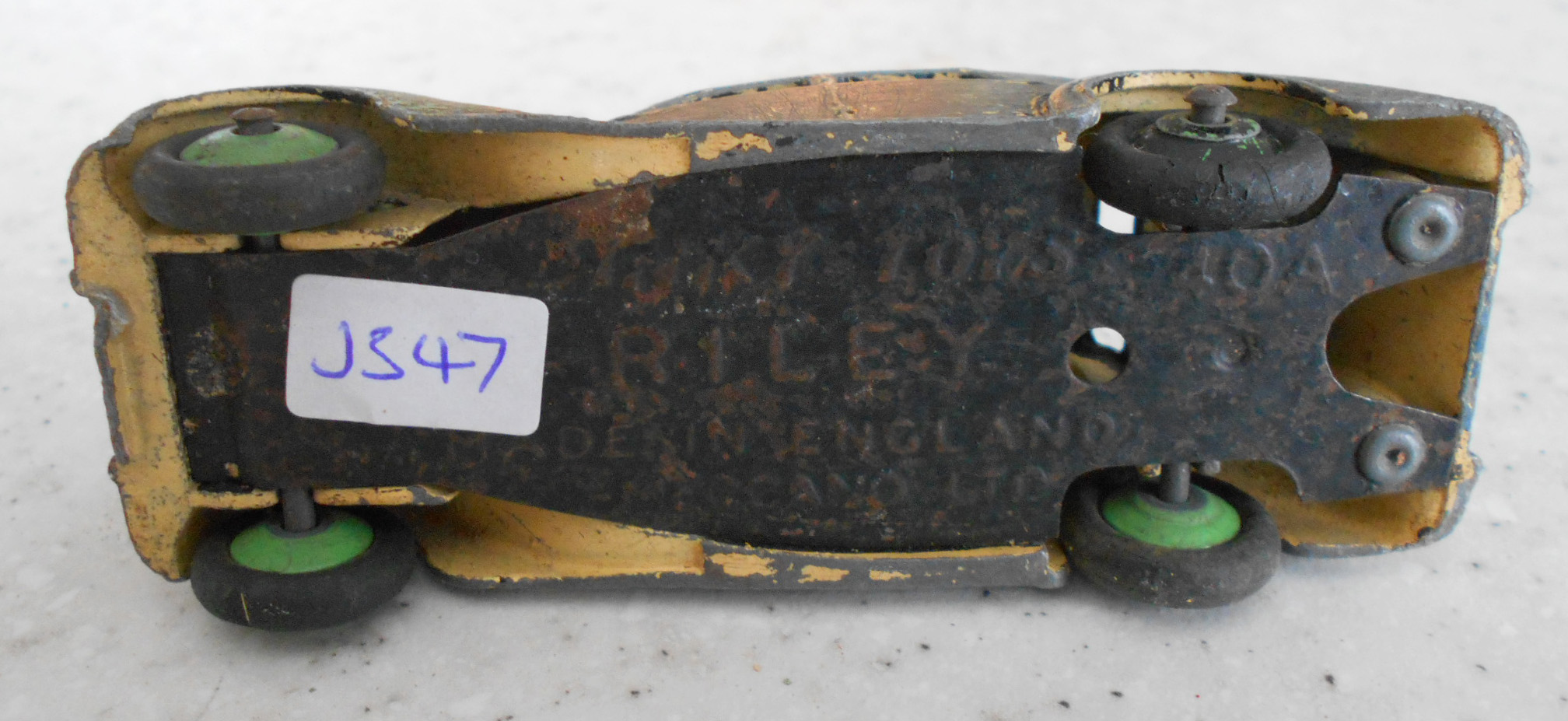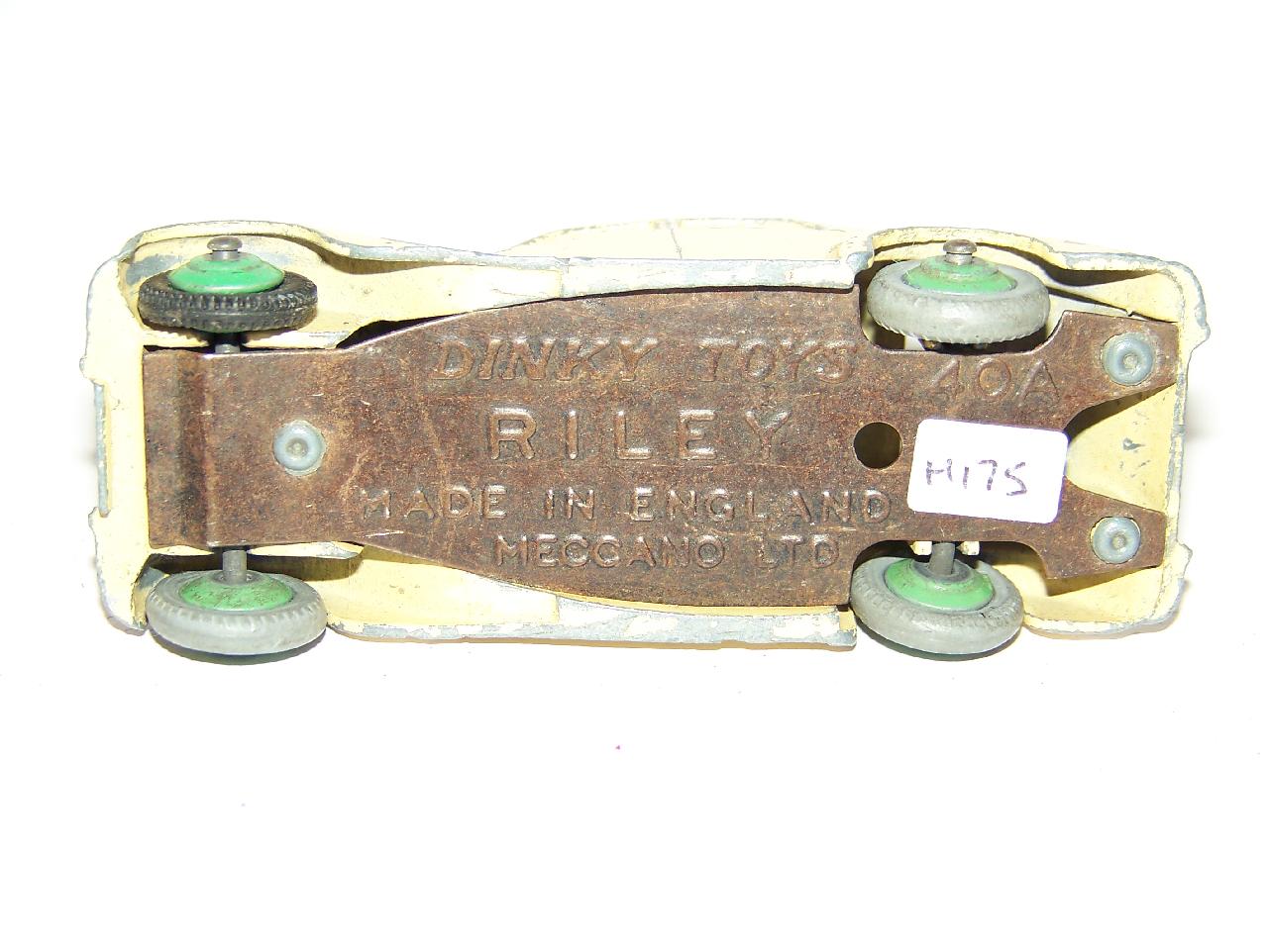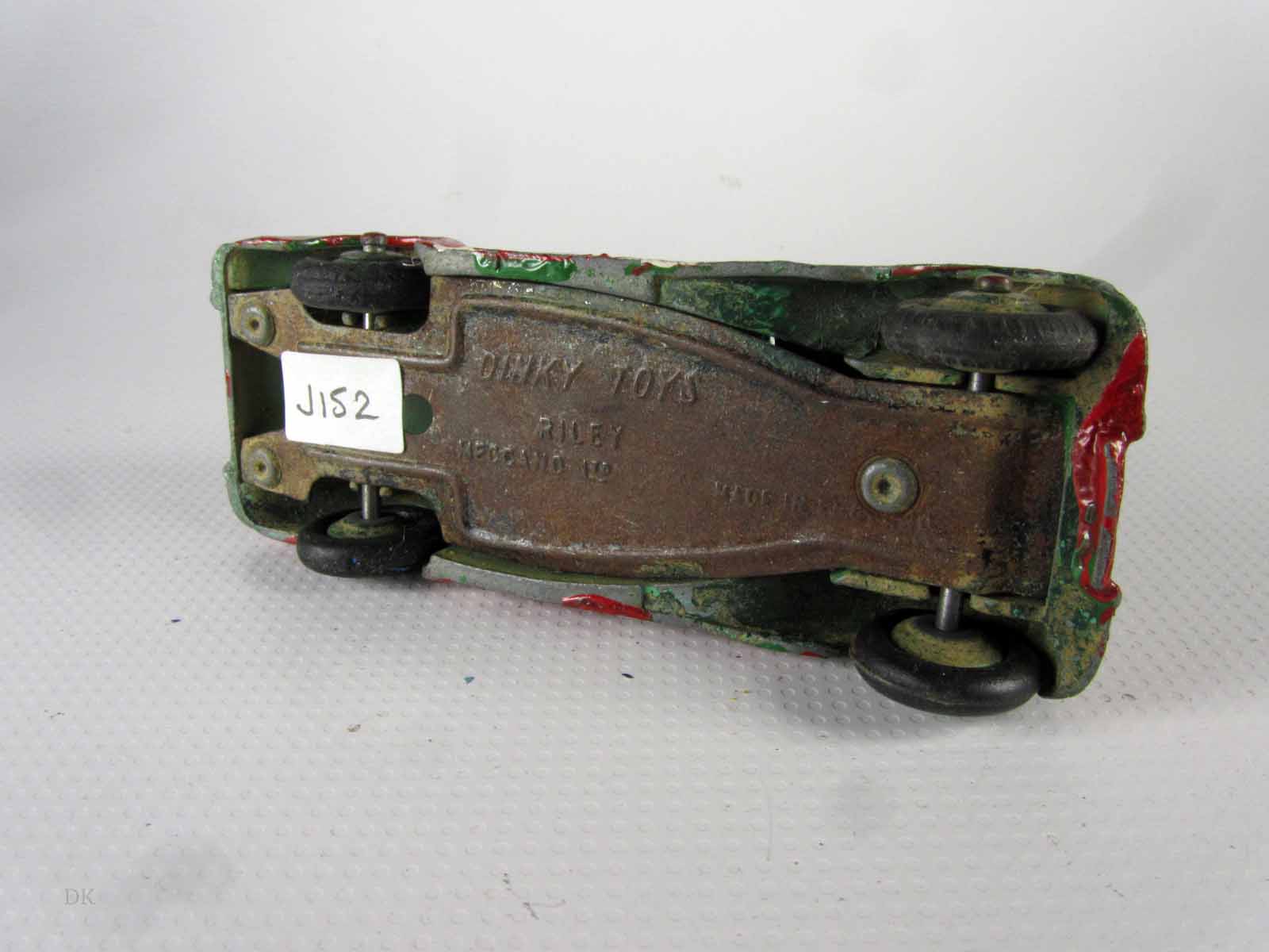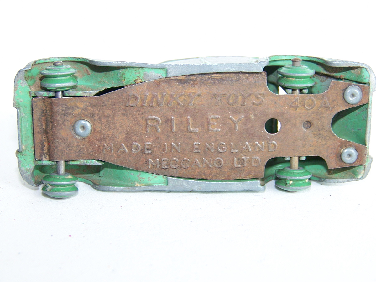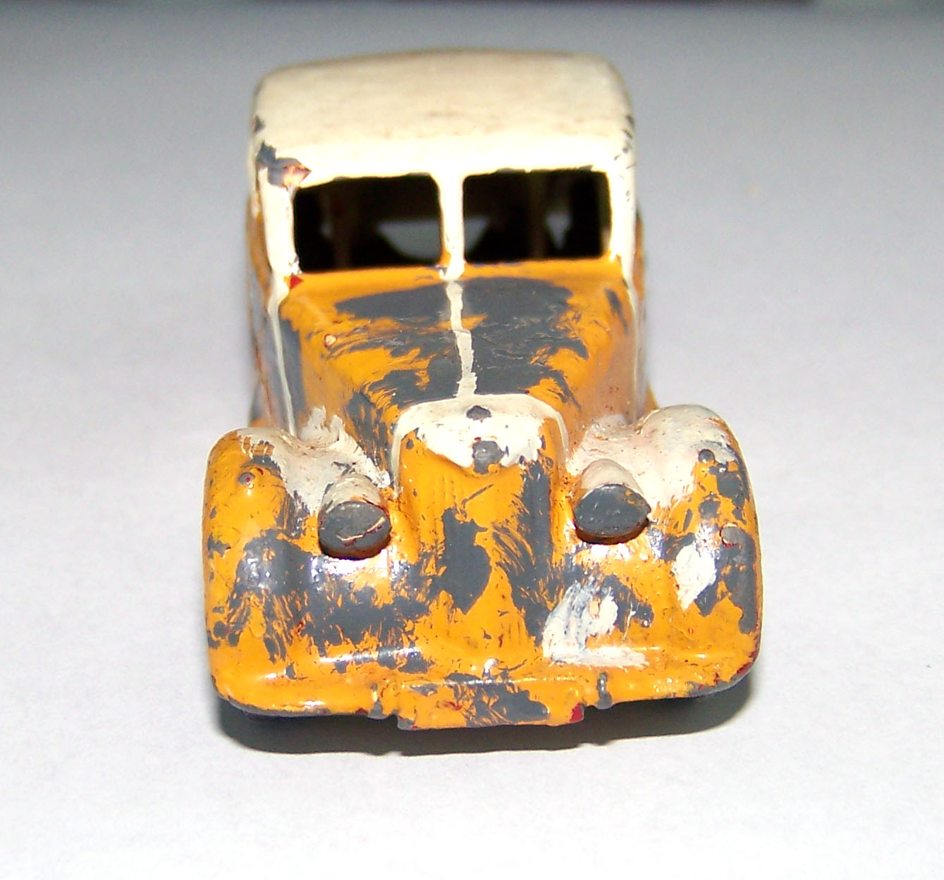 Poorly overpainted and with hardened tires this one was ripe for restoration. Strip down was quite straightforward with 3 rivets to drill out. The axles and wheels were independent and so this saves having to break the axle. The chassis was very clean on the inside with just a slight blemish on the bottom. The original color was cream with green hubs and the chassis had small lettering and no number which probably makes this an early model. The old paint was removed and the whole body shell given a fine wire brush and wire wool finish before a coat of white primer was added. This followed by some fine filler for minor scratches and three top coats on the body, three for the wheels and two for the chassis. Pre drilled holes, made during the strip down, were tapped for screws and the model was reassembled, one minor bend in one axle was straightened. New tires and trim paint added to complete the restoration